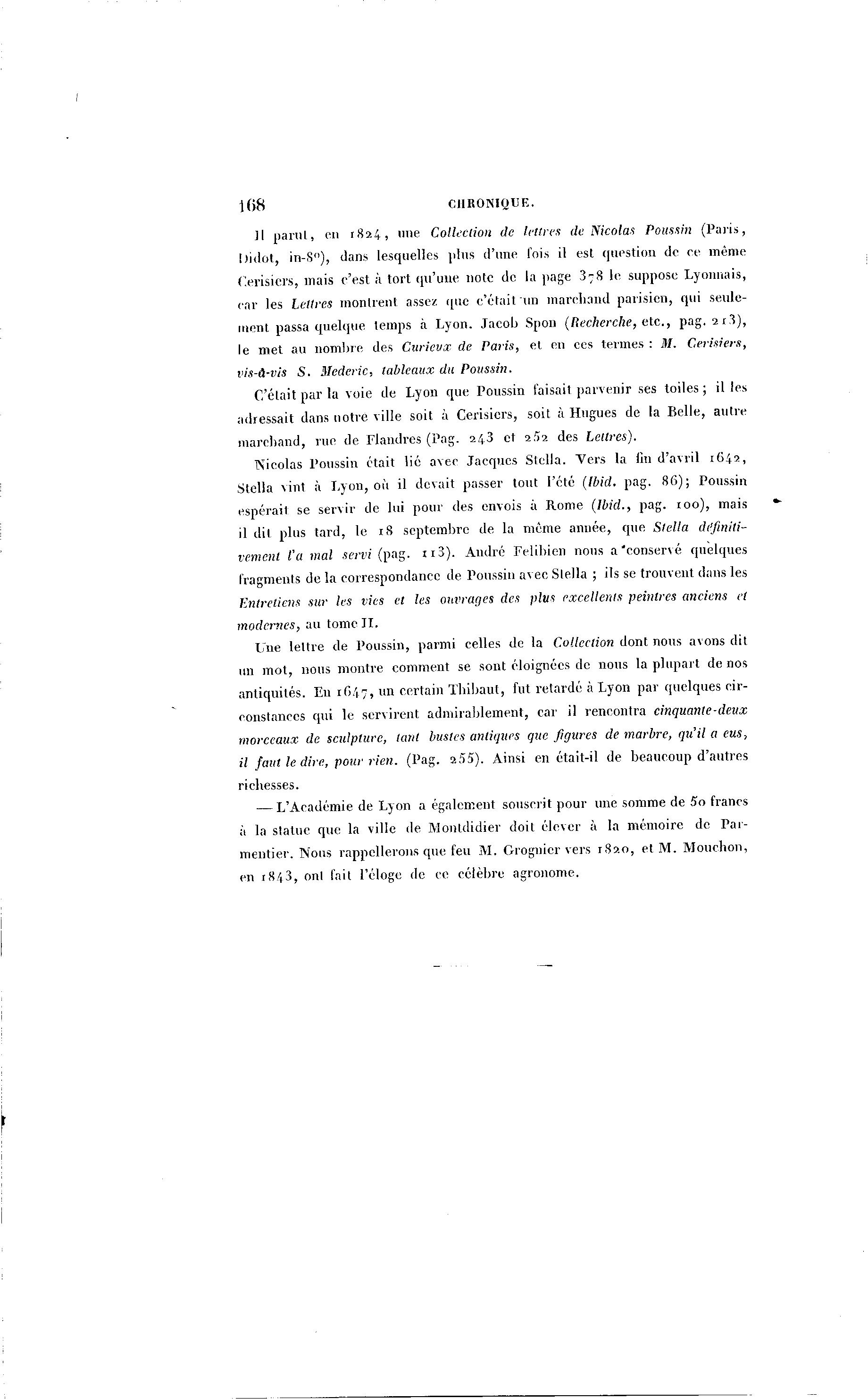 108 CHRONIQUE. ] | p a r u t , en r8?-4, une Collection de lettres de Nicolas Poussin (Paris, !)idot, in-S°), dans lesquelles plus d'une lois il est question de ce même Cerisiers, mais c'est à tort qu'une note de la page 3 - 8 le suppose Lyonnais, car les Lettres montrent assez que c'était un marchand parisien, qui seule- ment passa quelque temps à Lyon. Jacob Spon (Recherche, etc., pag. 2 i 3 ) , le met au nombre des Ciu-icvx de Paris, et en ces termes : M. Cerisiers, vis-à -vis S. Mederic, tableaux du Poussin. C'était par la voie de Lyon que Poussin taisait parvenir ses toiles; il les adressait dans notre ville soit à Cerisiers, soit à Hugues de la Belle, autre marchand, rue de Flandres (Pag. 24.3 et 2S2 des Lettres). Nicolas Poussin était lié avec Jacques Stella. "Vers la fin d'avril 1642, Stella vint à Lyon, où il devait passer tout l'été (Ibid. pag. 8 6 ) ; Poussin espérait se servir de lui pour des envois à Rome (Ibid., pag. 100), mais il dit plus tard, le 18 septembre de la même année, que Stella définiti- vement l'a mal servi (pag. 113). André Felibien nous a'eonservé quelques fragments de la correspondance de Poussin avec Stella ; ils se trouvent dans les Entretiens sur les vies et les ouvrages des plus excellents peintres anciens et modernes, au tome I I . Une lettre de Poussin, parmi celles de la Collection dont nous avons dit un mot, nous montre comment se sont éloignées de nous la plupart de nos antiquités. Eu 1647, un certain Thibaut, fut retardé à Lyon par quelques cir- constances qui le servirent admirablement, car il rencontra cinquante-deux morceaux de sculpture, tant bustes antiques que figures de marbre, qu'il a eus, il faut le dire, pour rien. (l'ag. 255). Ainsi en était-il de beaucoup d'autres richesses. — L'Académie de Lyon a également souscrit pour une somme de 5o francs à la statue que la ville de Monldidier doit élever à la mémoire de Par- mentier. Nous rappellerons que feu M. Grognicr vers 1820, et M. Mouchon, en t84 3 , ont fait l'éloge de ce célèbre agronome.