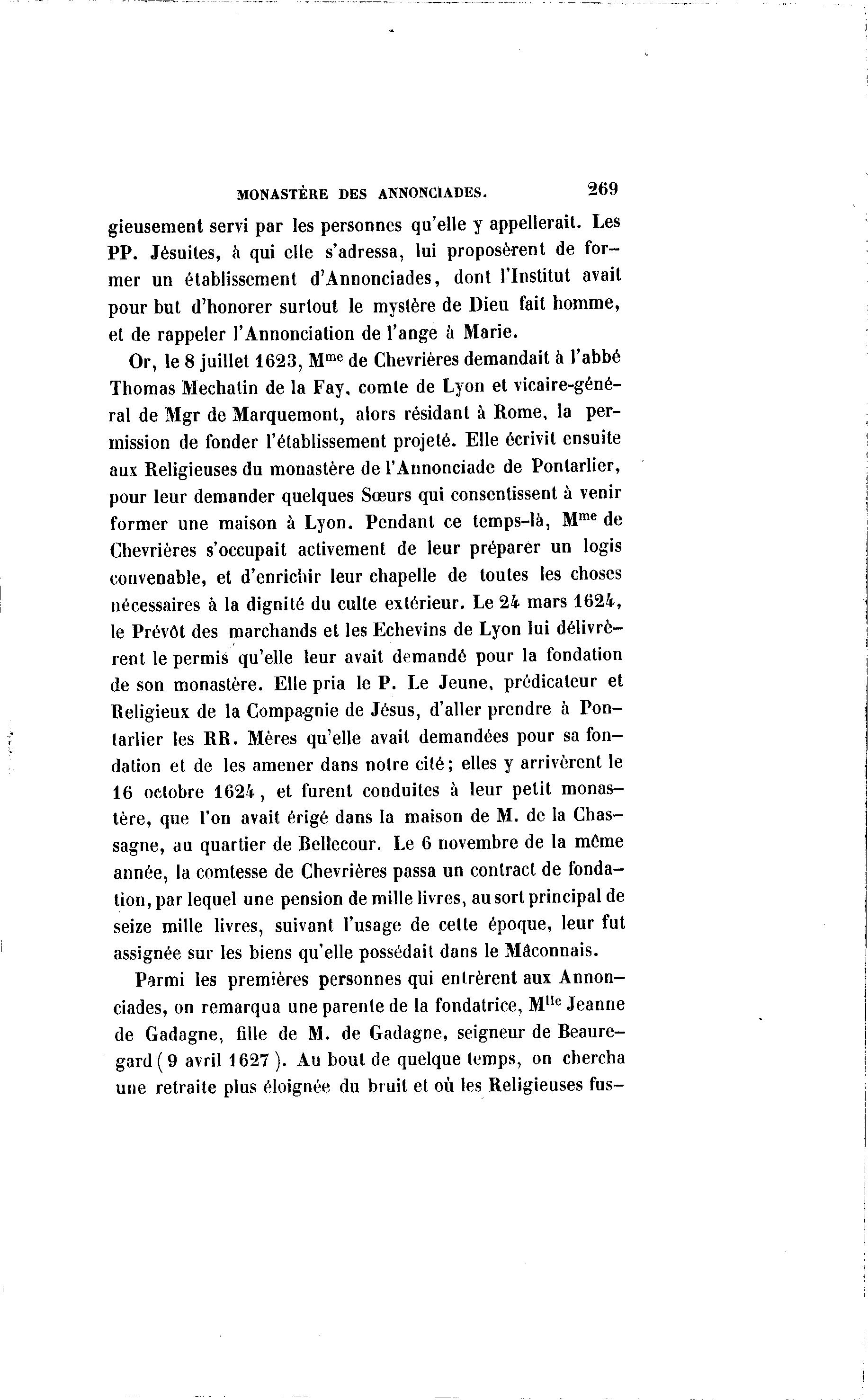 MONASTÈRE DES ANNONCIADES. 269 gieusement servi par les personnes qu'elle y appellerait. Les PP. Jésuites, h qui elle s'adressa, lui proposèrent de for- mer un établissement d'Annonciades, dont l'Institut avait pour but d'honorer surtout le mystère de Dieu fait homme, et de rappeler l'Annonciation de l'ange à Marie. Or, le 8 juillet 1623, Mme de Chevrières demandait à l'abbé Thomas Mechalin de la Fay, comte de Lyon et vicaire-géné- ral de Mgr de Marquemont, alors résidant à Rome, la per- mission de fonder l'établissement projeté. Elle écrivit ensuite aux Religieuses du monastère de l'Annonciade de Pontarlier, pour leur demander quelques Sœurs qui consentissent à venir former une maison à Lyon. Pendant ce temps-là , Mme de Chevrières s'occupait activement de leur préparer un logis convenable, et d'enrichir leur chapelle de toutes les choses nécessaires à la dignité du culte extérieur. Le 24 mars 1624, le Prévôt des marchands et les Echevins de Lyon lui délivrè- rent le permis qu'elle leur avait demandé pour la fondation de son monastère. Elle pria le P. Le Jeune, prédicateur et Religieux de la Compagnie de Jésus, d'aller prendre à Pon- tarlier les RR. Mères qu'elle avait demandées pour sa fon- dation et de les amener dans notre cité ; elles y arrivèrent le 16 octobre 1624, et furent conduites à leur petit monas- tère, que l'on avait érigé dans la maison de M. de la Chas- sagne, au quartier de Bellecour. Le 6 novembre de la même année, la comtesse de Chevrières passa un contract de fonda- tion, par lequel une pension de mille livres, au sort principal de seize mille livres, suivant l'usage de celle époque, leur fut assignée sur les biens qu'elle possédait dans le Maçonnais. Parmi les premières personnes qui entrèrent aux Annon- ciades, on remarqua une parente de la fondatrice, M lle Jeanne de Gadagne, fille de M. de Gadagne, seigneur de Beaure- gard(9 avril 1627 ). Au bout de quelque temps, on chercha une retraite plus éloignée du bruit et où les Religieuses fus-