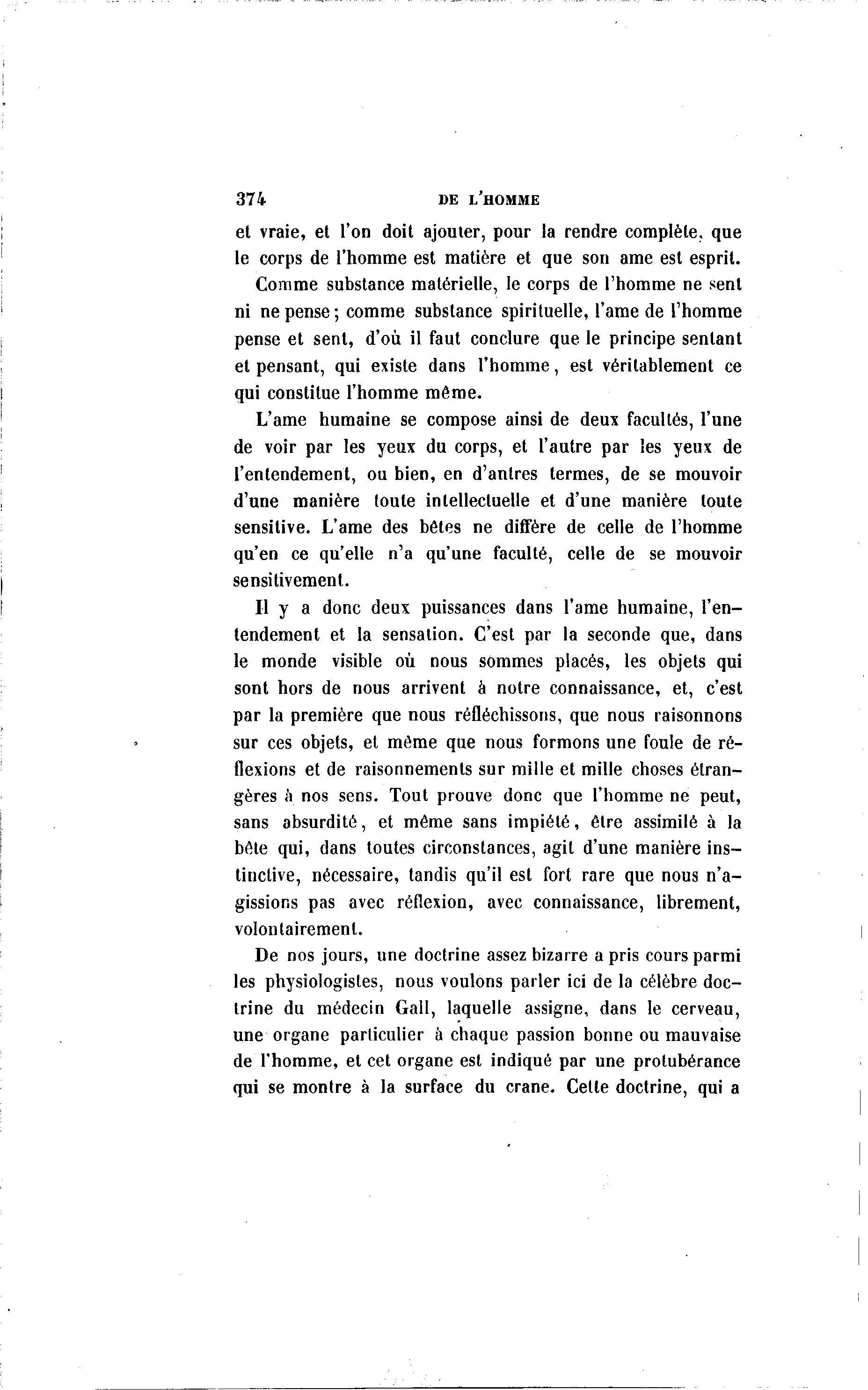 374 DE L'HOMME et vraie, et l'on doit ajouter, pour la rendre complète, que le corps de l'homme est matière et que son ame est esprit. Comme substance matérielle, le corps de l'homme ne sent ni ne pense; comme substance spirituelle, l'ame de l'homme pense et sent, d'où il faut conclure que le principe sentant et pensant, qui existe dans l'homme, est véritablement ce qui constitue l'homme même. L'ame humaine se compose ainsi de deux facultés, l'une de voir par les yeux du corps, et l'autre par les yeux de l'entendement, ou bien, en d'antres termes, de se mouvoir d'une manière toute intellectuelle et d'une manière toute sensitive. L'ame des bêtes ne diffère de celle de l'homme qu'en ce qu'elle n'a qu'une faculté, celle de se mouvoir sensitivemenl. Il y a donc deux puissances dans l'ame humaine, l'en- tendement et la sensation. C'est par la seconde que, dans le monde visible où nous sommes placés, les objets qui sont hors de nous arrivent à notre connaissance, et, c'est par la première que nous réfléchissons, que nous raisonnons sur ces objets, et même que nous formons une foule de ré- flexions et de raisonnements sur mille et mille choses étran- gères à nos sens. Tout prouve donc que l'homme ne peut, sans absurdité, et même sans impiété, être assimilé à la bête qui, dans toutes circonstances, agit d'une manière ins- tinctive, nécessaire, tandis qu'il est fort rare que nous n'a- gissions pas avec réflexion, avec connaissance, librement, volontairement. De nos jours, une doctrine assez bizarre a pris cours parmi les physiologistes, nous voulons parler ici de la célèbre doc- trine du médecin Gall, laquelle assigne, dans le cerveau, une organe particulier à chaque passion bonne ou mauvaise de l'homme, et cet organe est indiqué par une protubérance qui se montre à la surface du crâne. Cette doctrine, qui a