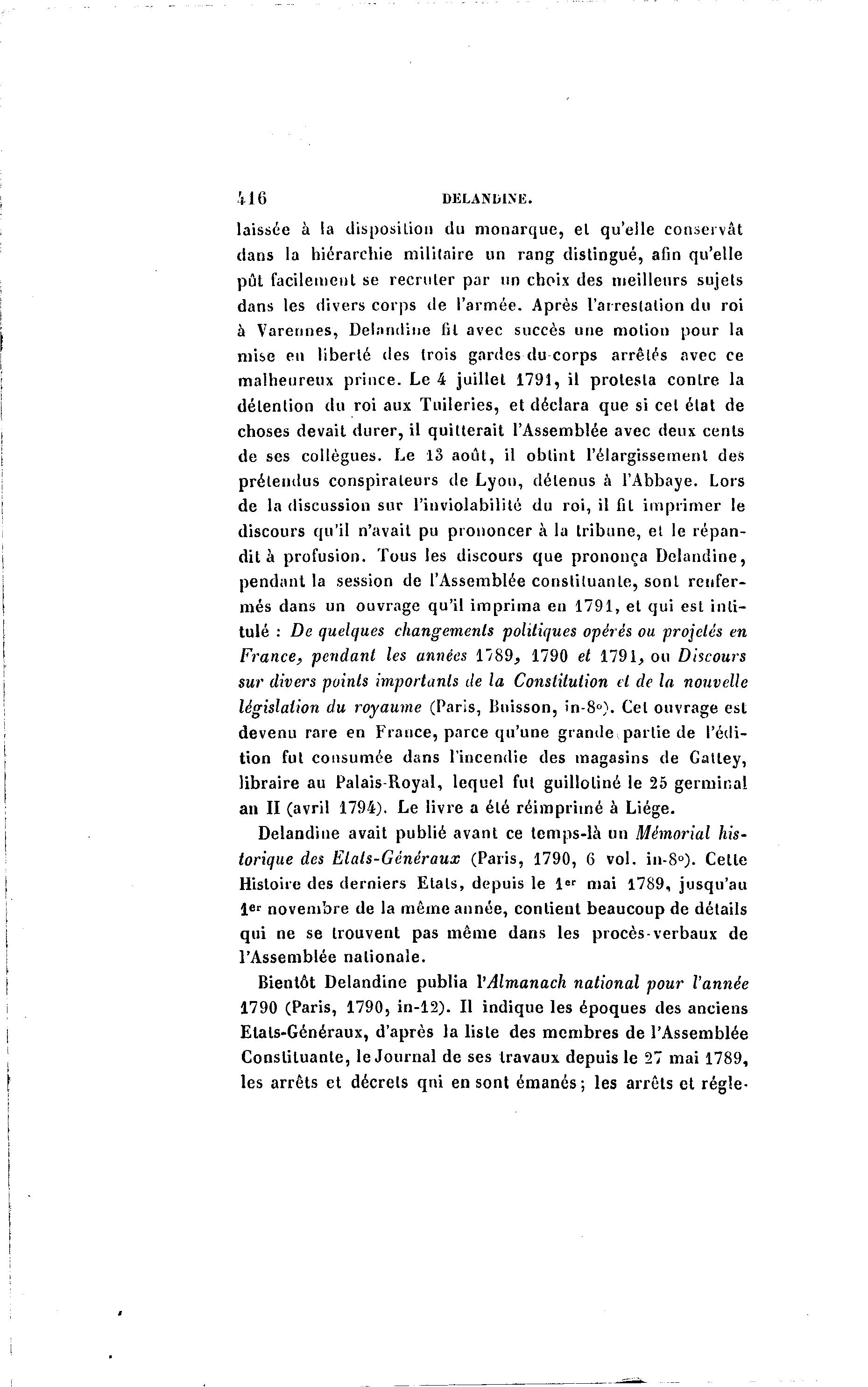 il 6 DELANMNE. laissée à la disposition du monarque, el qu'elle conservât dans la hiérarchie militaire un rang distingué, afin qu'elle pût facilement se recruter par un choix des meilleurs sujets dans les divers corps de l'armée. Après l'arreslalion du roi à Varennes, Delandine fil avec succès une motion pour la mise en liberté des trois gardes du corps arrêlés avec ce malheureux prince. Le 4 juillet 1791, il protesta conlre la détention du roi aux Tuileries, et déclara que si cel état de choses devait durer, il quitterait l'Assemblée avec deux cents de ses collègues. Le 13 août, il obtint l'élargissement des prétendus conspirateurs de Lyon, détenus à l'Abbaye. Lors de la discussion sur l'inviolabilité du roi, il fil imprimer le discours qu'il n'avait pu prononcer à la tribune, et le répan- dit à profusion. Tous les discours que prononça Delandine, pendant la session de l'Assemblée constituante, sont renfer- més dans un ouvrage qu'il imprima en 1791, et qui est inti- tulé : De quelques changements politiques opérés ou projetés en France, pendant les années 1789, 1790 et 1791, ou Discours sur divers points importanls de la Constitution el de la nouvelle législation du royaume (Paris, Buisson, in-8°). Cel ouvrage est devenu rare en France, parce qu'une grande > partie de l'édi- tion fui consumée dans l'incendie des magasins de Gatley, libraire au Palais Royal, lequel fut guillotiné le 25 germinal an II (avril 1794). Le livre a élé réimprimé à Liège. Delandine avait publié avant ce temps-là un Mémorial his- torique des Elals-Généraux (Paris, 1790, 6 vol. in-8°). Celle Histoire des derniers Etals, depuis le 1 e r mai 1789, jusqu'au 1er novembre de la même année, contient beaucoup de détails qui ne se trouvent pas même dans les procès-verbaux de l'Assemblée nationale. Bientôt Delandine publia VAlmanach national pour l'année 1790 (Paris, 1790, in-12). Il indique les époques des anciens Etals-Généraux, d'après la lisle des membres de l'Assemblée Constituante, le Journal de ses travaux depuis le 27 mai 1789, les arrêts et décrets qni en sont é m a n é s ; les arrêts et régie-