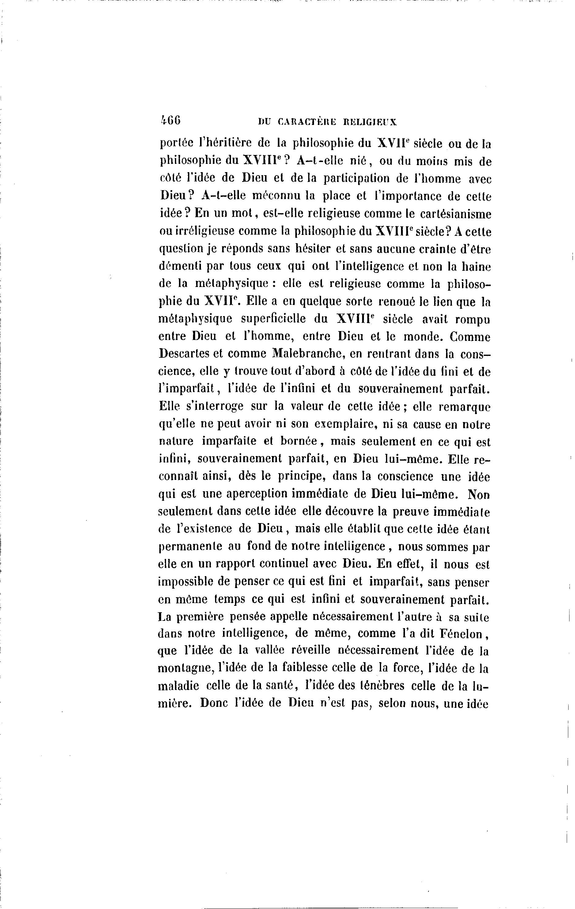 4G6 X)U CARACTKllË IilîLIGIEUX portée l'héritière de la philosophie du XVIIe siècle ou de la philosophie du XVIIIe? A-t-eile nié, ou du moins mis de côté l'idée de Dieu et de la participation de l'homme avec Dieu? A-t-elle méconnu la place et l'importance de cette idée? En un mot, est-elle religieuse comme le cartésianisme ou irréligieuse comme la philosophie du XVIIIe siècle? A celte question je réponds sans hésiter et sans aucune crainte d'être démenti par tous ceux qui ont l'intelligence et non la haine de la métaphysique : elle est religieuse comme la philoso- phie du XVIF. Elle a en quelque sorte renoué le lien que la métaphysique superficielle du XVIIIe siècle avait rompu entre Dieu et l'homme, entre Dieu et le monde. Comme Descartes et comme Malebranche, en rentrant dans la cons- cience, elle y trouve tout d'abord à côté de l'idée du fini et de l'imparfait, l'idée de l'infini et du souverainement parfait. Elle s'interroge sur la valeur de celte idée ; elle remarque qu'elle ne peut avoir ni son exemplaire, ni sa cause en notre nature imparfaite et bornée, mais seulement en ce qui est infini, souverainement parfait, en Dieu lui-môme. Elle re- connaît ainsi, dès le principe, dans la conscience une idée qui est une aperceplion immédiate de Dieu lui-môme. Non seulement dans celle idée elle découvre la preuve immédiate de l'existence de Dieu, mais elle établit que cette idée étant permanente au fond de notre intelligence , nous sommes par elle en un rapport continuel avec Dieu. En effet, il nous est impossible de penser ce qui est fini et imparfait, sans penser en môme temps ce qui est infini et souverainement parfait. La première pensée appelle nécessairement l'autre à sa suite dans notre intelligence, de même, comme l'a dit Fénelon, que l'idée de la vallée réveille nécessairement l'idée de la montagne, l'idée de la faiblesse celle de la force, l'idée de la maladie celle de la santé, l'idée des ténèbres celle de la lu- mière. Donc l'idée de Dieu n'est pas, selon nous, une idée