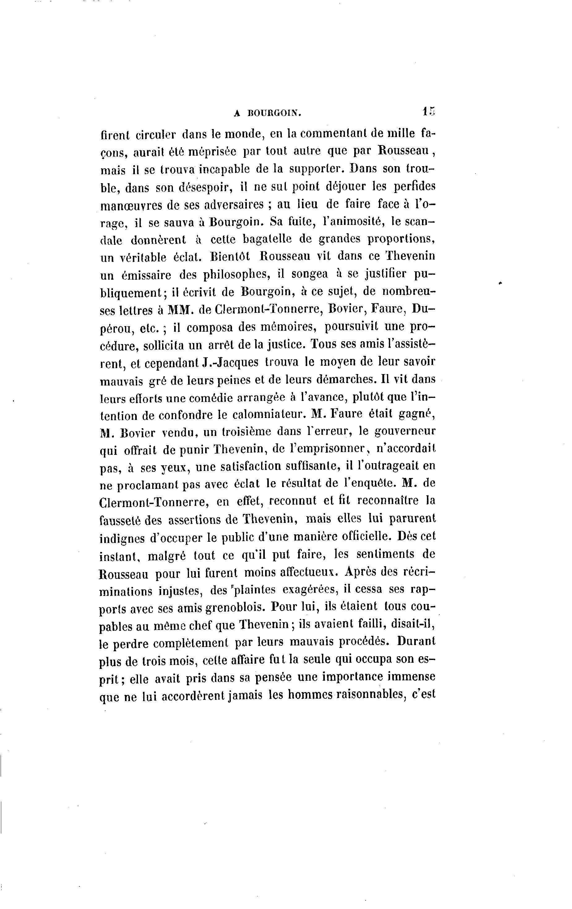 A BOURGOIN'. 15 firent circuler dans le monde, en la commentant de mille fa- çons, aurait été méprisée par tout autre que par Rousseau , mais il se trouva incapable de la supporter. Dans son trou- ble, dans son désespoir, il ne sut point déjouer les perfides manœuvres de ses adversaires ; au lieu de faire face à l'o- rage, il se sauva à Bourgoin. Sa fuite, l'animosité, le scan- dale donnèrent à cette bagatelle de grandes proportions, un véritable éclat. Bientôt Rousseau vit dans ce Thevenin un émissaire des philosophes, il songea à se justifier p u - bliquement; il écrivit de Bourgoin, à ce sujet, de nombreu- ses lettres à MM. de Clermont-Tonnerre, Bovier, Faure, Du- pérou, etc. ; il composa des mémoires, poursuivit une pro- cédure, sollicita un arrêt de la justice. Tous ses amis l'assistè- rent, et cependant J.-Jacques trouva le moyen de leur savoir mauvais gré de leurs peines et de leurs démarches. Il vit dans leurs efforts une comédie arrangée à l'avance, plutôt que l'in- tention de confondre le calomniateur. M. Faure était gagné, M. Bovier vendu, un troisième dans l'erreur, le gouverneur qui offrait de punir Thevenin, de l'emprisonner, n'accordait pas, à ses yeux, une satisfaction suffisante, il l'outrageait en ne proclamant pas avec éclat le résultat de l'enquête. M. de Clermont-Tonnerre, en effet, reconnut et fit reconnaître la fausseté des assertions de Thevenin, mais elles lui parurent indignes d'occuper le public d'une manière officielle. Dès cet instant, malgré tout ce qu'il put faire, les sentiments de Rousseau pour lui furent moins affectueux. Après des récri- minations injustes, des "plaintes exagérées, il cessa ses rap- ports avec ses amis grenoblois. Pour lui, ils étaient tous cou- pables au même chef que Thevenin ; ils avaient failli, disait-il, le perdre complètement par leurs mauvais procédés. Durant plus de trois mois, celte affaire fut la seule qui occupa son es- prit ; elle avait pris dans sa pensée une importance immense que ne lui accordèrent jamais les hommes raisonnables, c'est
