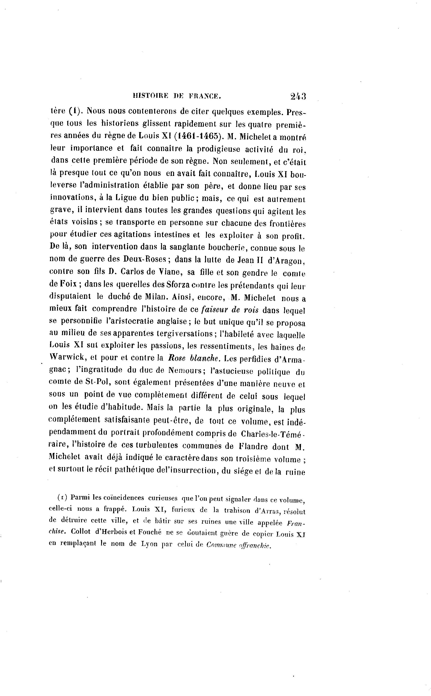 HISTOIRE I)K FRANCE. 243 tère (1). Nous nous contenterons de citer quelques exemples. Pres- que tous les historiens glissent rapidement sur les quatre premiè- res années du règne de Louis XI (1461-1465). M. Michelet a montré leur importance et fait connaître la prodigieuse activité du roi, dans cette première période de son règne. Non seulement, et c'était là presque tout ce qu'on nous en avait fait connaître, Louis XI bou- leverse l'administration établie par son père, et donne lieu par ses innovations, à la Ligue du bien public; mais, ce qui est autrement grave, il intervient dans toutes les grandes questions qui agitent les états voisins ; se transporte en personne sur chacune des frontières pour étudier ces agitations intestines et les exploiter à son profit. De là , son intervention dans la sanglante boucherie, connue sous le nom de guerre des Deux-Roses ; dans la lutte de Jean II d'Aragon, contre son fils D. Carlos de Viane, sa fille et son gendre le comte de Foix ; dans les querelles des Sforza contre les prétendants qui leur disputaient le duché de Milan. Ainsi, encore, M. Michelet nous a mieux fait comprendre l'histoire de ce faiseur de rois dans lequel se personnifie l'aristocratie anglaise; le but unique qu'il se proposa au milieu de ses apparentes tergiversations; l'habileté avec laquelle Louis XI sut exploiter les passions, les ressentiments, les haines de Warwick, et pour et contre la Rose blanche. Les perfidies d'Arma gnac; l'ingratitude du due de Nemours; l'astucieuse politique du comte de St-Pol, sont également présentées d'une manière neuve et sous un point de vue complètement différent de celui sous lequel on les étudie d'habitude. Mais la partie la plus originale, la plus complètement satisfaisante peut-être, de tout ce volume, est indé- pendamment du portrait profondément compris de Charles-le-Témé- raire, l'histoire de ces turbulentes communes de Flandre dont M. Michelet avait déjà indiqué le caractère dans son troisième volume ; et surtout le récit pathétique del'insurrection, du siège el de la ruine (i) Parmi les coïncidences curieuses que l'on peut signaler'tans ce volume, celle-ci nous a frappé. Louis XI, furieux de la trahison d'Ârras, résolut de détruire cette ville, et de bâtir sur ses ruines une ville appelée Fran- chise. Collot d'Herbois et Fouché ne se doutaient guère de copier Louis XI en remplaçant le nom de Lyon par celui de Cnmr.nme affranchie.