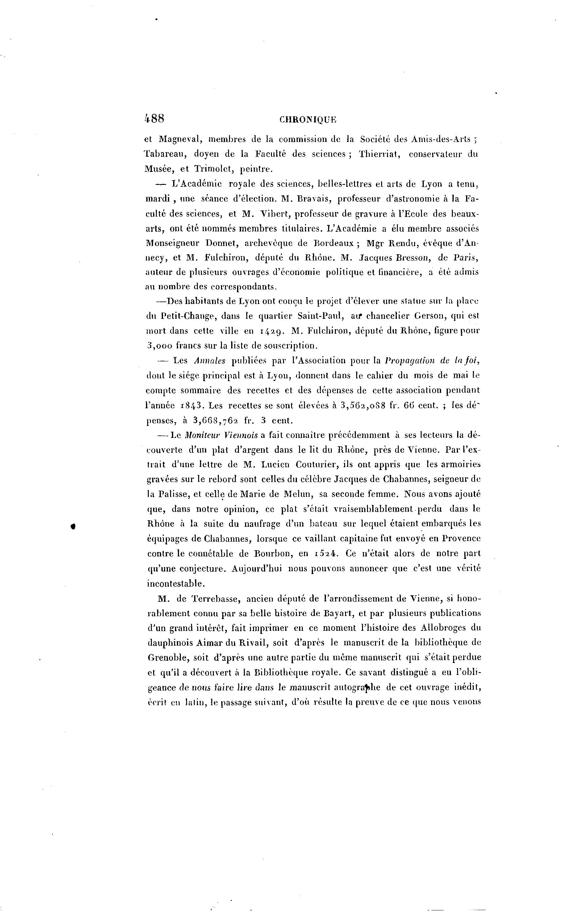 488 CHRONIQUE et Magneval, membres de la commission de la Société des Amis-des-Arts ; ïabareau, doyen de la Faculté des sciences ; T h i e n i a t , conservateur du Musée, et Trimolet, peintre. — L'Académie royale des sciences, belles-lettres et arts de Lyon a tenu, mardi , une séance d'élection. M. Bravais, professeur d'astronomie à la Fa- culté des sciences, et M . Yibert, professeur de gravure à l'Ecole des beaux- arts, ont été nommés membres titulaires. L'Académie a élu membre associés Monseigneur Donnet, archevêque de Bordeaux ; Mgr Rendu, évêque d'An- necy, et M. Fulchiron, député du Rhône. M. Jacques Bresson, de Paris, auteur de plusieurs ouvrages d'économie politique et financière, a été admis au nombre des correspondants. —Des habitants de Lyon ont conçu le projet d'élever une slalue sur la place du Petit-Change, dans le quartier Saint-Paul, aif chancelier Gerson, qui est mort dans cette ville en 1429. M. Fulchiron, député du Rhône, figure pour 3,ooo francs sur la liste de souscription. — Les Annales publiées par l'Association pour la Propagation de la foi, dont le siège principal est à Lyon, donnent dans le cahier du mois de mai le compte sommaire des recettes et des dépenses de cette association pendant l'année 1843. Les recettes se sont élevées à 3,562,088 fr. 66 cent. ; les dé~ penses, à 3,668,762 fr. 3 cent. — Le Moniteur Viennois a fait connaître précédemment à ses lecteurs la dé- couverte d'un plat d'argent dans le lit du Rhône, près de Vienne. Par l'ex- trait d'une lettre de M . Lucien Couturier, ils ont appris que les armoiries gravées sur le rebord sont celles du célèbre Jacques de Chabannes, seigneur de la Palisse, et celle de Marie de Melun, sa seconde femme. Nous avons ajouté que, dans notre opinion, ce plat s'était vraisemblablement perdu dans le Rhône à la suite du naufrage d'un bateau sur lequel étaient embarqués les équipages de Chabannes, lorsque ce vaillant capitaine fut envoyé en Provence contre le connétable de Bourbon, en i 5 2 4 . Ce n'était alors de notre part qu'une conjecture. Aujourd'hui nous pouvons annoncer que c'est une vérité incontestable. M . de Terrebasse, ancien député de l'arrondissement de Vienne, si hono- rablement connu par sa belle histoire de Bayart, et par plusieurs publications d'un grand intérêt, fait imprimer en ce moment l'histoire des Allobroges du dauphinois Aimar du Rivail, soit d'après le manuscrit de la bibliothèque de Grenoble, soit d'après une autre partie du même manuscrit qui s'était perdue et qu'il a découvert à la Bibliothèque royale. Ce savant distingué a eu l'obli- geance de nous faire lire dans le manuscrit autographe de cet ouvrage inédit, écril en lalin, le passage suivant, d'où résulte la preuve de ce que nous venons