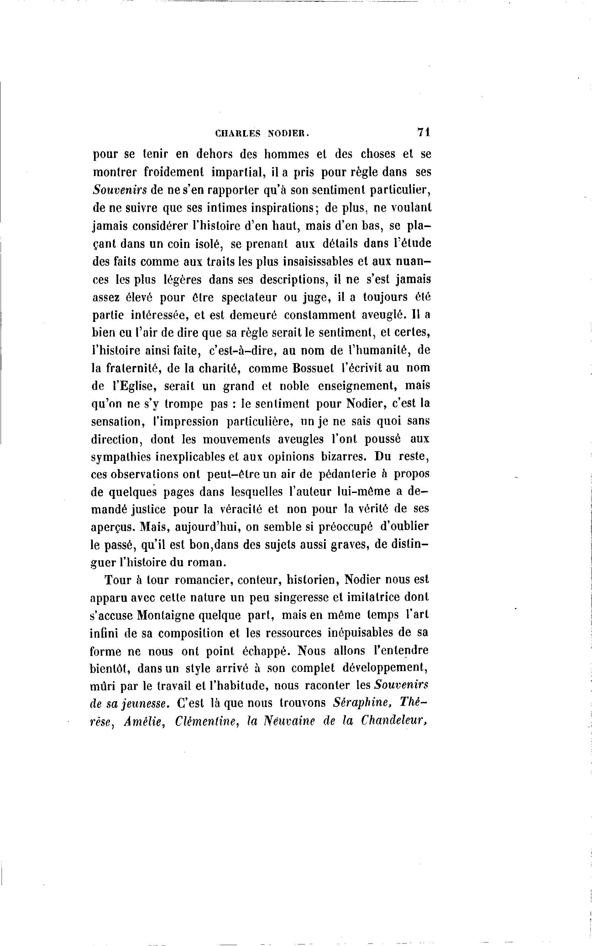 CHARLES NODIER. 71 pour se tenir en dehors des hommes et des choses et se montrer froidement impartial, il a pris pour règle dans ses Souvenirs de ne s'en rapporter qu'à son sentiment particulier, de ne suivre que ses intimes inspirations; de plus, ne voulant jamais considérer l'histoire d'en haut, mais d'en bas, se pla- çant dans un coin isolé, se prenant aux détails dans l'étude des faits comme aux traits les plus insaisissables et aux nuan- ces les plus légères dans ses descriptions, il ne s'est jamais assez élevé pour être spectateur ou juge, il a toujours été partie intéressée, et est demeuré constamment aveuglé. 11 a bien eu l'air de dire que sa règle serait le sentiment, et certes, l'histoire ainsi faite, c'est-à -dire, au nom de l'humanité, de la fraternité, de la charité, comme Bossuet l'écrivit au nom de l'Eglise, serait un grand et noble enseignement, mais qu'on ne s'y trompe pas : le sentiment pour Nodier, c'est la sensation, l'impression particulière, un je ne sais quoi sans direction, dont les mouvements aveugles l'ont poussé aux sympathies inexplicables et aux opinions bizarres. Du reste, ces observations ont peut-être un air de pédanterie à propos de quelques pages dans lesquelles l'auteur lui-même a de- mandé justice pour la véracité et non pour la vérité de ses aperçus. Mais, aujourd'hui, on semble si préoccupé d'oublier le passé, qu'il est bon,dans des sujets aussi graves, de distin- guer l'histoire du roman. Tour à tour romancier, conteur, historien, Nodier nous est apparu avec cette nature un peu singeresse et imitatrice dont s'accuse Montaigne quelque part, mais en même temps l'art infini de sa composition et les ressources inépuisables de sa forme ne nous ont point échappé. Nous allons l'entendre bientôt, dans un style arrivé à son complet développement, mûri par le travail et l'habitude, nous raconter les Souvenirs de sa jeunesse. C'est là que nous trouvons Séraphine, Thé- rèse, Amélie, Clémentine, la Nêuvaine de la Chandeleur,