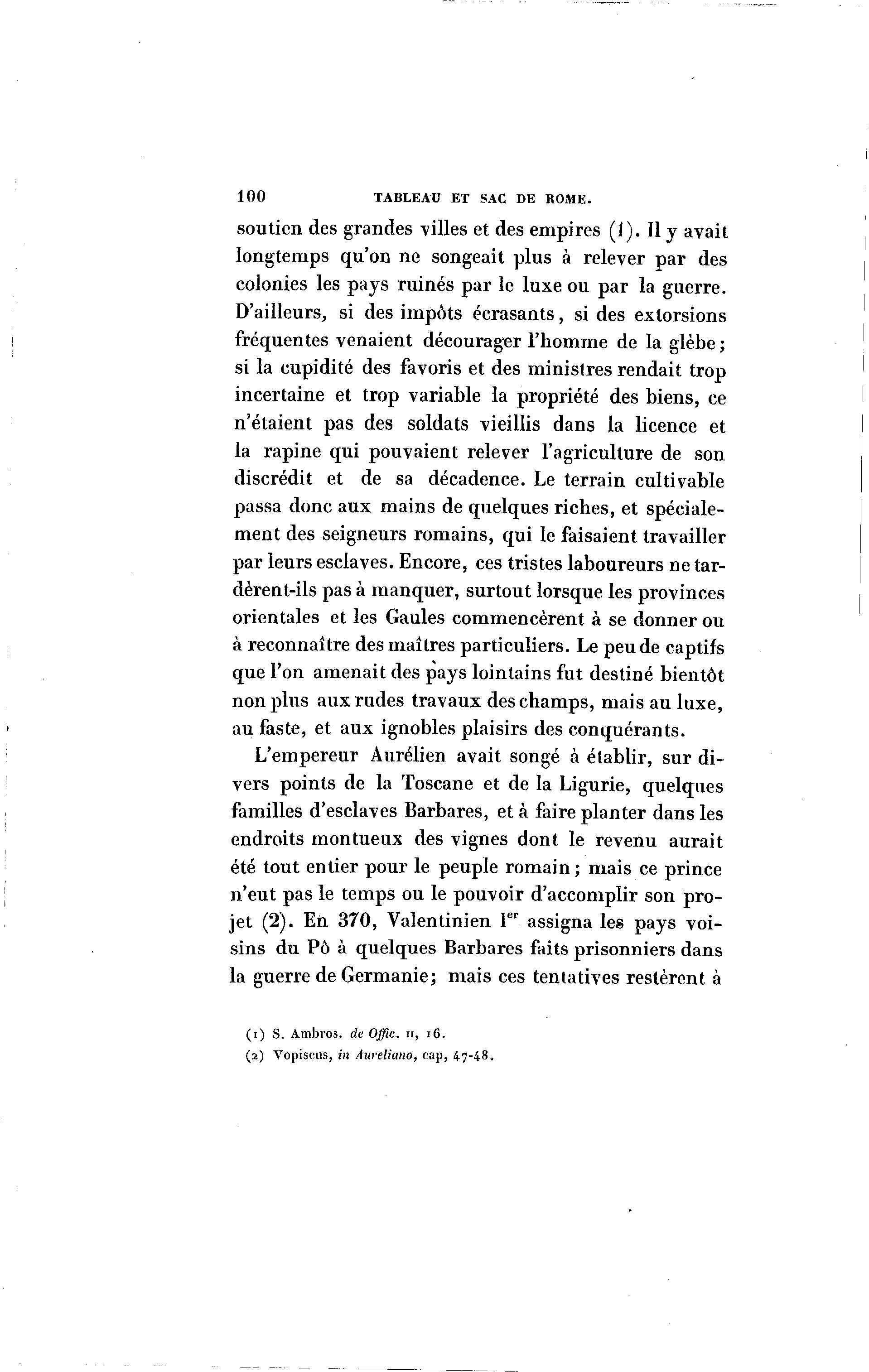 100 TABLEAU ET SAC DE ROME. soutien des grandes "villes et des empires (1). Il y avait longtemps qu'on ne songeait plus à relever par des colonies les pays ruinés par le luxe ou par la guerre. D'ailleurs, si des impôts écrasants, si des extorsions fréquentes venaient décourager l'homme de la glèbe; si la cupidité des favoris et des ministres rendait trop incertaine et trop variable la propriété des biens, ce n'étaient pas des soldats vieillis dans la licence et la rapine qui pouvaient relever l'agriculture de son discrédit et de sa décadence. Le terrain cultivable passa donc aux mains de quelques riches, et spéciale- ment des seigneurs romains, qui le faisaient travailler par leurs esclaves. Encore, ces tristes laboureurs ne tar- dèrent-ils pas à manquer, surtout lorsque les provinces orientales et les Gaules commencèrent à se donner ou à reconnaître des maîtres particuliers. Le peu de captifs que l'on amenait des pays lointains fut destiné bientôt non plus aux rudes travaux des champs, mais au luxe, au faste, et aux ignobles plaisirs des conquérants. L'empereur Aurélien avait songé à établir, sur di- vers points de la Toscane et de la Ligurie, quelques familles d'esclaves Barbares, et à faire planter dans les endroits montueux des vignes dont le revenu aurait été tout entier pour le peuple romain ; mais ce prince n'eut pas le temps ou le pouvoir d'accomplir son pro- jet (2). En 370, Valentinien Ier assigna les pays voi- sins du Pô à quelques Barbares faits prisonniers dans la guerre de Germanie; mais ces tentatives restèrent à (i) S. Ambros. de Offic. u, 16. (2) Vopiscus, in Aureliano, cap, 47-48.