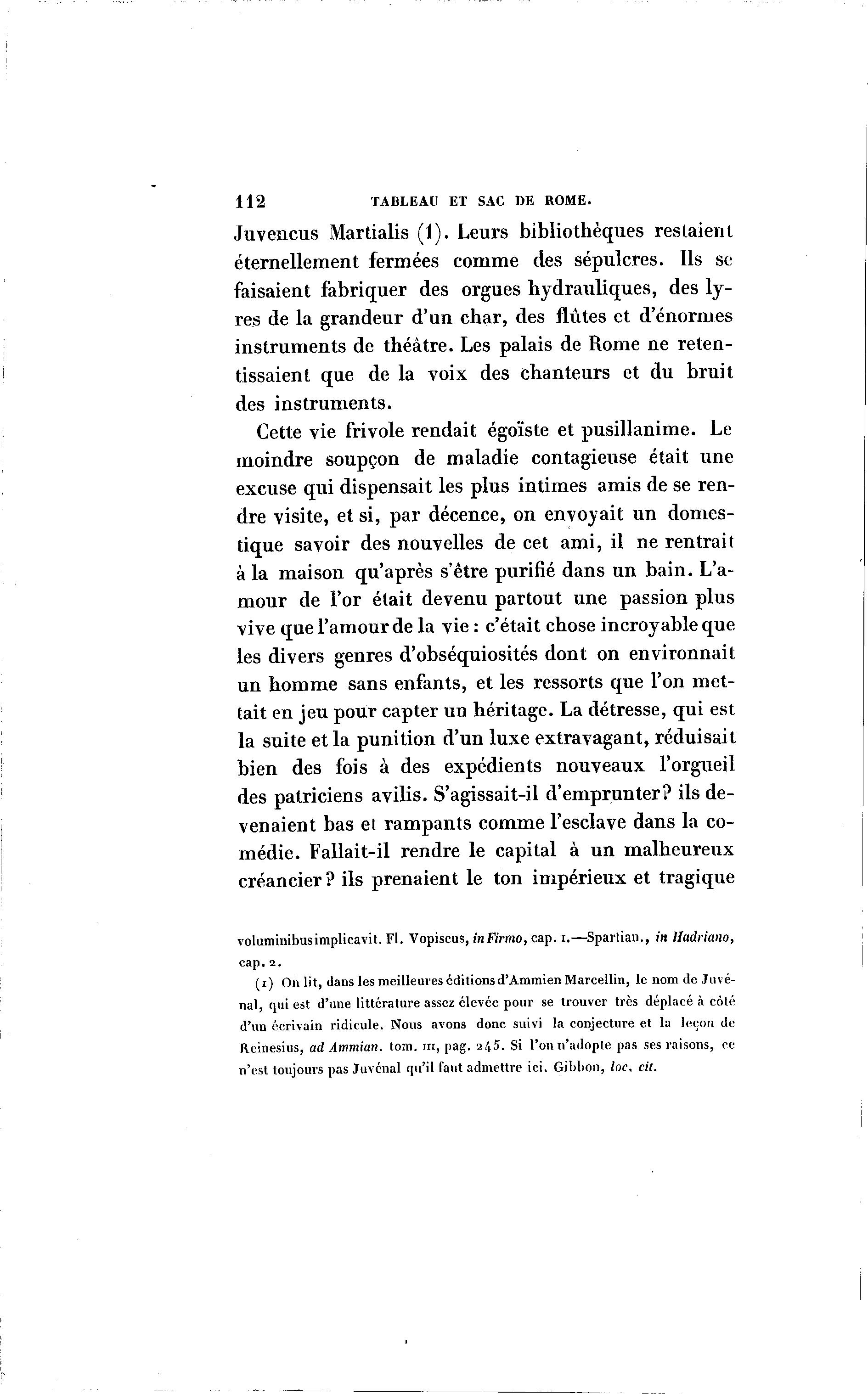 112 TABLEAU ET SAC DE ROME. Juvencus Martialis (1). Leurs bibliothèques restaient éternellement fermées comme des sépulcres. Ils se faisaient fabriquer des orgues hydrauliques, des ly- res de la grandeur d'un char, des flûtes et d'énormes instruments de théâtre. Les palais de Rome ne reten- tissaient que de la voix des chanteurs et du bruit des instruments. Cette vie frivole rendait égoïste et pusillanime. Le moindre soupçon de maladie contagieuse était une excuse qui dispensait les plus intimes amis de se ren- dre visite, et si, par décence, on envoyait un domes- tique savoir des nouvelles de cet ami, il ne rentrait à la maison qu'après s'être purifié dans un bain. L'a- mour de l'or était devenu partout une passion plus vive que l'amour de la vie : c'était chose incroyable que les divers genres d'obséquiosités dont on environnait un homme sans enfants, et les ressorts que l'on met- tait en jeu pour capter un héritage. La détresse, qui est la suite et la punition d'un luxe extravagant, réduisait bien des fois à des expédients nouveaux l'orgueil des patriciens avilis. S'agissait-il d'emprunter? ils de- venaient bas et rampants comme l'esclave dans la co- médie. Fallait-il rendre le capital à un malheureux créancier ? ils prenaient le ton impérieux et tragique voluminibusimplicavit. FI. Vopiscus, inFirmo, cap. i.—Spartian., in Uadriano, cap. 2 . (i) On lit, dans les meilleures éditions d'Ammien Marcellin, le nom de Juvé- nal, qui est d'une littérature assez élevée pour se trouver très déplacé à côté d'un écrivain ridicule. Nous avons donc suivi la conjecture et la leçon de Reinesius, ad Ammian. lom. m, pag. 245. Si l'on n'adopte pas ses raisons, ce n'est toujours pas Juvcnal qu'il faut admettre ici. Gibbon, loc. cit.