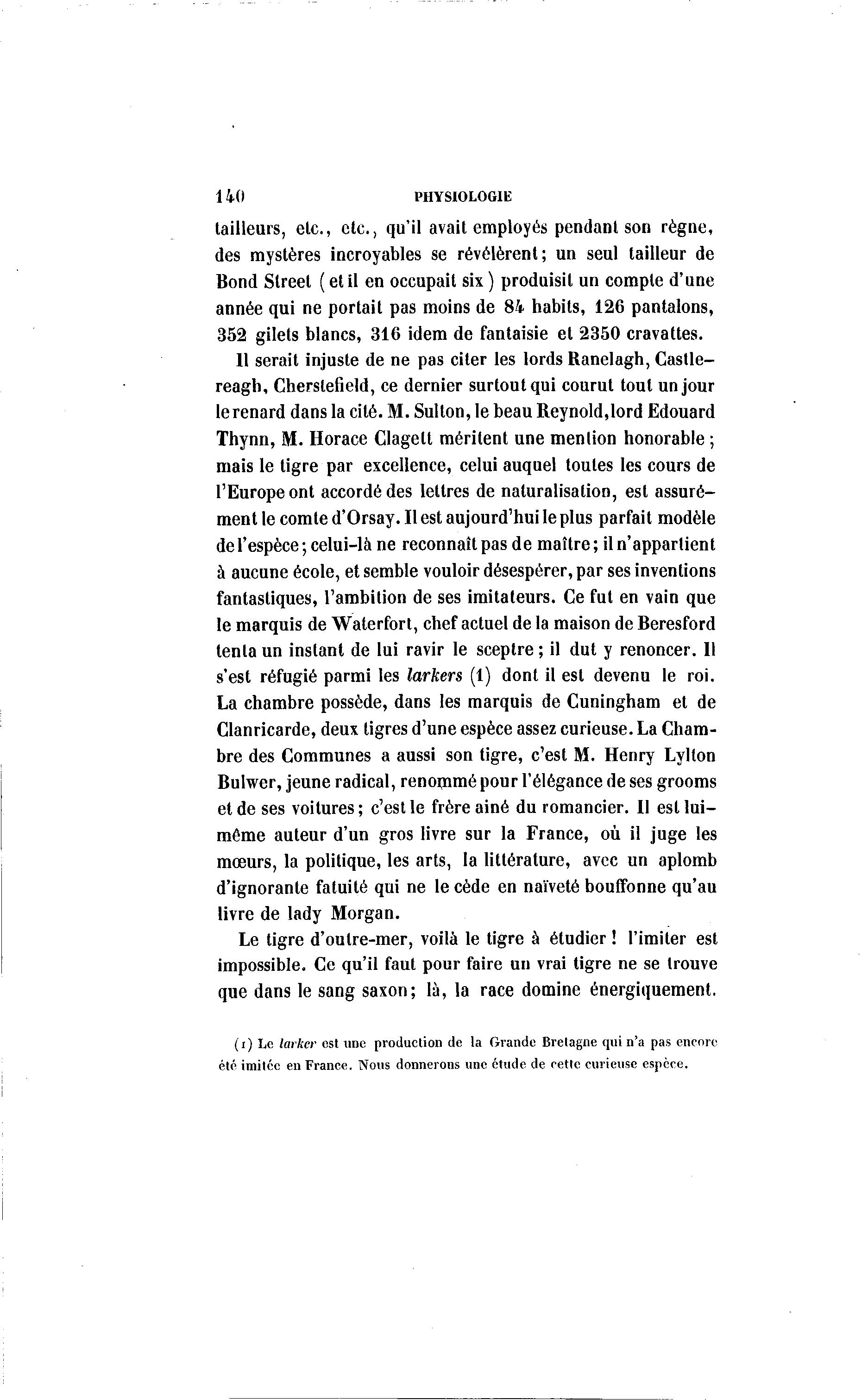 140 PHYSIOLOGIE tailleurs, etc., etc., qu'il avait employés pendant son règne, des mystères incroyables se révélèrent; un seul tailleur de Bond Street ( et il en occupait six ) produisit un compte d'une année qui ne portait pas moins de 84 habits, 126 pantalons, 352 gilets blancs, 316 idem de fantaisie et 2350 cravattes. 11 serait injuste de ne pas citer les lords Ranelagh, Castle- reagh, Cherslefield, ce dernier surtout qui courut tout un jour le renard dans la cité. M. Sulton, le beau Reynold,lord Edouard Thynn, M. Horace Clagelt méritent une mention honorable ; mais le tigre par excellence, celui auquel toutes les cours de l'Europe ont accordé des lettres de naturalisation, est assuré- ment le comte d'Orsay. Il est aujourd'hui le plus parfait modèle del'espèce; celui-là ne reconnaît pas de maître; il n'appartient à aucune école, et semble vouloir désespérer, par ses inventions fantastiques, l'ambition de ses imitateurs. Ce fut en vain que le marquis de Waterfort, chef actuel de la maison de Beresford tenta un instant de lui ravir le sceptre ; il dut y renoncer. 11 s'est réfugié parmi les larkers (1) dont il est devenu le roi. La chambre possède, dans les marquis de Cuningham et de Clanricarde, deux tigres d'une espèce assez curieuse. La Cham- bre des Communes a aussi son tigre, c'est M. Henry Lylton Bulwer, jeune radical, renommé pour l'élégance de ses grooms et de ses voitures ; c'est le frère aine du romancier. Il est lui- même auteur d'un gros livre sur la France, où il juge les mœurs, la politique, les arts, la littérature, avec un aplomb d'ignorante fatuité qui ne le cède en naïveté bouffonne qu'au livre de lady Morgan. Le tigre d'oulre-mer, voilà le tigre à étudier ! l'imiter est impossible. Ce qu'il faut pour faire un vrai tigre ne se trouve que dans le sang saxon; là , la race domine énergiquement. (i) Le larker est une production de la Grande Bretagne qui n'a pas encore été imitée en France. Nous donnerons une étude de cette curieuse espèce.