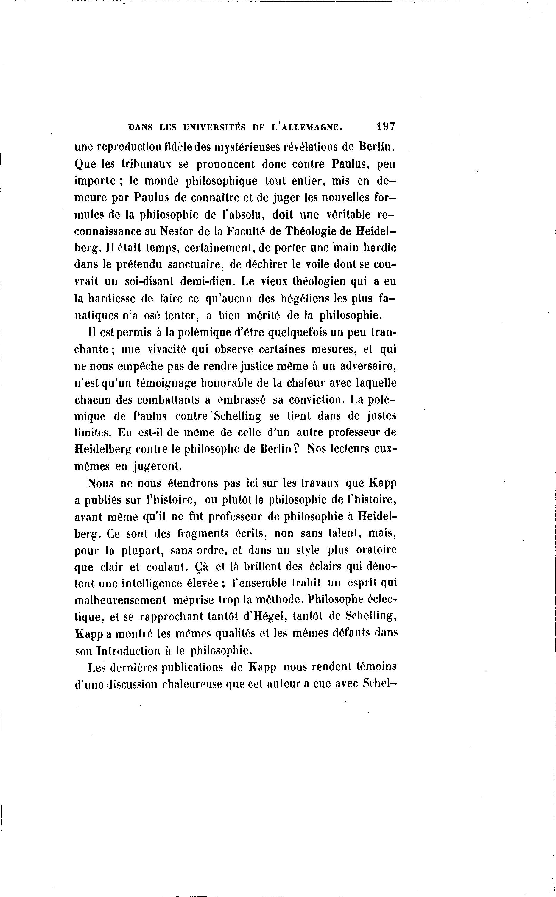 DANS LES UNIVERSITÉS DE L'ALLEMAGNE. 197 une reproductionfidèledes mystérieuses révélations de Berlin. Que les tribunaux se prononcent donc contre Paulus, peu importe ; le monde philosophique tout entier, mis en de- meure par Paulus de connaître et de juger les nouvelles for- mules de la philosophie de l'absolu, doit une véritable re- connaissance au Nestor de la Faculté de Théologie de Heidel- berg. 11 était temps, certainement, de porter une main hardie dans le prétendu sanctuaire, de déchirer le voile dont se cou- vrait un soi-disant demi-dieu. Le vieux théologien qui a eu la hardiesse de faire ce qu'aucun des hégéliens les plus fa- natiques n'a osé tenter, a bien mérité de la philosophie. 11 est permis à la polémique d'être quelquefois un peu tran- chante ; une vivacité qui observe certaines mesures, et qui ne nous empêche pas de rendre justice même à un adversaire, n'est qu'un témoignage honorable de la chaleur avec laquelle chacun des combattants a embrassé sa conviction. La polé- mique de Paulus contre Schelling se tient dans de justes limites. En est-il de môme de celle d'un autre professeur de Heidelberg contre le philosophe de Berlin? Nos lecteurs eux- mêmes en jugeront. Nous ne nous étendrons pas ici sur les travaux que Kapp a publiés sur l'histoire, ou plutôt la philosophie de l'histoire, avant même qu'il ne fut professeur de philosophie à Heidel- berg. Ce sont des fragments écrits, non sans talent, mais, pour la plupart, sans ordre, et dans un style plus oratoire que clair et coulant. Çà et là brillent des éclairs qui déno- tent une intelligence élevée ; l'ensemble trahit un esprit qui malheureusement méprise trop la méthode. Philosophe éclec- tique, et se rapprochant tantôt d'Hegel, tantôt de Schelling, Kapp a montré les mômes qualités el les mêmes défauts dans son Introduction à la philosophie. Les dernières publications de Kapp nous rendent témoins d'une discussion chaleureuse que cet auteur a eue avec Schel-