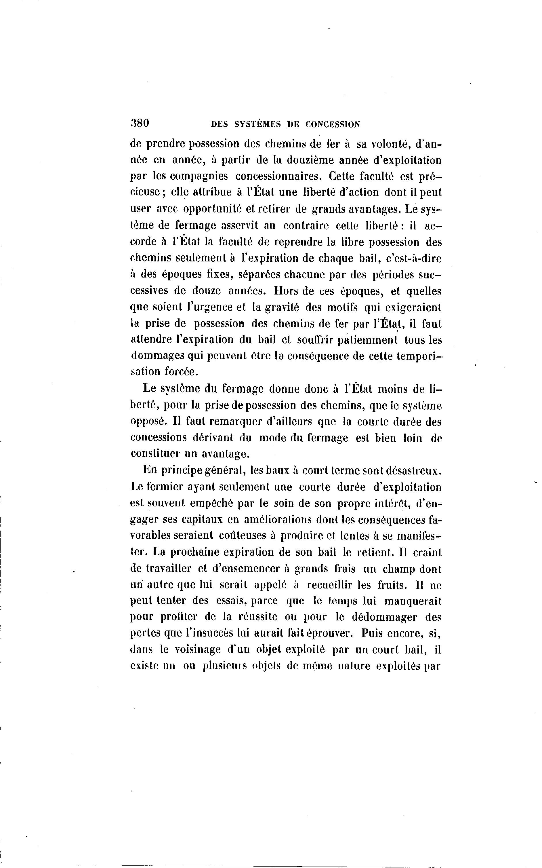 380 DES SYSTÈMES DE CONCESSION de prendre possession des chemins de fer à sa volonté, d'an- née en année, à partir de la douzième année d'exploitation par les compagnies concessionnaires. Cette faculté est pré- cieuse; elle attribue à l'État une liberté d'action dont il peut user avec opportunité et retirer de grands avantages. Le sys- tème de fermage asservit au contraire cette liberté : il ac- corde à l'Etat la faculté de reprendre la libre possession des chemins seulement à l'expiration de chaque bail, c'est-à -dire à des époques fixes, séparées chacune par des périodes suc- cessives de douze années. Hors de ces époques, et quelles que soient l'urgence et la gravité des motifs qui exigeraient la prise de possession des chemins de fer par l'État, il faut attendre l'expiration du bail et souffrir patiemment tous les dommages qui peuvent être la conséquence de cette tempori- sation forcée. Le système du fermage donne donc à l'État moins de li- berté, pour la prise de possession des chemins, que le système opposé. Il faut remarquer d'ailleurs que la courte durée des concessions dérivant du mode du fermage est bien loin de constituer un avantage. En principe général, les baux à court terme sont désastreux. Le fermier ayant seulement une courte durée d'exploitation est souvent empêché par le soin de son propre intérêt, d'en- gager ses capitaux en améliorations dont les conséquences fa- vorables seraient coûteuses à produire et lentes à se manifes- ter. La prochaine expiration de son bail le relient. Il craint de travailler et d'ensemencer à grands frais un champ dont un autre que lui serait appelé à recueillir les fruits. Il ne peut tenter des essais, parce que le temps lui manquerait pour profiter de la réussite ou pour le dédommager des pertes que l'insuccès lui aurait fait éprouver. Puis encore, si, dans le voisinage d'un objet exploité par un court bail, il existe un ou plusieurs objets de même nature exploités par