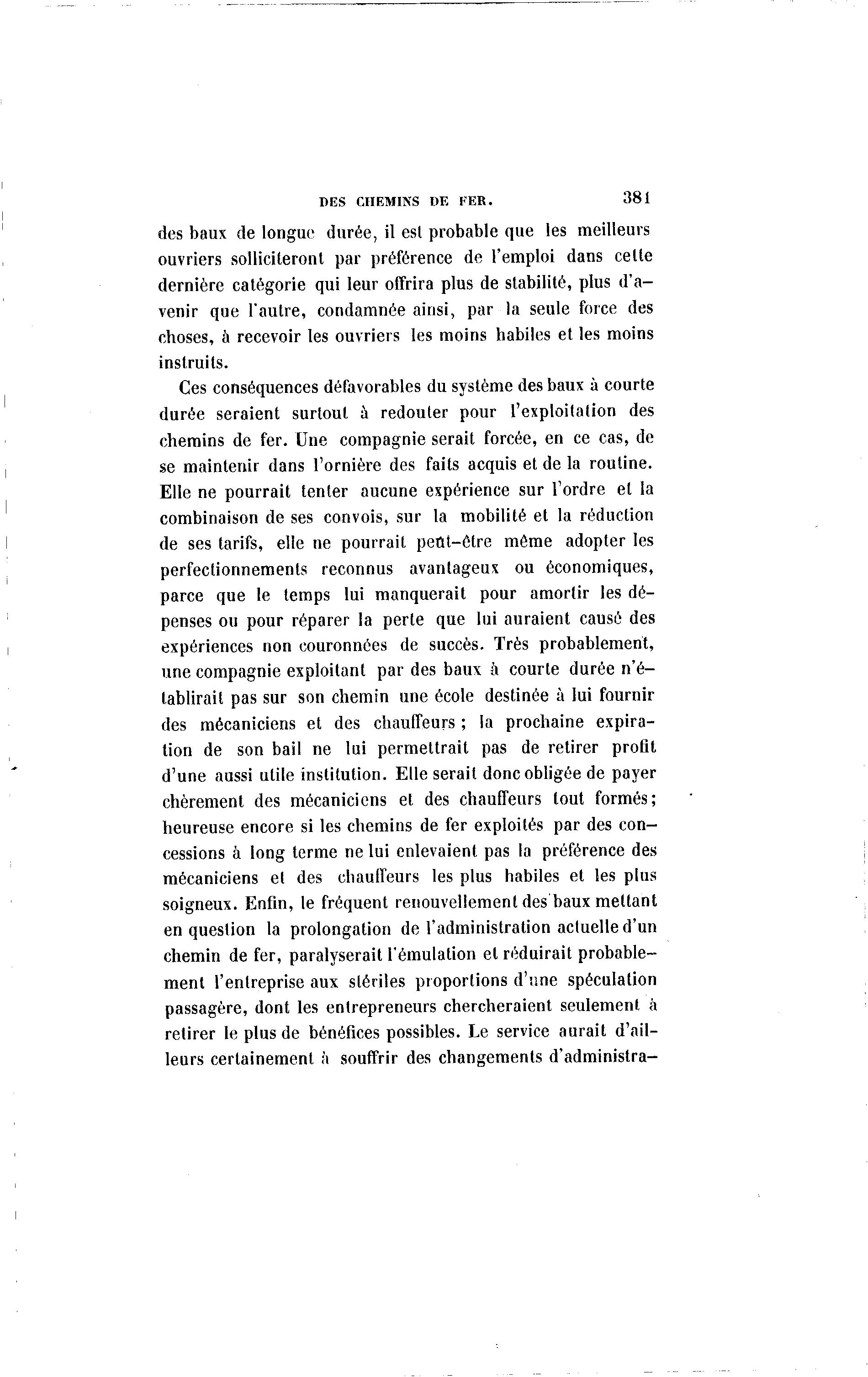 DES CHEMINS DE FER. 381 des baux de longue durée, il est probable que les meilleurs ouvriers solliciteront par préférence de l'emploi dans celle dernière catégorie qui leur offrira plus de stabilité, plus d'a- venir que l'autre, condamnée ainsi, par la seule force des choses, à recevoir les ouvriers les moins habiles et les moins instruits. Ces conséquences défavorables du système des baux à courte durée seraient surtout à redouter pour l'exploitation des chemins de fer. Une compagnie serait forcée, en ce cas, de se maintenir dans l'ornière des faits acquis et de la routine. Elle ne pourrait tenter aucune expérience sur l'ordre et la combinaison de ses convois, sur la mobilité et la réduction de ses tarifs, elle ne pourrait peut-être même adopter les perfectionnements reconnus avantageux ou économiques, parce que le temps lui manquerait pour amortir les dé- penses ou pour réparer la perte que lui auraient causé des expériences non couronnées de succès. Très probablement, une compagnie exploitant par des baux à courte durée n'é- tablirait pas sur son chemin une école destinée à lui fournir des mécaniciens et des chauffeurs ; la prochaine expira- tion de son bail ne lui permettrait pas de retirer profit d'une aussi utile institution. Elle serait donc obligée de payer chèrement des mécaniciens et des chauffeurs tout formés; heureuse encore si les chemins de fer exploités par des con- cessions à long terme ne lui enlevaient pas la préférence des mécaniciens el des chauffeurs les plus habiles et les plus soigneux. Enfin, le fréquent renouvellement des baux mettant en question la prolongation de l'administration actuelle d'un chemin de fer, paralyserait l'émulation et réduirait probable- ment l'entreprise aux stériles proportions d'une spéculation passagère, dont les entrepreneurs chercheraient seulement h retirer le plus de bénéfices possibles. Le service aurait d'ail- leurs certainement à souffrir des changements d'administra-