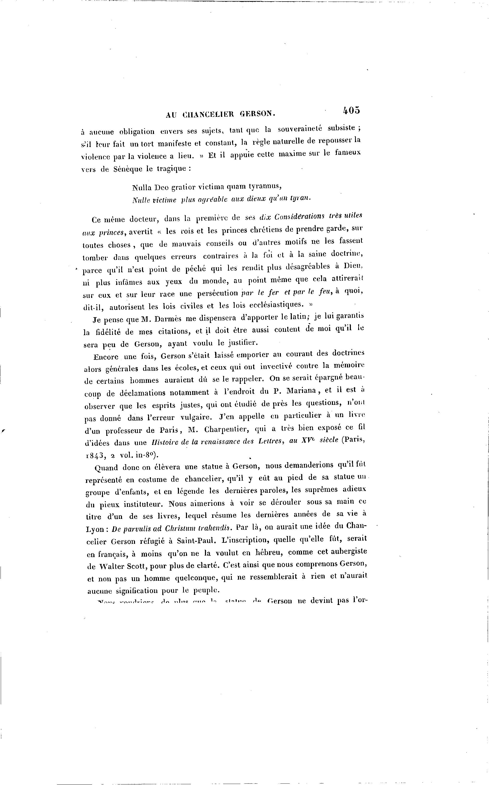 AU CHANCELIER GERSON. 405 à aucune obligation envers ses sujets, tant que la souveraineté subsiste ; s'il leur fait un tort manifeste et constant, la règle naturelle de repousser la violence par la violence a lieu. » Et il appuie cette maxime sur le fameux vers de Sénèque le tragique : Nulla Dco gratior victima quam tyrannus, Nulle victime plus ayn'able aux dieux qu'un tyran. Ce même docteur, dans la première de ses dix Considérations très utiles aux princes, avertit « les rois et les princes chrétiens de prendre garde, sur toutes choses , que de mauvais conseils ou U'autres motifs ne les fassent tomber dans quelques erreurs contraires à la loi et à la saine doctrine, parce qu'il n'est point de péché qui les rendît plus désagréables à Dieu, ni plus infâmes aux yeux du monde, au point même que cela attirerait sur eux et sur leur race une persécution par le fer et par le feu, à quoi, dit-il, autorisent les lois civiles et les lois ecclésiastiques. » J e pense que M . Darmès me dispensera d'apporter le latin; je lui garantis la fidélité de mes citations, et il doit être aussi content de moi qu'il le sera peu de Gerson, ayant voulu le justifier. Encore une fois, Gerson s'était laissé emporter au courant des doctrines alors générales dans les écoles, et ceux qui ont invectivé contre la mémoire de certains hommes auraient dû se le rappeler. On se serait épargné beau- coup de déclamations notamment à l'endroit du P . Mariana , et il est à observer que les esprits justes, qui ont étudié de près les questions, n'onl pas donné dans l'erreur vulgaire. J'en appelle en particulier à un livre d'un professeur de P a r i s , M . Charpentier, qui a très bien exposé ce fil d'idées dans une Histoire de la renaissance des Lettres, au XVe siècle (Paris, 1843, 2 vol. in-8°). Quand donc on élèvera une statue à Gerson, nous demanderions qu'il fût représenté en costume de chancelier, qu'il y eût au pied de sa statue un groupe d'enfants, et en légende les dernières paroles, les suprêmes adieux du pieux instituteur. Nous aimerions à voir se dérouler sous sa main ce titre d'un de ses livres, lequel résume les dernières années de sa vie à Lyon : De parvulis ad Chrislum traliendis. Par là , on aurait une idée du Chan- celier Gerson réfugié à Sainl-Paul. L'inscription, quelle qu'elle fût, serait en français, à moins qu'on ne la voulut en hébreu, comme cet aubergiste de Walter Scott, pour plus de clarté. C'est ainsi que nous comprenons Gerson, et non pas un homme quelconque, qui ne ressemblerait à rien et n'aurait aucune signification pour le peuple. ^T„., C ,.„..,u,„„ r ri„ ,,i„ c ,.,,„ i„ cl„ ,i„ | - ; e r s o n ne devint pas l'or-