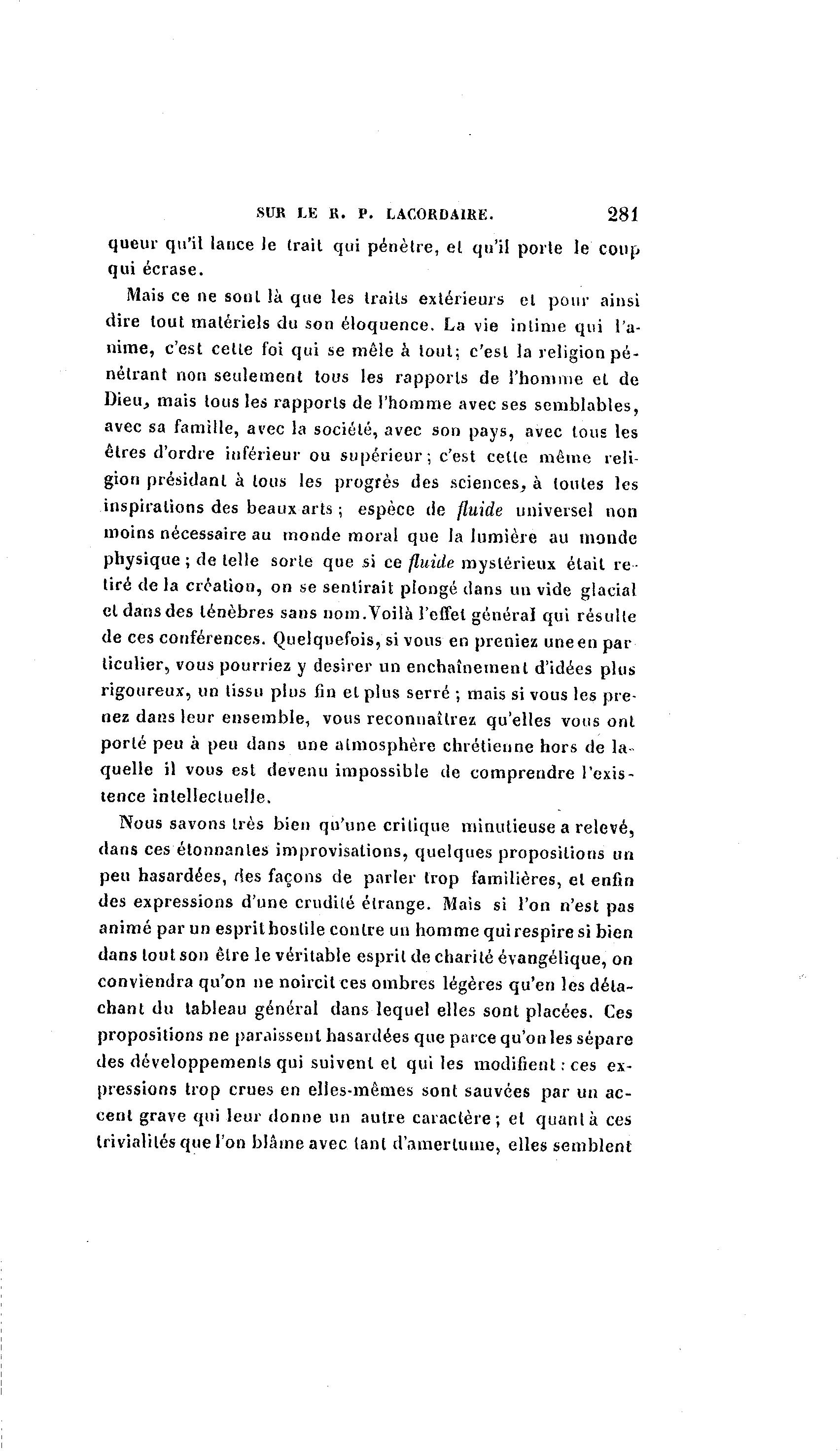 SITK LE K. P. LAC0RDA1RE. 281 queur qu'il lance le trait qui pénètre, et qu'il porte le coup qui écrase. Mais ce ne sont là que les traits extérieurs et pour ainsi dire tout matériels du son éloquence. La vie intime qui l'a- nime, c'est cette foi qui se mêle à tout; c'est la religion pé- nétrant non seulement tous les rapports de l'homme et de Dieuj mais tous les rapports de l'homme avec ses semblables, avec sa famille, avec la société, avec son pays, avec tous les êtres d'ordre inférieur ou supérieur; c'est cette même reli- gion présidant à tous les progrès des sciences, à toutes les inspirations des beaux arts ; espèce de fluide universel non moins nécessaire au monde moral que la lumière au monde physique ; de telle sorte que si ce fluide mystérieux était re- tiré d e l à création, on se sentirait plongé clans un vide glacial et dans des ténèbres sans nom.Voilà l'effet général qui résulte de ces conférences. Quelquefois, si vous en preniez une en par ticulier, vous pourriez y désirer un enchaînement d'idées plus rigoureux, un tissu plus fin et plus serré ; mais si vous les pre- nez dans leur ensemble, vous reconnaîtrez qu'elles vous ont porté peu à peu dans une atmosphère chrétienne hors de la- quelle il vous est devenu impossible de comprendre l'exis- tence intellectuelle. Nous savons très bien qu'une critique minutieuse a relevé, dans ces étonnantes improvisations, quelques propositions un peu hasardées, des façons de parler trop familières, et enfin des expressions d'une crudité étrange. Mais si l'on n'est pas animé par un esprit hostile contre un homme qui respire si bien dans tout son être le véritable esprit de charité évangélique, on conviendra qu'on ne noircit ces ombres légères qu'en les déta- chant du tableau général dans lequel elles sont placées. Ces propositions ne paraissent hasardées que parce qu'on les sépare des développements qui suivent et qui les modifient : ces ex- pressions trop crues en elles-mêmes sont sauvées par un ac- cent grave qui leur donne un autre caractère; et quant k ces trivialités que l'on blâme avec tant d'amertume, elles semblent