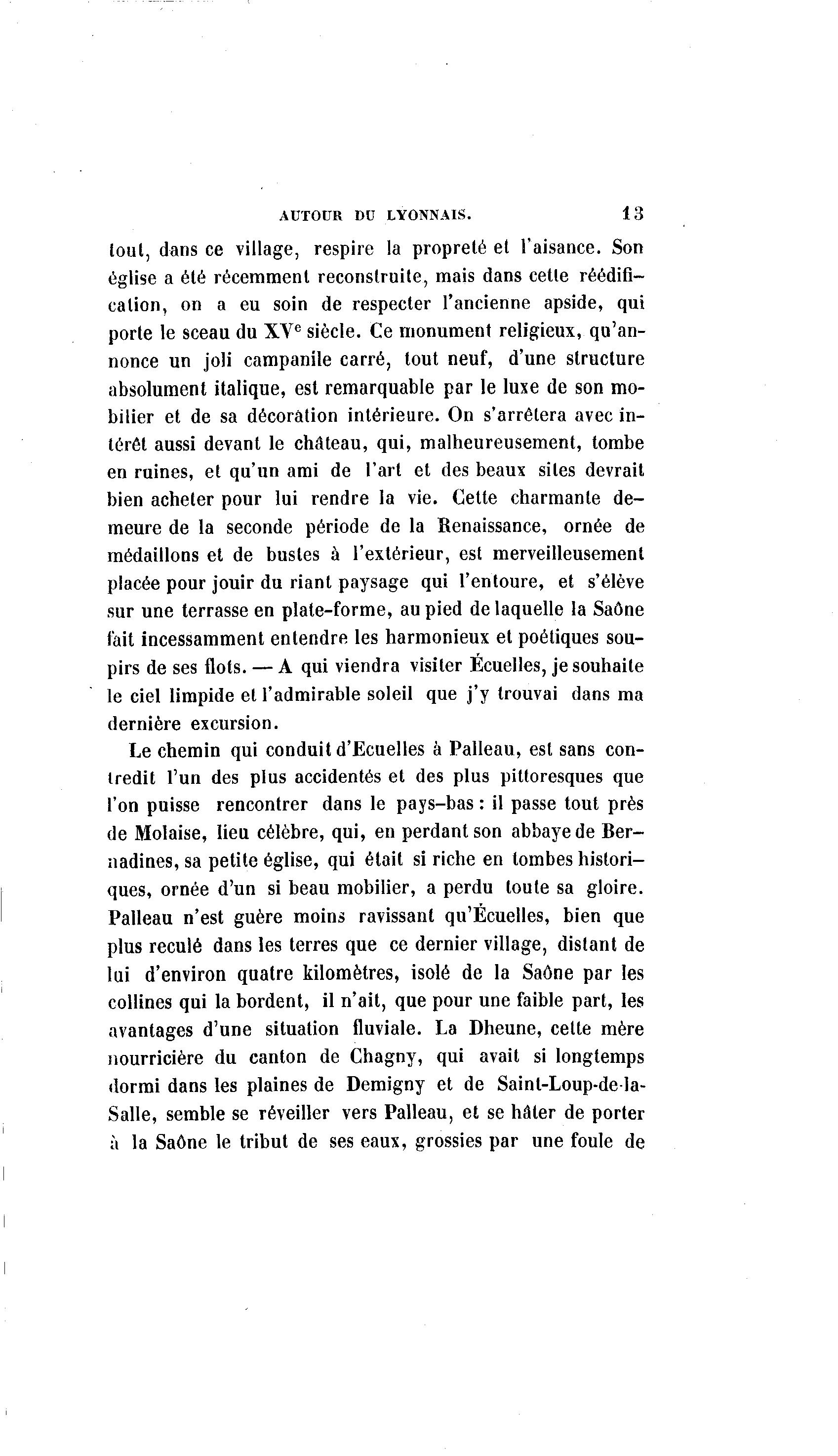 AUTOUR DU LYONNAIS. 13 tout, dans ce village, respire la propreté et l'aisance. Son église a été récemment reconstruite, mais dans cette réédifi- calion, on a eu soin de respecter l'ancienne apside, qui porte le sceau du XVe siècle. Ce monument religieux, qu'an- nonce un joli campanile carré, tout neuf, d'une structure absolument italique, est remarquable par le luxe de son mo- bilier et de sa décoration intérieure. On s'arrêtera avec in- térêt aussi devant le château, qui, malheureusement, tombe en ruines, et qu'un ami de l'art et des beaux sites devrait bien acheter pour lui rendre la vie. Cette charmante de- meure de la seconde période de la Renaissance, ornée de médaillons et de bustes à l'extérieur, est merveilleusement placée pour jouir du riant paysage qui l'entoure, et s'élève sur une terrasse en plate-forme, au pied de laquelle la Saône fait incessamment entendre les harmonieux et poétiques sou- pirs de ses flots. — A qui viendra visiter Écuelles, je souhaite le ciel limpide et l'admirable soleil que j'y trouvai dans ma dernière excursion. Le chemin qui conduit d Ecuelles a Palleau, est sans con- tredit l'un des plus accidentés et des plus pittoresques que l'on puisse rencontrer dans le pays-bas : il passe tout près de Molaise, lieu célèbre, qui, en perdant son abbaye de Ber- nadines, sa petite église, qui était si riche en tombes histori- ques, ornée d'un si beau mobilier, a perdu toute sa gloire. Palleau n'est guère moins ravissant qu'Écuelles, bien que plus reculé dans les terres que ce dernier village, distant de lui d'environ quatre kilomètres, isolé de la Saône par les collines qui la bordent, il n'ait, que pour une faible part, les avantages d'une situation fluviale. La Dheune, cette mère nourricière du canton de Chagny, qui avait si longtemps dormi dans les plaines de Demigny et de Saint-Loup-de la- Salle, semble se réveiller vers Palleau, et se hâter de porter à la Saône le tribut de ses eaux, grossies par une foule de
