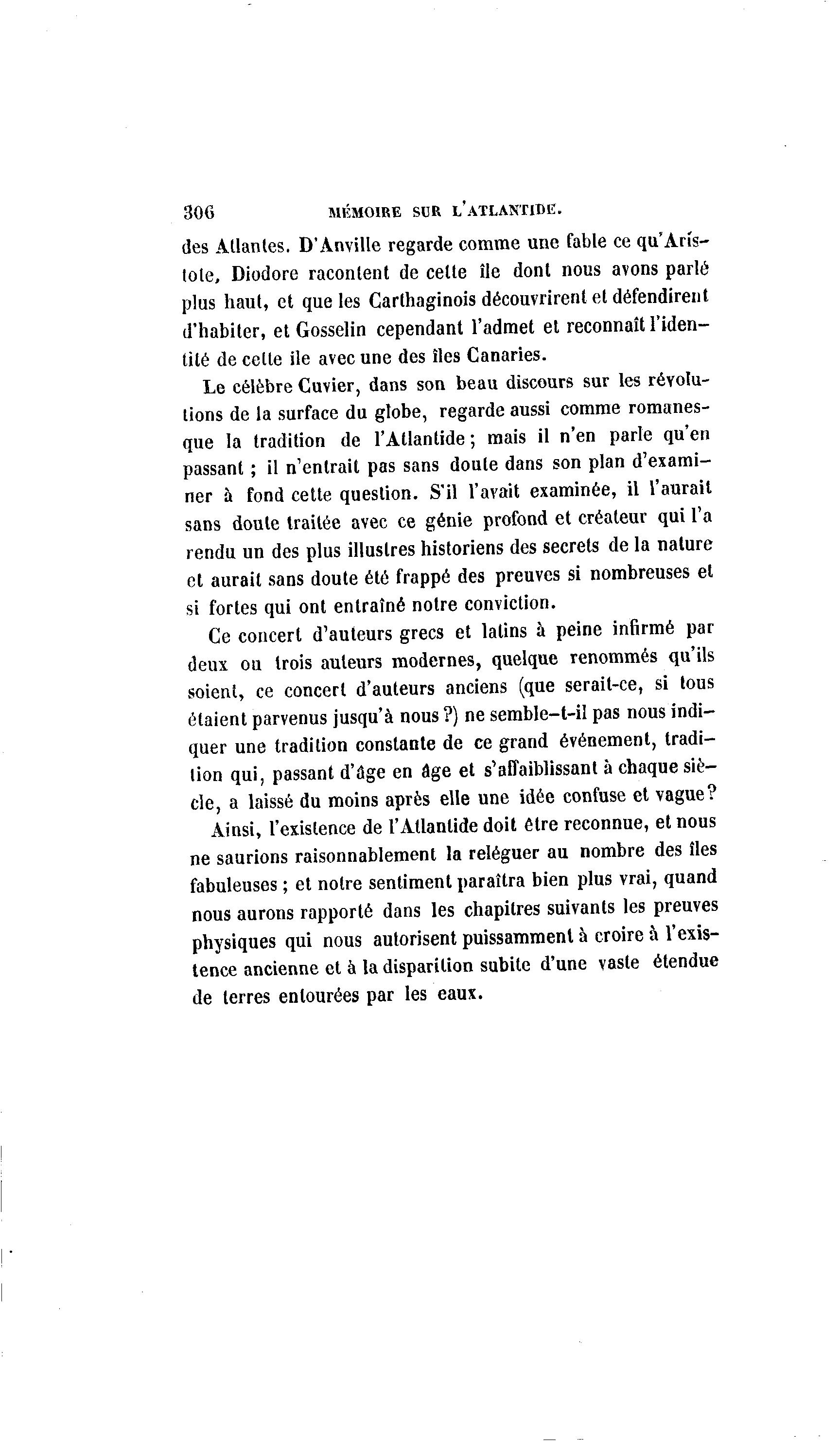 306 MÉMOIRE SUR L'ATLANTIDE. des Atlantes. D'Anville regarde comme une fable ce qu'Arîs- tote, Diodore racontent de celte île dont nous avons parlé plus haut, et que les Carthaginois découvrirent et défendirent d'habiter, et Gosselin cependant l'admet et reconnaît l'iden- tité de celte ile avec une des îles Canaries. Le célèbre Cuvier, dans son beau discours sur les révolu- tions de la surface du globe, regarde aussi comme romanes- que la tradition de l'Atlantide ; mais il n'en parle qu'en passant ; il n'entrait pas sans doute dans son plan d'exami- ner à fond cette question. S'il l'avait examinée, il l'aurait sans doule traitée avec ce génie profond et créateur qui l'a rendu un des plus illustres historiens des secrets de la nature et aurait sans doute été frappé des preuves si nombreuses et si fortes qui ont entraîné notre conviction. Ce concert d'auteurs grecs et latins à peine infirmé par deux ou trois auteurs modernes, quelque renommés qu'ils soient, ce concert d'auteurs anciens (que serait-ce, si tous étaient parvenus jusqu'à nous ?) ne semble-t-il pas nous indi- quer une tradition constante de ce grand événement, tradi- tion qui, passant d'âge en âge et s'affaiblissant à chaque siè- cle, a laissé du moins après elle une idée confuse et vague? Ainsi, l'existence de l'Atlantide doit être reconnue, et nous ne saurions raisonnablement la reléguer au nombre des îles fabuleuses ; et notre sentiment paraîtra bien plus vrai, quand nous aurons rapporté dans les chapitres suivants les preuves physiques qui nous autorisent puissamment à croire à l'exis- tence ancienne et à la disparition subite d'une vaste étendue de terres entourées par les eaux.