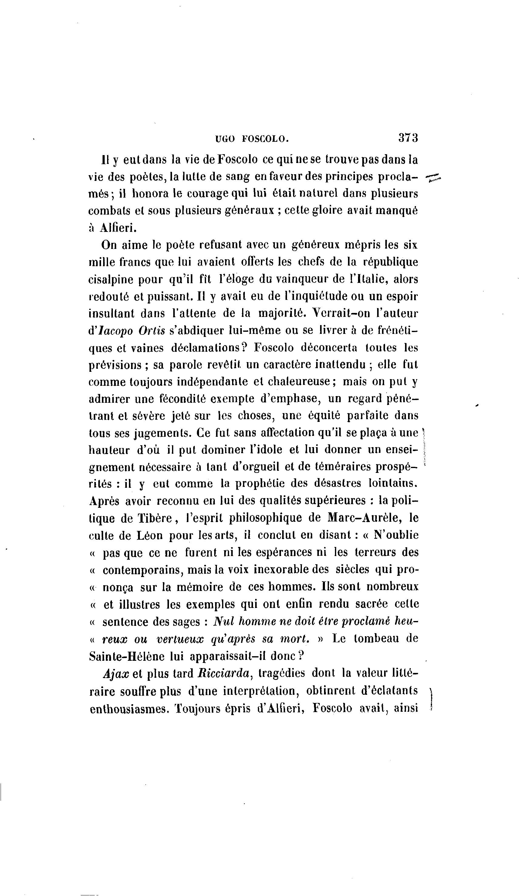 UGO FOSCOLO. 373 11 y eut dans la vie de Foscolo ce qui ne se trouve pas dans la vie des poètes, la lutte de sang en faveur des principes procla- -^r- més ; il honora le courage qui lui était naturel dans plusieurs combats et sous plusieurs généraux ; cette gloire avait manqué à Alfieri. On aime le poète refusant avec un généreux mépris les six mille francs que lui avaient offerts les chefs de la république cisalpine pour qu'il fît l'éloge du vainqueur de l'Italie, alors redouté et puissant. Il y avait eu de l'inquiétude ou un espoir insultant dans l'attente de la majorité. Verrait-on l'auteur d'iacopo Ortis s'abdiquer lui-même ou se livrer à de frénéti- ques et vaines déclamations? Foscolo déconcerta toutes les prévisions ; sa parole revêtit un caractère inattendu ; elle fut comme toujours indépendante et chaleureuse; mais on put y admirer une fécondité exempte d'emphase, un regard péné- trant et sévère jeté sur les choses, une équité parfaite dans tous ses jugements. Ce fut sans affectation qu'il se plaça à une \ hauteur d'où il put dominer l'idole et lui donner un ensei- \ gnement nécessaire à tant d'orgueil et de téméraires prospé- ' rites : il y eut comme la prophétie des désastres lointains. Après avoir reconnu en lui des qualités supérieures : la poli- tique d é l i b è r e , l'esprit philosophique de Marc-Aurèle, le culte de Léon pour les arts, il conclut en disant : « N'oublie « pas que ce ne furent ni les espérances ni les terreurs des « contemporains, mais la voix inexorable des siècles qui pro- « nonça sur la mémoire de ces hommes. Ils sont nombreux « et illustres les exemples qui ont enfin rendu sacrée cette « sentence des sages : Nul homme ne doit être proclamé heu- « reux ou vertueux qu'après sa mort. » Le tombeau de Sainte-Hélène lui apparaissait-il donc? Ajax et plus tard Ricciarda, tragédies dont la valeur litté- raire souffre plus d'une inlerprétalion, obtinrent d'éclatants \ enthousiasmes. Toujours épris d'Alfieri, Foscolo avait, ainsi !