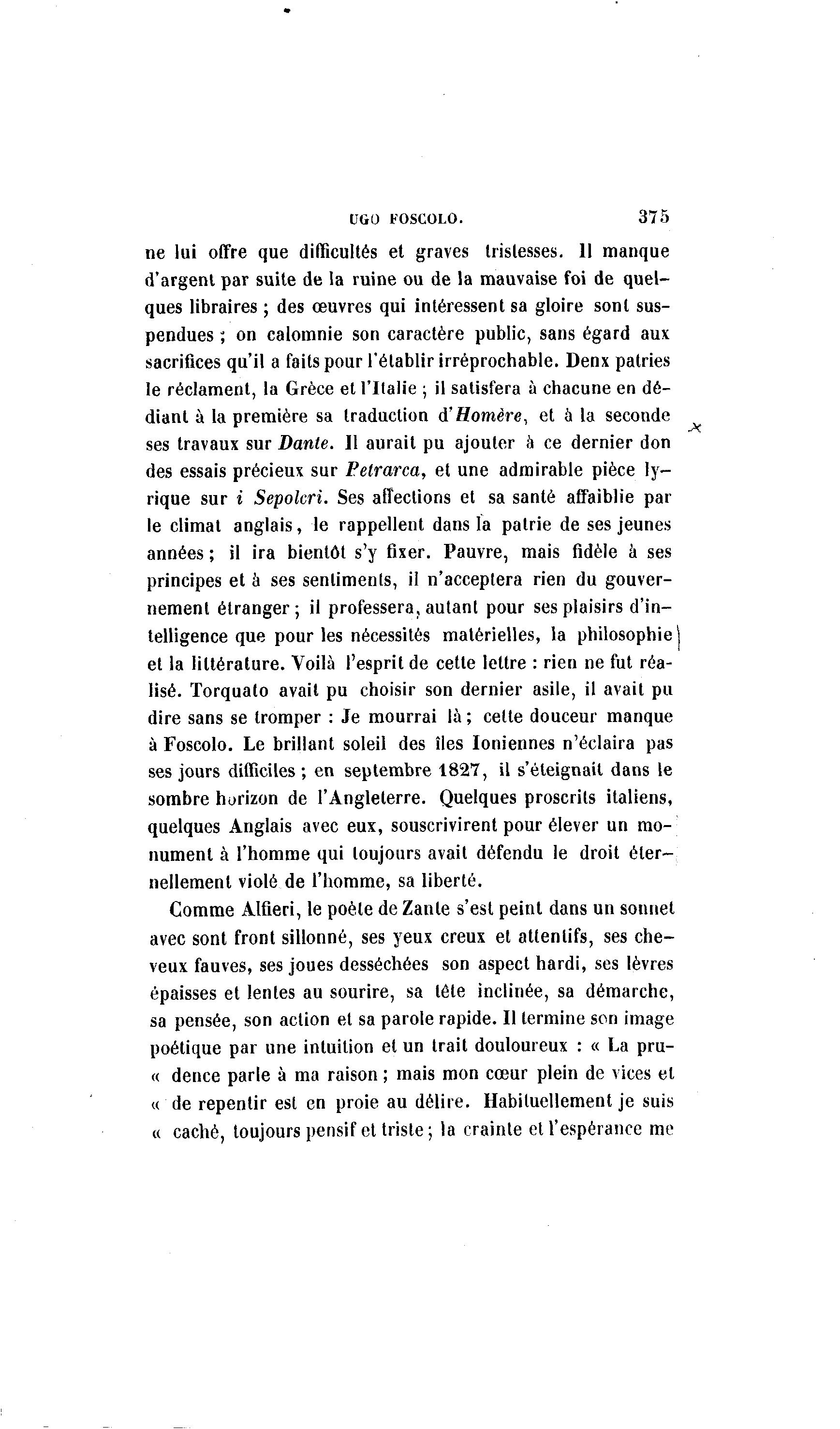 UGO FOSCOLO. 375 ne lui offre que difficultés et graves tristesses. 11 manque d'argent par suite de la ruine ou de la mauvaise foi de quel- ques libraires ; des œuvres qui intéressent sa gloire sont sus- pendues ; on calomnie son caractère public, sans égard aux sacrifices qu'il a faits pour l'établir irréprochable. Denx patries le réclament, la Grèce et l'Italie ; il satisfera à chacune en dé- diant à la première sa traduction d'Homère, et à la seconde ses travaux sur Dante. Il aurait pu ajouter à ce dernier don des essais précieux sur Petrarca, et une admirable pièce ly- rique sur i Sepolcri. Ses affections et sa santé affaiblie par le climat anglais, le rappellent dans la patrie de ses jeunes années ; il ira bientôt s'y fixer. Pauvre, mais fidèle à ses principes et â ses sentiments, il n'acceptera rien du gouver- nement étranger; il professera, autant pour ses plaisirs d'in- telligence que pour les nécessités matérielles, la philosophie j et la littérature. Voilà l'esprit de cette lettre : rien ne fut réa- lisé. Torquato avait pu choisir son dernier asile, il avait pu dire sans se tromper : Je mourrai là ; cette douceur manque à Foscolo. Le brillant soleil des îles Ioniennes n'éclaira pas ses jours difficiles ; en septembre 1827, il s'éteignait dans le sombre horizon de l'Angleterre. Quelques proscrits italiens, quelques Anglais avec eux, souscrivirent pour élever un mo- nument à l'homme qui toujours avait défendu le droit éter- nellement violé de l'homme, sa liberté. Comme Alfieri, le poète de Zante s'est peint dans un sonnet avec sont front sillonné, ses yeux creux et attentifs, ses che- veux fauves, ses joues desséchées son aspect hardi, ses lèvres épaisses et lentes au sourire, sa tête inclinée, sa démarche, sa pensée, son action et sa parole rapide. Il termine son image poétique par une intuition et un trait douloureux : « La pru- « dence parle à ma raison ; mais mon cœur plein de vices et « de repentir est en proie au délire. Habituellement je suis « caché, toujours pensif et triste; la crainte et l'espérance me