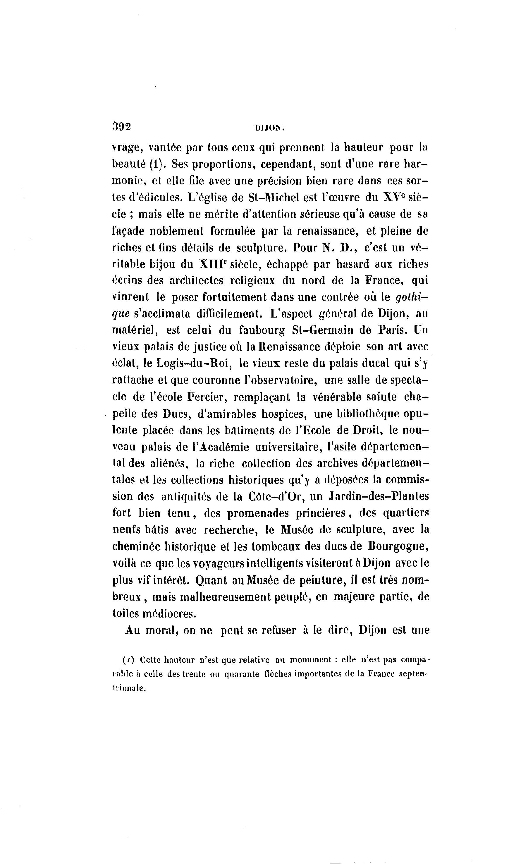 392 DIJON. vrage, vantée par tous ceux qui prennent la hauteur pour la beauté (1). Ses proportions, cependant, sont d'une rare har- monie, et elle file avec une précision bien rare dans ces sor- tes d'édicules. L'église de St-Michel est l'œuvre du XVe siè- cle ; mais elle ne mérite d'attention sérieuse qu'à cause de sa façade noblement formulée par la renaissance, et pleine de riches et fins détails de sculpture. Pour N. D., c'est un vé- ritable bijou du XIIIe siècle, échappé par hasard aux riches écrins des architectes religieux du nord de la France, qui vinrent le poser fortuitement dans une contrée où le gothi- que s'acclimata difficilement. L'aspect général de Dijon, au matériel, est celui du faubourg St-Germain de Paris. Un vieux palais de justice où la Renaissance déploie son art avec éclat, le Logis-du-Roi, le vieux reste du palais ducal qui s'y rattache et que couronne l'observatoire, une salle de specta- cle de l'école Percier, remplaçant la vénérable sainte cha- pelle des Ducs, d'amirables hospices, une bibliothèque opu- lente placée dans les bâtiments de l'Ecole de Droit, le nou- veau palais de l'Académie universitaire, l'asile départemen- tal des aliénés, la riche collection des archives départemen- tales et les collections historiques qu'y a déposées la commis- sion des antiquités de la Côte-d'Or, un Jardin-des-Planles fort bien tenu, des promenades princières, des quartiers neufs bâtis avec recherche, le Musée de sculpture, avec la cheminée historique et les tombeaux des ducs de Bourgogne, voilà ce que les voyageurs intelligents visiteront à Dijon avec le plus vif intérêt. Quant au Musée de peinture, il est très nom- breux , mais malheureusement peuplé, en majeure partie, de toiles médiocres. Au moral, on ne peut se refuser à le dire, Dijon est une (i) Cette hauteur n'est que relative au monument : elle n'est pas compa- rable à celle des trente ou quarante flèches importantes de la France septen- trionale.