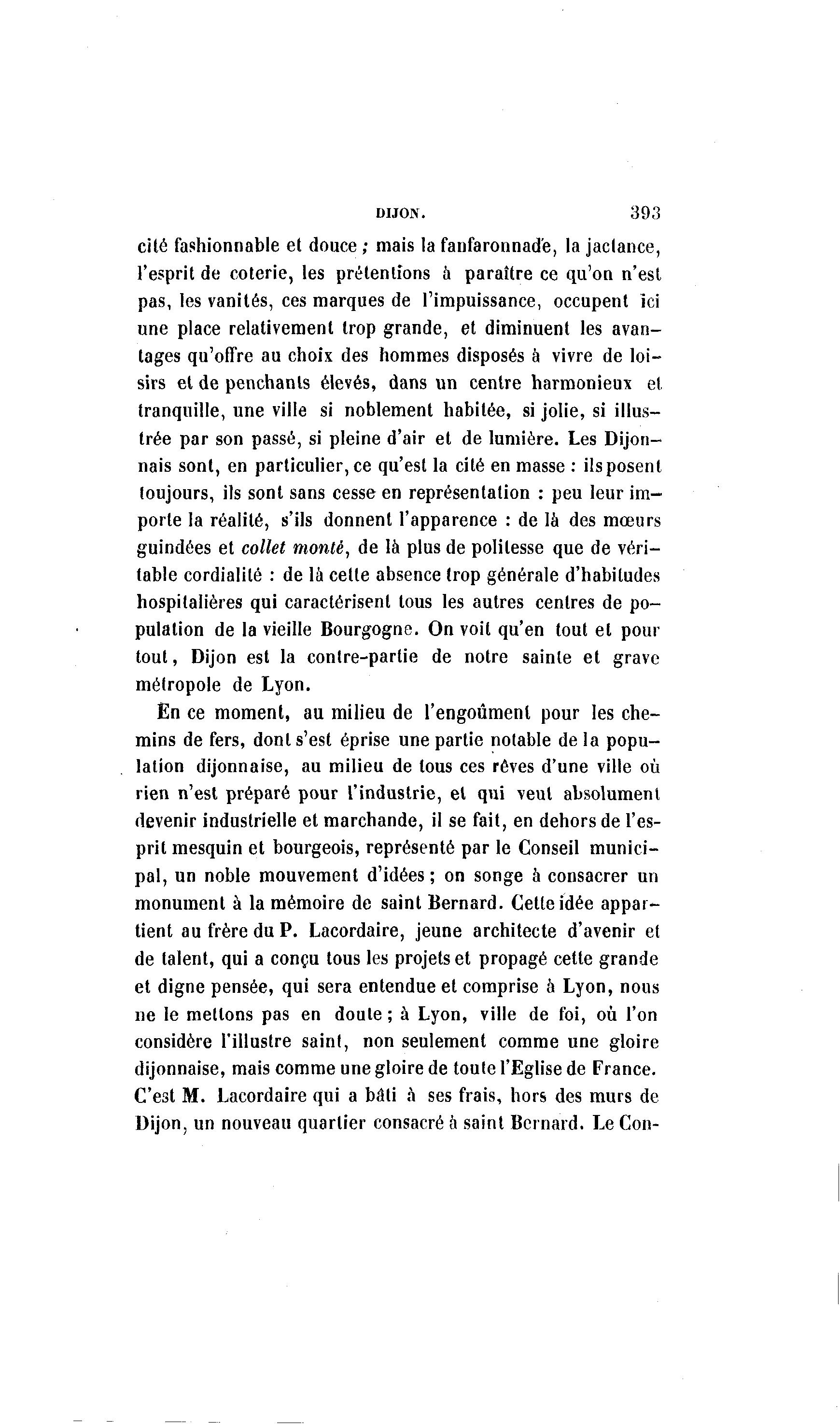 DIJON. 393 cité fashionnable et douce ; mais la fanfaronnade, la jaclance, l'esprit de coterie, les prétentions à paraître ce qu'on n'est pas, les vanités, ces marques de l'impuissance, occupent ici une place relativement trop grande, et diminuent les avan- tages qu'offre au choix des hommes disposés à vivre de loi- sirs et de penchants élevés, dans un centre harmonieux et tranquille, une ville si noblement habitée, si jolie, si illus- trée par son passé, si pleine d'air et de lumière. Les Dijon— nais sont, en particulier, ce qu'est la cité en masse : ils posent toujours, ils sont sans cesse en représentation : peu leur im- porte la réalité, s'ils donnent l'apparence : de là des mœurs guindées et collet monté, de là plus de politesse que de véri- table cordialité : de là cette absence trop générale d'habitudes hospitalières qui caractérisent tous les autres centres de po- pulation de la vieille Bourgogne. On voit qu'en tout et pour tout, Dijon est la contre-partie de notre sainte et grave métropole de Lyon. En ce moment, au milieu de l'engoûmenl pour les che- mins de fers, dont s'est éprise une partie notable de la popu- lation dijonnaise, au milieu de tous ces rêves d'une ville où rien n'est préparé pour l'industrie, et qui veut absolument devenir industrielle et marchande, il se fait, en dehors de l'es- prit mesquin et bourgeois, représenté par le Conseil munici- pal, un noble mouvement d'idées ; on songe à consacrer un monument à la mémoire de saint Bernard. Cette idée appar- tient au frère du P. Lacordaire, jeune architecte d'avenir et de talent, qui a conçu tous les projets et propagé cette grande et digne pensée, qui sera entendue et comprise à Lyon, nous ne le mettons pas en doute ; à Lyon, ville de foi, où l'on considère l'illustre saint, non seulement comme une gloire dijonnaise, mais comme une gloire de toute l'Eglise de France. C'est M. Lacordaire qui a bâti à ses frais, hors des murs de Dijon, un nouveau quartier consacré à saint Bernard. Le Con-