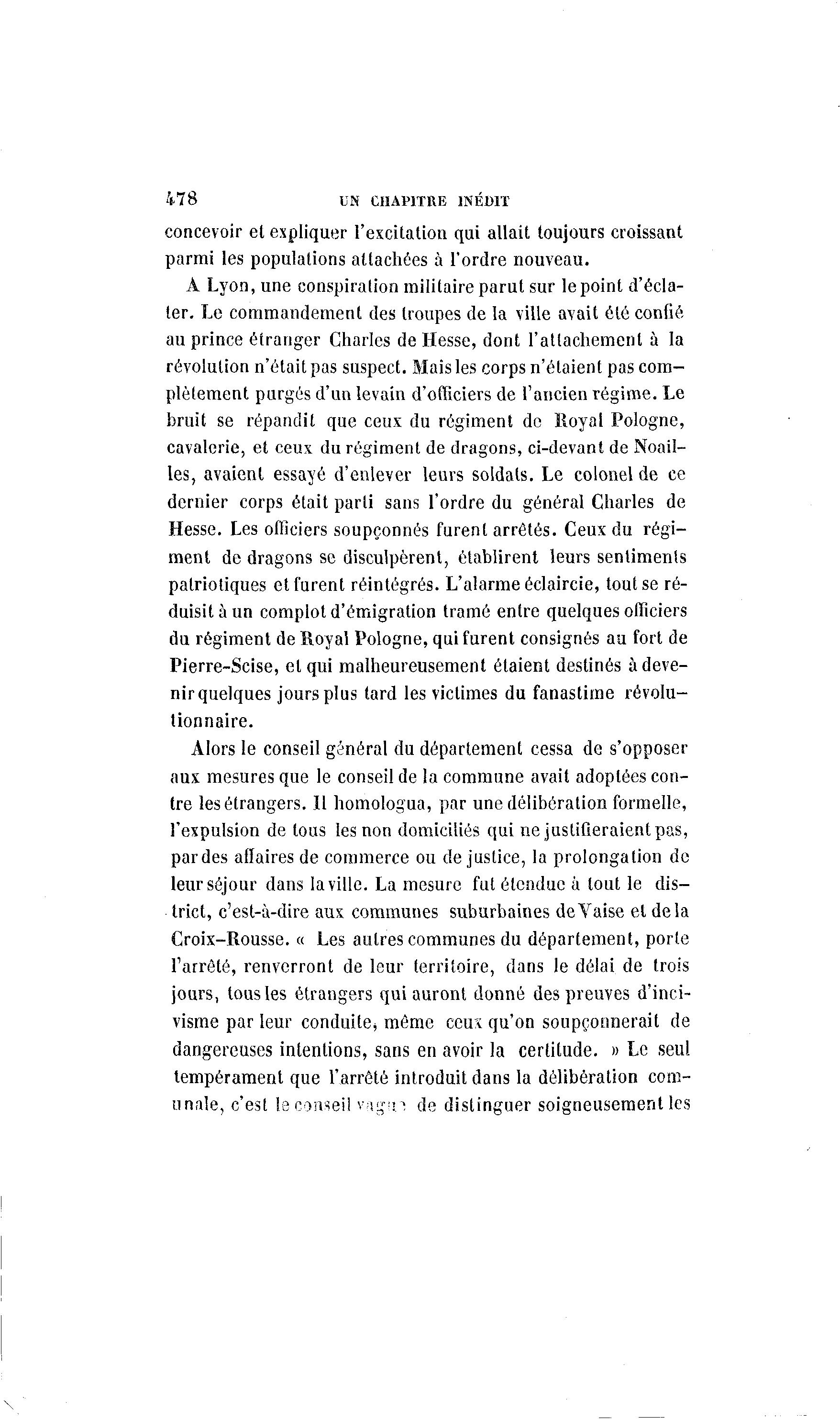 478 UN CHAPITRE INÉDIT concevoir et expliquer l'excitation qui allait toujours croissant parmi les populations attachées à l'ordre nouveau. À Lyon, une conspiration militaire parut sur le point d'écla- ter. Le commandement des troupes de la ville avait été confié au prince étranger Charles de liesse, dont rattachement à la révolution n'était pas suspect. Mais les corps n'étaient pas com- plètement purgés d'un levain d'officiers de l'ancien régime. Le bruit se répandit que ceux du régiment do Royal Pologne, cavalerie, et ceux du régiment de dragons, ci-devant de Noail- les, avaient, essayé d'enlever leurs soldats. Le colonel de ce dernier corps était parti sans l'ordre du général Charles de Hesse. Les officiers soupçonnés furent arrêtés. Ceux du régi- ment de dragons se disculpèrent, établirent leurs sentiments patriotiques et furent réintégrés. L'alarme éclaircie, tout se ré- duisit à un complot d'émigration tramé entre quelques officiers du régiment de Royal Pologne, qui furent consignés au fort de Pierre-Scise, et qui malheureusement étaient destinés à deve- nir quelques jours plus tard les victimes du fanastime révolu- tionnaire. Alors le conseil général du département cessa de s'opposer aux mesures que le conseil de la commune avait adoptées con- tre les étrangers. Il homologua, par une délibération formelle, l'expulsion de tous les non domiciliés qui ne justifieraient pas, pardes affaires de commerce ou de justice, la prolongation de leur séjour dans la ville. La mesure fut étendue à tout le dis- trict, c'est-à -dire aux communes suburbaines deVaise et delà Croix-Rousse. « Les autres communes du département, porte l'arrêté, renverront de leur territoire, dans le délai de trois jours, tous les étrangers qui auront donné des preuves d'inci- visme par leur conduite, même ceux qu'on soupçonnerait de dangereuses intentions, sans en avoir la certitude. » Le seul tempérament que l'arrêté introduit dans la délibération com- unale, c'est le conseil va^'n de distinguer soigneusement les