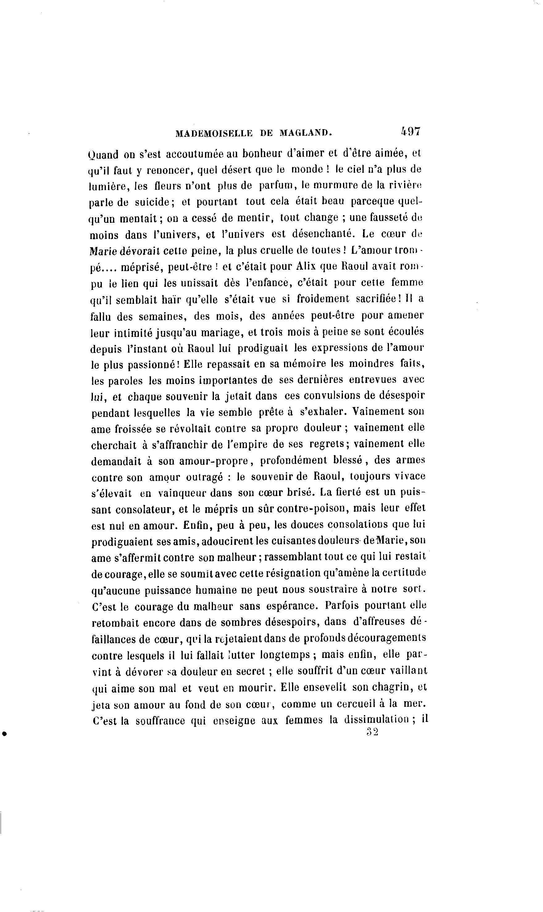 MADEMOISELLE DE MAGLAND. 497 Quand on s'est accoutumée au bonheur d'aimer et d'être aimée, et qu'il faut y renoncer, quel désert que le monde ! le ciel n'a plus de lumière, les fleurs n'ont plus de parfum, le murmure de la rivière parle de suicide; et pourtant tout cela était beau parceque quel- qu'un mentait ; on a cessé de mentir, tout change ; une fausseté de moins dans l'univers, et l'univers est désenchanté. Le cœur de Marie dévorait cette peine, la plus cruelle de toutes ! L'amour troni - pé.... méprisé, peut-être ! et c'était pour Alix que Raoul avait rom- pu le lien qui les unissait dès l'enfance, c'était pour cette femme qu'il semblait haïr qu'elle s'était vue si froidement sacrifiée! Il a fallu des semaines, des mois, des années peut-être pour amener leur intimité jusqu'au mariage, et trois mois à peine se sont écoulés depuis l'instant où Raoul lui prodiguait les expressions de l'amour le plus passionné! Elle repassait en sa mémoire les moindres faits, les paroles les moins importantes de ses dernières entrevues avec lui, et chaque souvenir la jetait dans ces convulsions de désespoir pendant lesquelles la vie semble prête à s'exhaler. Vainement son ame froissée se révoltait contre sa propre douleur ; vainement elle cherchait à s'affranchir de l'empire de ses regrets; vainement elle demandait à son amour-propre, profondément blessé, des armes contre son amour outragé : le souvenir de Raoul, toujours vivace s'élevait en vainqueur dans son cœur brisé. La fierté est un puis- sant consolateur, et le mépris un sûr contre-poison, mais leur effet est nul en amour. Enfin, peu à peu, les douces consolations que lui prodiguaient ses amis, adoucirent les cuisantes douleurs deMarie, son ame s'affermit contre son malheur ; rassemblant tout ce qui lui restait de courage, elle se soumit avec cette résignation qu'amène la certitude qu'aucune puissance humaine ne peut nous soustraire à notre sort. C'est le courage du malheur sans espérance. Parfois pourtant elle retombait encore dans de sombres désespoirs, dans d'affreuses dé- faillances de cœur, qi'i la rejetaient dans de profonds découragements contre lesquels il lui fallait lutter longtemps; mais enfin, elle par- vint à dévorer sa douleur en secret ; elle souffrit d'un cœur vaillant qui aime son mal et veut en mourir. Elle ensevelit son chagrin, et jeta son amour au fond de son cœur, comme un cercueil à la mer. C'est la souffrance qui enseigne aux femmes la dissimulation ; il