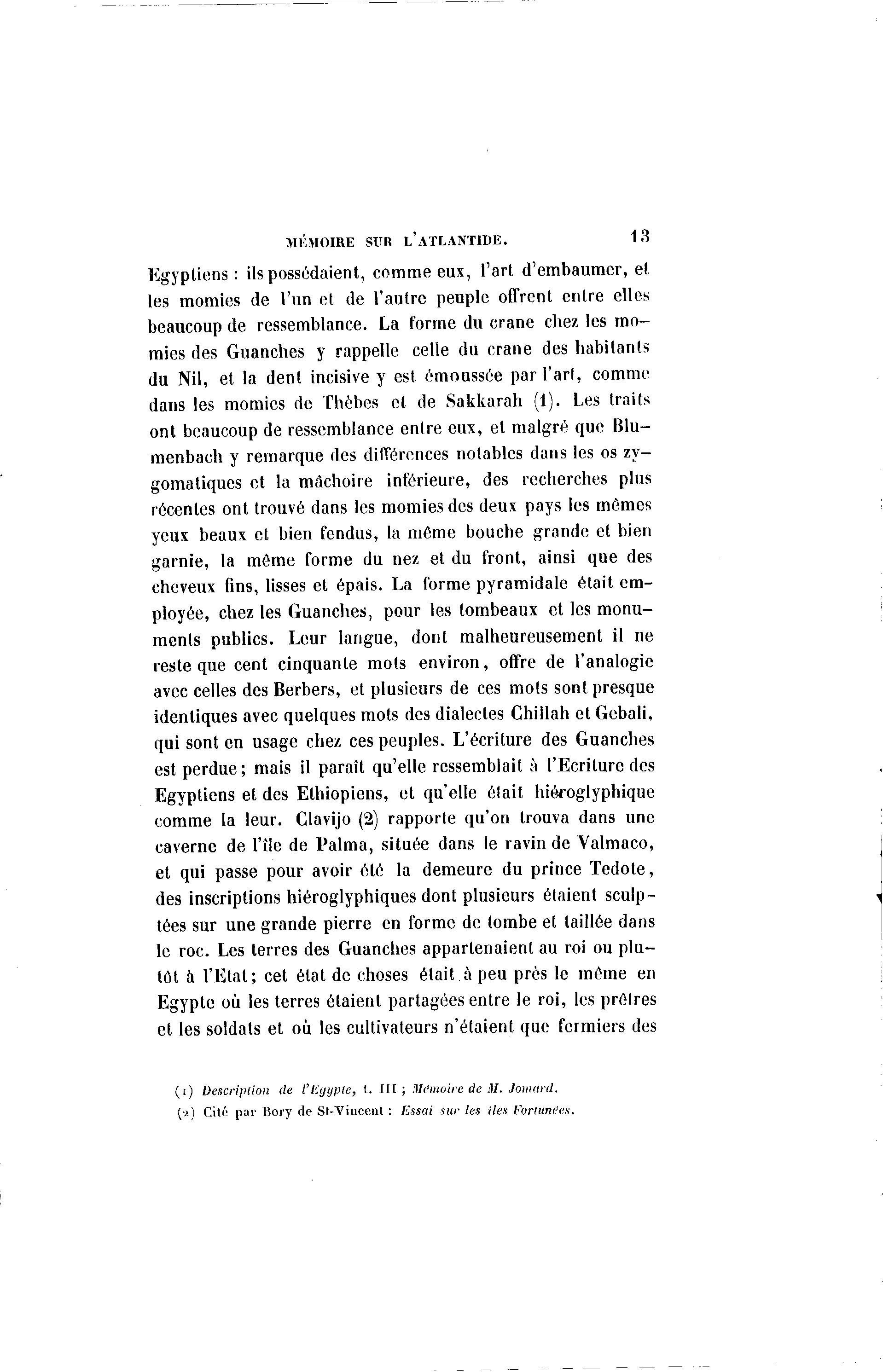 MÉMOIRE SUR L'ATLANTIDE. 13 Egyptiens : ils possédaient, comme eux, l'art d'embaumer, et les momies de l'un et de l'autre peuple offrent entre elles beaucoup de ressemblance. La forme du crâne chez les mo- mies des Guanches y rappelle celle du crâne des habitants du Nil, et la denl incisive y est émoussée par l'art, comme dans les momies de Thèbes et de Sakkarah (1). Les traits ont beaucoup de ressemblance entre eux, et malgré que Blu- menbach y remarque des différences notables dans les os zy- gomatiques et la mâchoire inférieure, des recherches plus récentes ont trouvé dans les momies des deux pays les mêmes yeux beaux et bien fendus, la même bouche grande et bien garnie, la môme forme du nez et du front, ainsi que des cheveux fins, lisses et épais. La forme pyramidale était em- ployée, chez les Guanches, pour les tombeaux et les monu- ments publics. Leur langue, dont malheureusement il ne reste que cent cinquante mots environ, offre de l'analogie avec celles des Berbers, et plusieurs de ces mots sont presque identiques avec quelques mots des dialectes Chillah et Gebali, qui sont en usage chez ces peuples. L'écriture des Guanches est perdue; mais il paraît qu'elle ressemblait à l'Ecriture des Egyptiens et des Ethiopiens, et qu'elle était hiéroglyphique comme la leur. Glavijo (2) rapporte qu'on trouva dans une caverne de l'île de Palma, située dans le ravin de Valmaco, et qui passe pour avoir été la demeure du prince Tedote, des inscriptions hiéroglyphiques dont plusieurs étaient sculp- tées sur une grande pierre en forme de tombe et taillée dans le roc. Les terres des Guanches appartenaient au roi ou plu- tôt à l'Etat; cet état de choses était à peu prés le môme en Egypte où les terres étaient partagées entre le roi, les prôlres et les soldats et où les cultivateurs n'étaient que fermiers des ( i ) Description de t'Hyyple, t. I I I ; ilh'moire de M. Jomard. (a) Cité par Bory de St-Vincent : /«soi sur les (les Forwnt'es.