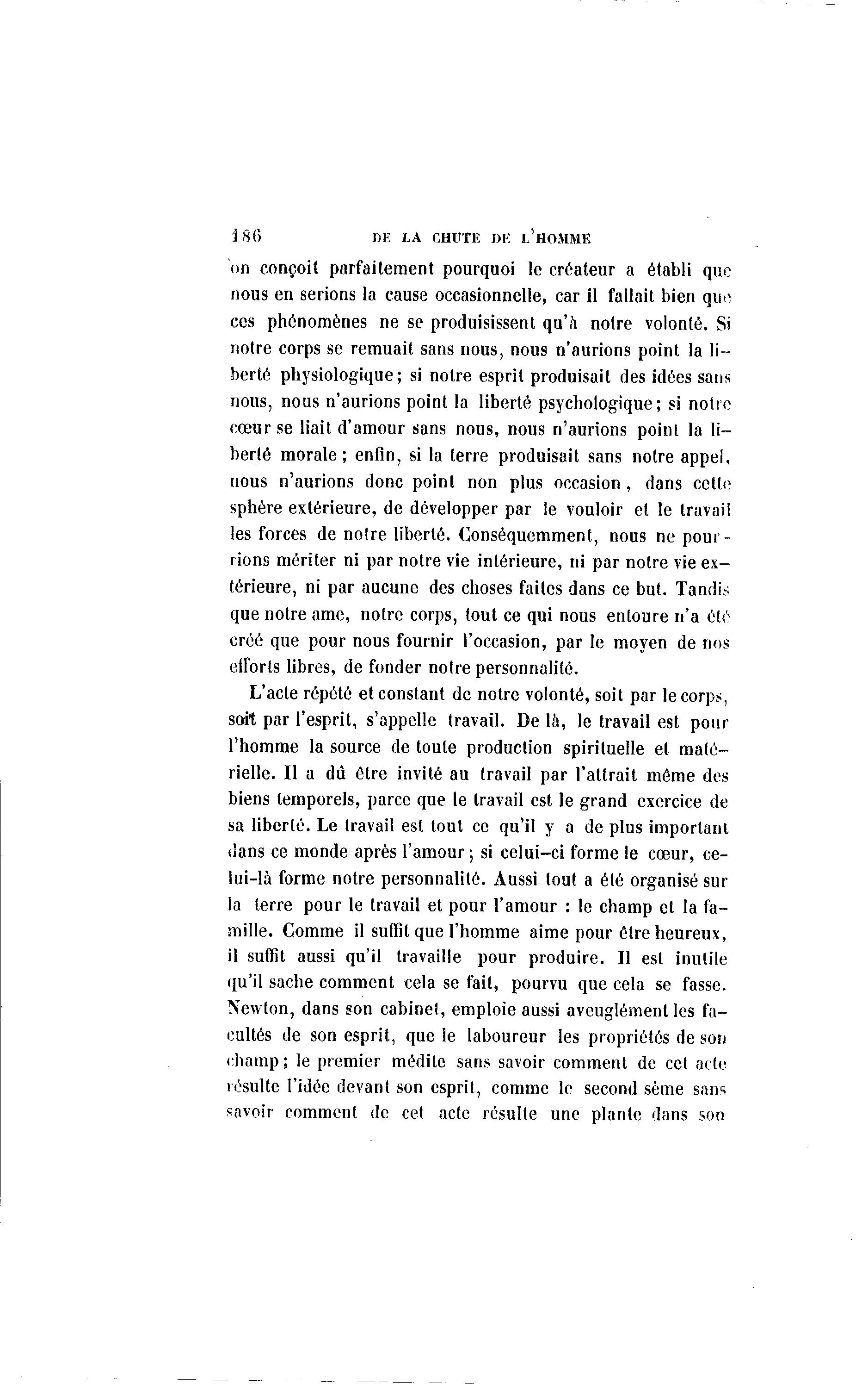 J8f> DE LA CHUTE DE L'HOMME on conçoit parfaitement pourquoi le créateur a établi que nous en serions la cause occasionnelle, car il fallait bien que ces phénomènes ne se produisissent qu'à notre volonté. Si notre corps se remuait sans nous, nous n'aurions point la li- berté physiologique; si notre esprit produisait des idées sans nous, nous n'aurions point la liberté psychologique; si notre cœur se liait d'amour sans nous, nous n'aurions point la li- berlé morale; enfin, si la terre produisait sans notre appel, nous n'aurions donc point non plus occasion , dans cette sphère extérieure, de développer par le vouloir et le travail les forces de noire liberté. Conséqucmment, nous ne pour- rions mériter ni par notre vie intérieure, ni par notre vie ex- térieure, ni par aucune des choses faites dans ce but. Tandis que notre ame, notre corps, tout ce qui nous entoure n'a été créé que pour nous fournir l'occasion, par le moyen de nos efforts libres, de fonder noire personnalité. L'acte répété et constant de notre volonté, soit par le corps, soit par l'esprit, s'appelle travail. De la, le travail est pour l'homme la source de toute production spirituelle et maté- rielle. Il a dû être invité au travail par l'attrait môme des biens temporels, parce que le travail est le grand exercice de sa liberlé. Le travail est tout ce qu'il y a de plus important dans ce monde après l'amour ; si celui-ci forme le cœur, ce- lui-là forme notre personnalité. Aussi tout a été organisé sur la terre pour le travail et pour l'amour : le champ et la fa- mille. Comme il suffit que l'homme aime pour être heureux, il suffit aussi qu'il travaille pour produire. Il est inutile qu'il sache comment cela se fait, pourvu que cela se fasse. Newton, dans son cabinet, emploie aussi aveuglément les fa- cultés de son esprit, que le laboureur les propriétés de son champ; le premier médite sans savoir comment de cet acte résulte l'idée devant son esprit, comme le second sème sans savoir comment de cet acte résulte une plante dans son