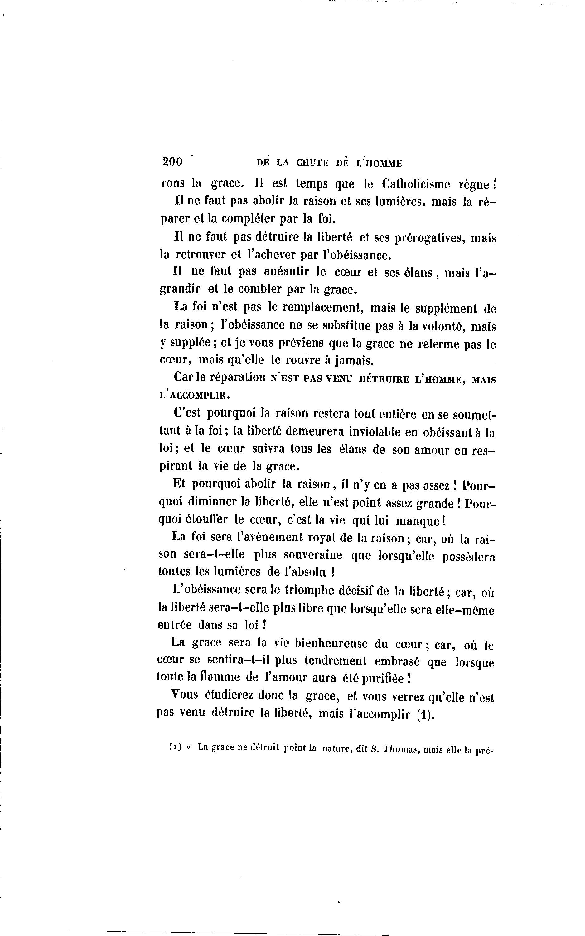 âOO DE LA CHUTE DE LHOMME rons la grâce. Il est temps que le Catholicisme règne î II ne faut pas abolir la raison et ses lumières, mais la ré- parer et la compléter par la foi. Il ne faut pas détruire la liberté et ses prérogatives, mais la retrouver et l'achever par l'obéissance. Il ne faut pas anéantir le cœur et ses élans, mais l'a- grandir et le combler par la grâce. La foi n'est pas le remplacement, mais le supplément de la raison ; l'obéissance ne se substitue pas à la volonté, mais y supplée ; et je vous préviens que la grâce ne referme pas le cœur, mais qu'elle le rouvre à jamais. Car la réparation N'EST PAS VENU DÉTRUIRE L'HOMME, MAIS L'ACCOMPLIR. C'est pourquoi la raison restera tout entière en se soumet- tant à la foi; la liberté demeurera inviolable en obéissant à la loi ; et le cœur suivra tous les élans de son amour en res- pirant la vie de la grâce. Et pourquoi abolir la raison, il n'y en a pas assez ! Pour- quoi diminuer la liberté, elle n'est point assez grande ! Pour- quoi étouffer le cœur, c'est la vie qui lui manque ! La foi sera l'avènement royal de la raison ; car, où la rai- son sera-t-elle plus souveraine que lorsqu'elle possédera toutes les lumières de l'absolu ! L'obéissance sera le triomphe décisif de la liberté ; car, où la liberté sera-t-elle plus libre que lorsqu'elle sera elle-même entrée dans sa loi ! La grâce sera la vie bienheureuse du cœur ; car, où le cœur se sentira-t-il plus tendrement embrasé que lorsque toute la flamme de l'amour aura été purifiée ! Vous étudierez donc la grâce, et vous verrez qu'elle n'est pas venu détruire la liberté, mais l'accomplir (1). (î) « La grâce ne détruit point la nature, dit S. Thomas, mais elle la pré-