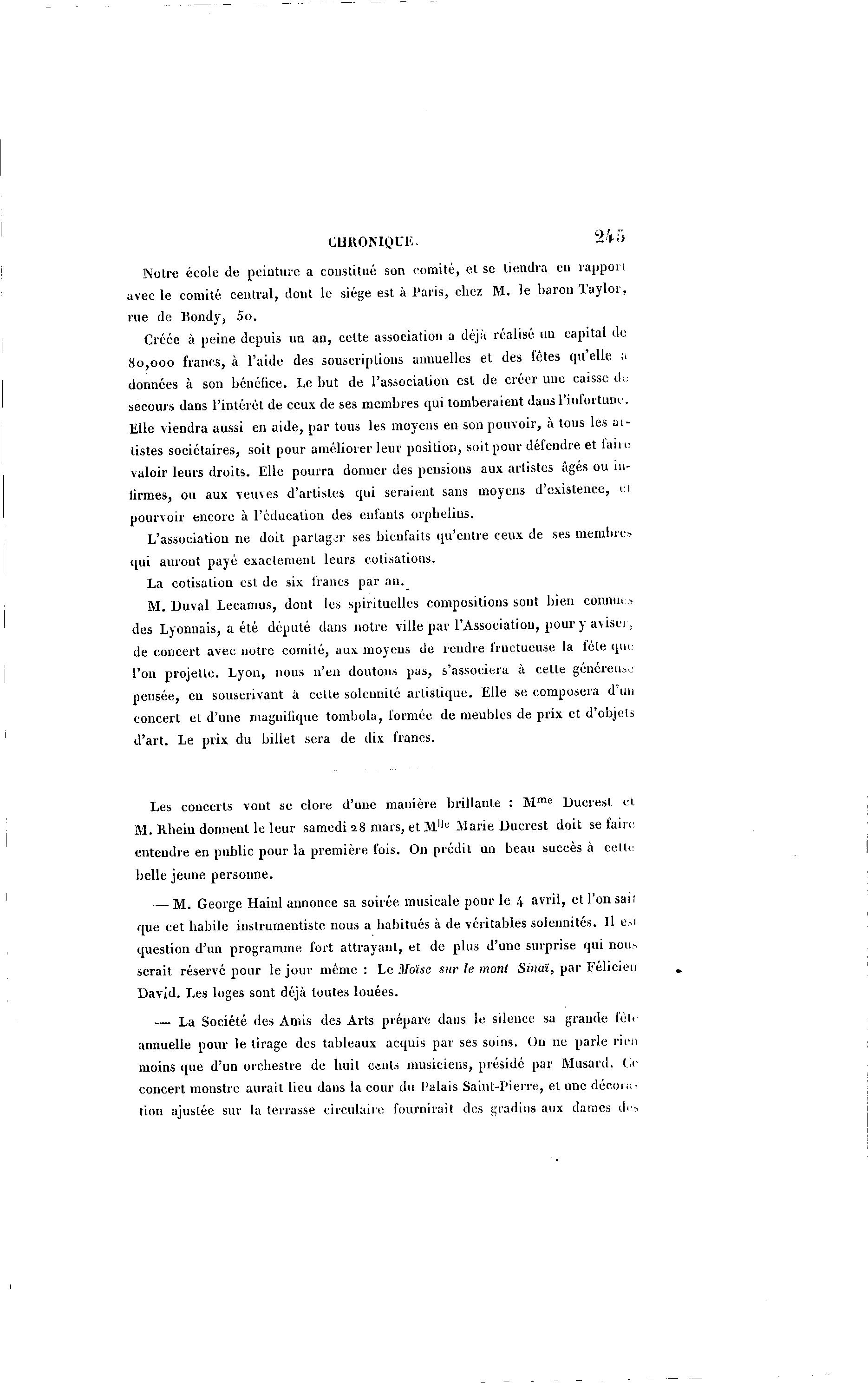 CHRONIQUK. 245 Noire école de peinture a constitué son comité, et se tiendra en rapport avec le comité central, dont le siège est à Paris, chez M. le baron Taylor, rue de Bondy, 5o. Créée à peine depuis un au, celte association a déjà réalisé uu capital de 8 0 , 0 0 0 francs, à l'aide des souscriptions annuelles et des fêtes qu'elle a données à son bénéfice. Le but de l'association est de créer une caisse di: secours dans l'intérêt de ceux de ses membres qui tomberaient dans l'infortune. Elle viendra aussi en aide, par tous les moyens en son pouvoir, à tous les al- tistes sociétaires, soit pour améliorer leur position, soit pour défendre et faire valoir leurs droits. Elle pourra donner des pensions aux artistes âgés ou in- firmes, ou aux veuves d'artistes qui seraient sans moyens d'existence, ci pourvoir encore à l'éducation des enfants orphelins. L'association ne doit partager ses bienfaits qu'entre ceux de ses membre» qui auront payé exactement leurs cotisations. La cotisation est de six francs par an. M. Duval Lecamus, dont les spirituelles compositions sont bien connut., des Lyonnais, a été député dans notre ville par l'Association, pour y aviser, de concert avec notre comité, aux moyens de rendre fructueuse la fêle que l'on projette. Lyon, nous n'en doutons pas, s'associera à cette généreux pensée, en souscrivant à cette solennité artistique. Elle se composera d'un concert et d'une inaguilique tombola, formée de meubles de prix et d'objeU d'art. Le prix du billet sera de dix francs. Les concerts vont se clore d'une manière brillante : M m t ; Ducrest et M . Rbein donnent le leur samedi 28 mars, et M.',e Marie Ducrest doit se faire entendre en public pour la première fois. On prédit un beau succès à cetlc belle jeune personne. — M . George Hainl annonce sa soirée musicale pour le 4 avril, et l'on saii que cet habile instrumentiste nous a habitués à de véritables solennités. Il e*l question d'un programme fort attrayant, et de plus d'une surprise qui non-, serait réservé pour le jour même : Le Moïse sur le mont Sinaï, par Félicien David. Les loges sont déjà toutes louées. — La Société des Amis des Arts prépare dans le silence sa grande fêle annuelle pour le tirage des tableaux acquis par ses soins. Ou ne parle rien moins que d'un orchestre de huil cents musiciens, préside par Musard. O concert monstre aurait lieu dans la cour du Palais Saint-Pierre, et une décora lion ajuslée sur la terrasse circulaire fournirait des gradins aux dames d e