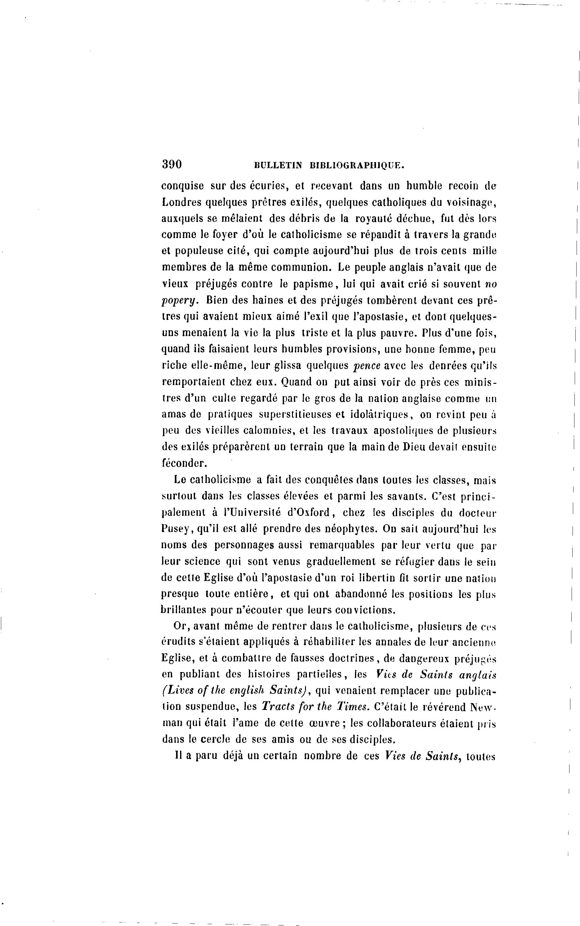390 BULLETIN BIBLIOGRAPHIQUE. conquise sur des écuries, et recevant dans un humble recoin de Londres quelques prêtres exilés, quelques catholiques du voisinage, auxquels se mêlaient des débris de la royauté déchue, fut dès lors comme le foyer d'où le catholicisme se répandit à travers la grande et populeuse cité, qui compte aujourd'hui plus de trois cents mille membres de la même communion. Le peuple anglais n'avait que de vieux préjugés contre le papisme, lui qui avait crié si souvent «o popery. Bien des haines et des préjugés tombèrent devant ces prê- tres qui avaient mieux aimé l'exil que l'apostasie, et dont quelques- uns menaient la vie la plus triste et la plus pauvre. Plus d'une fois, quand ils faisaient leurs humbles provisions, une bonne femme, peu riche elle-même, leur glissa quelques pence avec les denrées qu'ils remportaient chez eux. Quand on put ainsi voir de près ces minis- ires d'un culte regardé par le gros de la nation anglaise comme un amas de pratiques superstitieuses et idolâtriques, on revint peu à peu des vieilles calomnies, et les travaux apostoliques de plusieurs des exilés préparèrent un terrain que la main de Dieu devai! ensuite féconder. Le catholicisme a fait des conquêtes dans toutes les classes, mais surtout dans les classes élevées et parmi les savants. C'est princi- palement à l'Université d'Oxford, chez les disciples du docteur Pusey, qu'il est allé prendre des néophytes. On sait aujourd'hui les noms des personnages aussi remarquables par leur vertu que par leur science qui sont venus graduellement se réfugier daus le sein de celte Eglise d'où l'apostasie d'un roi libertin fit sortir une nation presque toute entière, et qui ont abandonné les positions les plus brillantes pour n'écouter que leurs convictions. Or, avant même de rentrer dans le catholicisme, plusieurs de ces érudits s'étaient appliqués à réhabiliter les annales de leur ancienne! Eglise, et à combattre de fausses doctrines, de dangereux préjugés en publiant des histoires partielles, les Vies de Saints anglais (Lives ofthe english Saints), qui venaient remplacer une publica- tion suspendue, les Tracts for the Times. C'était le révérend New- mari qui était l'ame de cette œuvre; les collaborateurs étaient pris dans le cercle de ses amis ou de ses disciples. Il a paru déjà un certain nombre de ces Vies de Saints, toutes