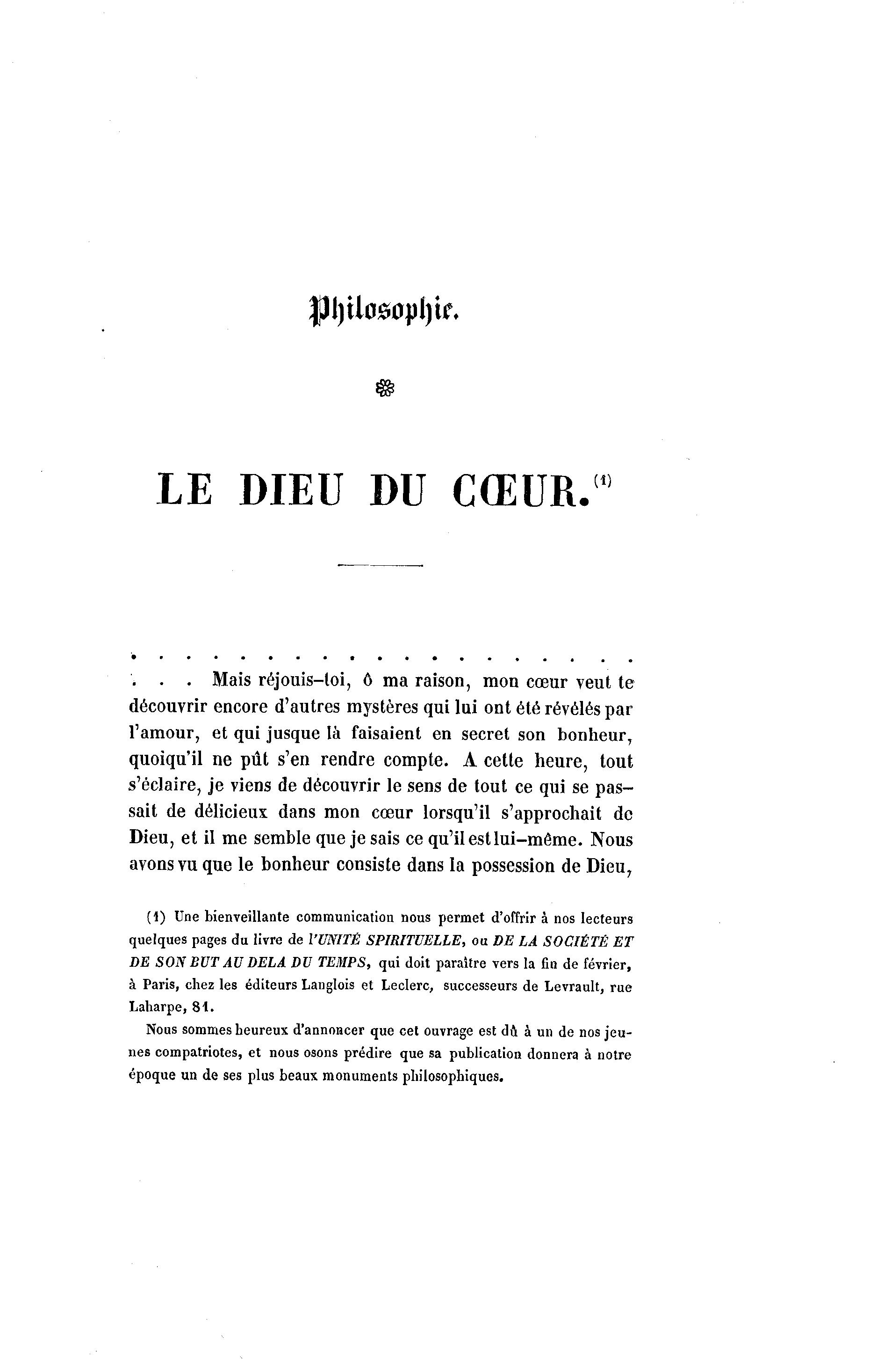 LE DIEU DU CŒUR. . . . Mais réjouis-loi, 6 ma raison, mon cœur veut te découvrir encore d'autres mystères qui lui ont été révélés par l'amour, et qui jusque là faisaient en secret son bonheur, quoiqu'il ne pût s'en rendre compte. A cette heure, tout s'éclaire, je viens de découvrir le sens de tout ce qui se pas- sait de délicieux dans mon cœur lorsqu'il s'approchait de Dieu, et il me semble que je sais ce qu'il est lui-même. Nous avons vu que le bonheur consiste dans la possession de Dieu, (1) Une bienveillante communication nous permet d'offrir à nos lecteurs quelques pages du livre de l'UNITÊ SPIRITUELLE, ou DE LA SOCIÉTÉ ET DE SON BUT AU DELÀ DU TEMPS, qui doit paraître vers la fin de février, à Paris, chez les éditeurs Langlois et Leclerc, successeurs de Levrault, rue Laharpe, 8 1 . Nous sommes heureux d'annoncer que cet ouvrage est dû à un de nos jeu- nes compatriotes, et nous osons prédire que sa publication donnera à notre époque un de ses plus beaux monuments philosophiques.