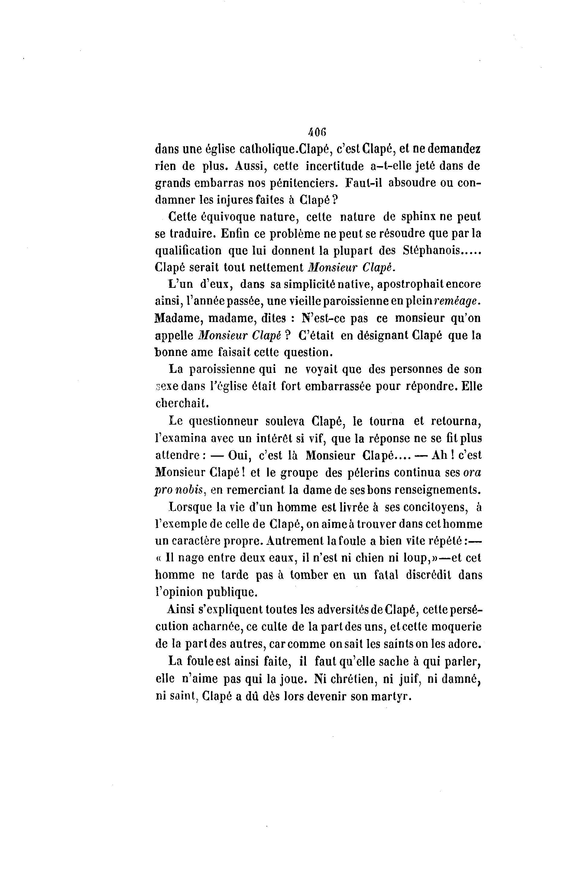 406 dans une église calholique.Clapé, c'est Clapé, et ne demandez rien de plus. Aussi, cette incertitude a-t-elle jeté dans de grands embarras nos pénitenciers. Faut-il absoudre ou con- damner les injures faites à Clapé ? Cette équivoque nature, cette nature de sphinx ne peut se traduire. Enfin ce problème ne peut se résoudre que par la qualification que lui donnent la plupart des Stéphanois Clapé serait tout nettement Monsieur Clapé. L'un d'eux, dans sa simplicité native, apostrophait encore ainsi, l'année passée, une vieille paroissienne en pleinreméage. Madame, madame, dites : N'est-ce pas ce monsieur qu'on appelle Monsieur Clapé ? C'était en désignant Clapé que la bonne ame faisait cette question. La paroissienne qui ne voyait que des personnes de son sexe dans l'église était fort embarrassée pour répondre. Elle cherchait. Le questionneur souleva Clapé, le tourna et retourna, l'examina avec un intérêt si vif, que la réponse ne se fit plus attendre: — Oui, c'est là Monsieur Clapé.... — Ah ! c'est Monsieur Clapé ! et le groupe des pèlerins continua ses ora pro nobis, en remerciant la dame de ses bons renseignements. Lorsque la vie d'un homme est livrée à ses concitoyens, à l'exemple de celle de Clapé, on aimeà trouver dans cethomme un caractère propre. Autrement la foule a bien vite répété :— « Il nage entre deux eaux, il n'est ni chien ni loup,»—et cet homme ne tarde pas à tomber en un fatal discrédit dans l'opinion publique. Ainsi s'expliquent toutes les adversités de Clapé, cette persé- cution acharnée, ce culte de la part des uns, etcette moquerie de la part des autres, car comme on sait les saints on les adore. La foule est ainsi faite, il faut qu'elle sache à qui parler, elle n'aime pas qui la joue. Ni chrétien, ni juif, ni damné, ni saint, Clapé a dû dès lors devenir son martyr.