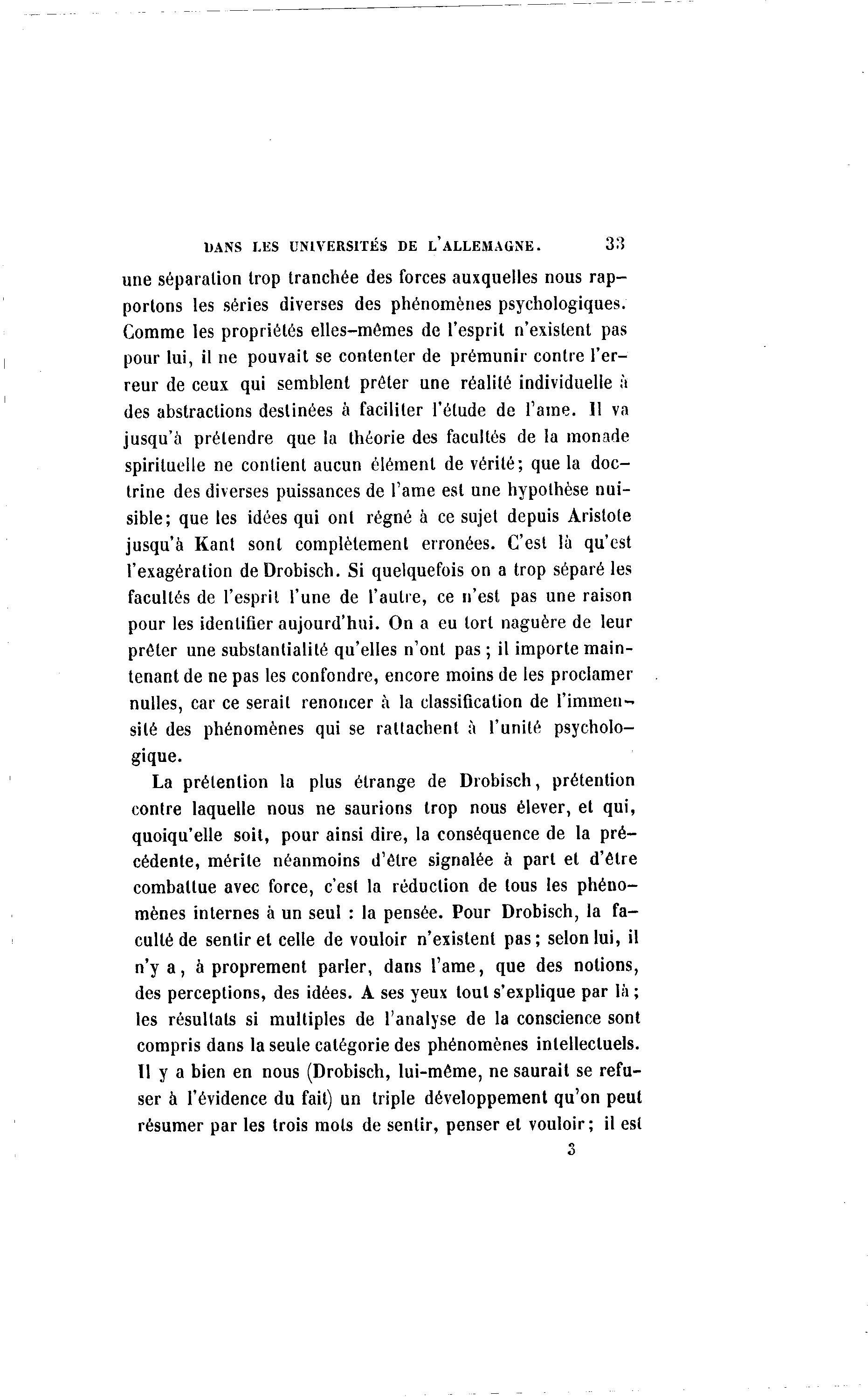 DANS LES UNIVERSITÉS DE L'ALLEMAGNE. 33 une séparation trop tranchée des forces auxquelles nous rap- portons les séries diverses des phénomènes psychologiques. Gomme les propriétés elles-mêmes de l'esprit n'existent pas pour lui, il ne pouvait se contenter de prémunir contre l'er- reur de ceux qui semblent prêter une réalité individuelle à des abstractions destinées à faciliter l'étude de Paine. 11 va jusqu'à prétendre que la théorie des facultés de la monade spirituelle ne contient aucun élément de vérité; que la doc- trine des diverses puissances de Pâme est une hypothèse nui- sible; que les idées qui ont régné à ce sujet depuis Aristole jusqu'à Kant sont complètement erronées. C'est là qu'est l'exagération de Drobisch. Si quelquefois on a trop séparé les facultés de l'esprit l'une de l'autre, ce n'est pas une raison pour les identifier aujourd'hui. On a eu tort naguère de leur prêter une substantialité qu'elles n'ont pas ; il importe main- tenant de ne pas les confondre, encore moins de les proclamer nulles, car ce serait renoncer à la classification de l'immen-* site des phénomènes qui se rattachent à l'unité psycholo- gique. La prétention la plus étrange de Drobisch, prétention contre laquelle nous ne saunons trop nous élever, et qui, quoiqu'elle soit, pour ainsi dire, la conséquence de la pré- cédente, mérite néanmoins d'être signalée à part et d'être combattue avec force, c'est la réduction de tous les phéno- mènes internes à un seul : la pensée. Pour Drobisch, la fa- culté de sentir et celle de vouloir n'existent pas; selon lui, il n'y a, à proprement parler, dans Pâme, que des notions, des perceptions, des idées. A ses yeux tout s'explique par là ; les résultats si multiples de l'analyse de la conscience sont compris dans la seule catégorie des phénomènes intellectuels. Il y a bien en nous (Drobisch, lui-même, ne saurait se refu- ser à l'évidence du fait) un triple développement qu'on peut résumer par les trois mots de sentir, penser et vouloir; il est 3