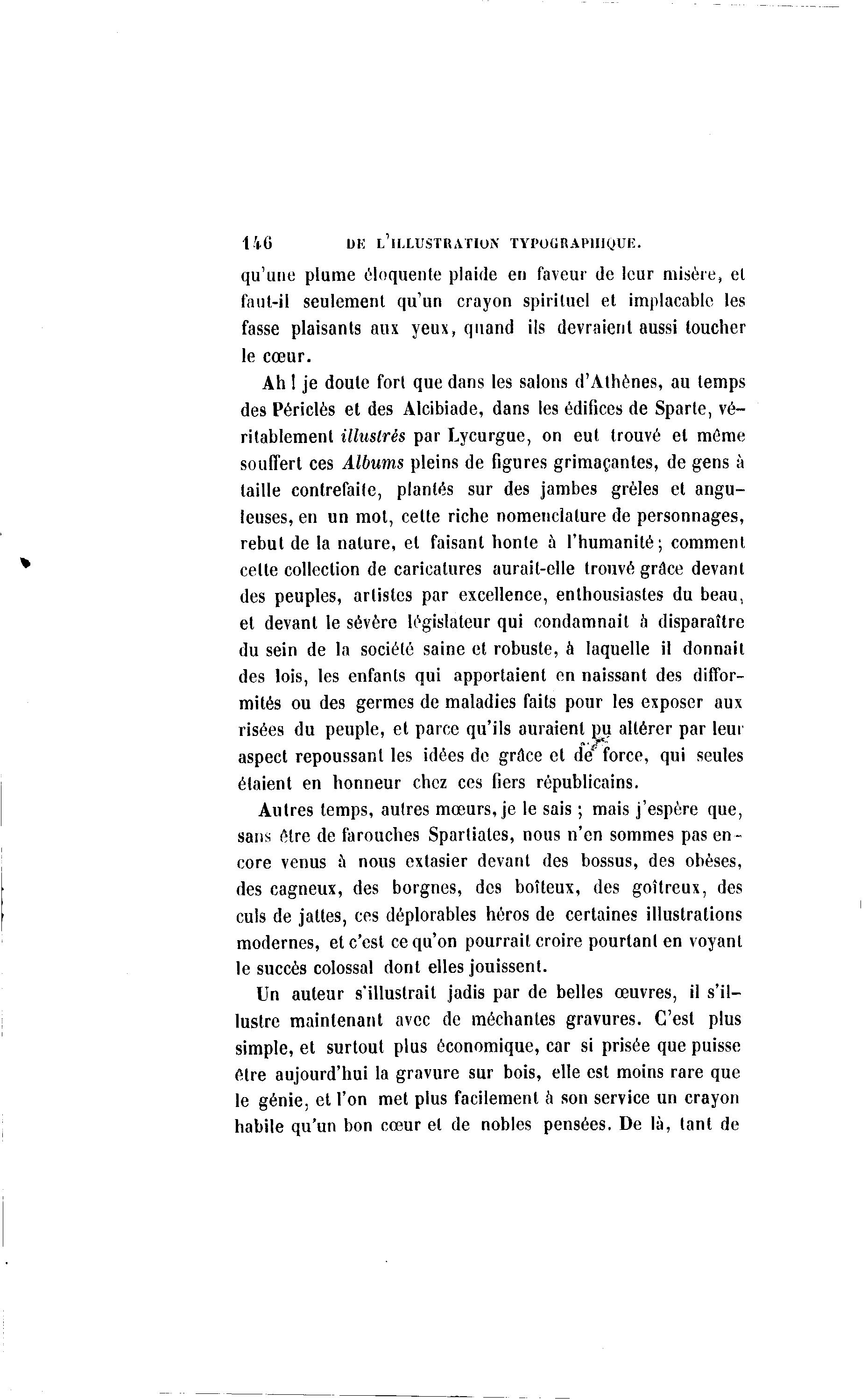 liC UK L'ILLUSTRATION' TYPOGRAPHIQUE. qu'une plume éloquente plaide en faveur de leur misère, et faut-il seulement qu'un crayon spirituel et implacable les fasse plaisants aux yeux, quand ils devraient aussi toucher le cœur. Ah ! je doute fort que dans les salons d'Athènes, au temps des Périclès et des Alcibiade, dans les édifices de Sparte, vé- ritablement illustrés par Lycurgue, on eut trouvé et même souffert ces Albums pleins de figures grimaçantes, de gens à taille contrefaite, plantés sur des jambes grêles et angu- leuses, en un mot, cette riche nomenclature de personnages, rebut de la nature, et faisant honte à l'humanité; comment celte collection de caricatures aurait-elle trouvé grâce devant des peuples, artistes par excellence, enthousiastes du beau, et devant le sévère législateur qui condamnait à disparaître du sein de la société saine et robuste, à laquelle il donnait des lois, les enfants qui apportaient en naissant des diffor- mités ou des germes de maladies faits pour les exposer aux risées du peuple, et parce qu'ils auraient pu altérer par leur aspect repoussant les idées de grâce el Aé force, qui seules étaient en honneur chez ces fiers républicains. Autres temps, autres mœurs, je le sais ; mais j'espère que, sans être de farouches Spartiates, nous n'en sommes pas en- core venus à nous extasier devant des bossus, des obèses, des cagneux, des borgnes, des boîteux, des goitreux, des culs de jattes, ces déplorables héros de certaines illustrations modernes, et c'est ce qu'on pourrait croire pourtant en voyant le succès colossal dont elles jouissent. Un auteur s'illustrait jadis par de belles œuvres, il s'il- lustre maintenant avec de méchantes gravures. C'est plus simple, et surtout plus économique, car si prisée que puisse être aujourd'hui la gravure sur bois, elle est moins rare que le génie, et l'on met plus facilement à son service un crayon habile qu'un bon cœur et de nobles pensées. De là , tant de