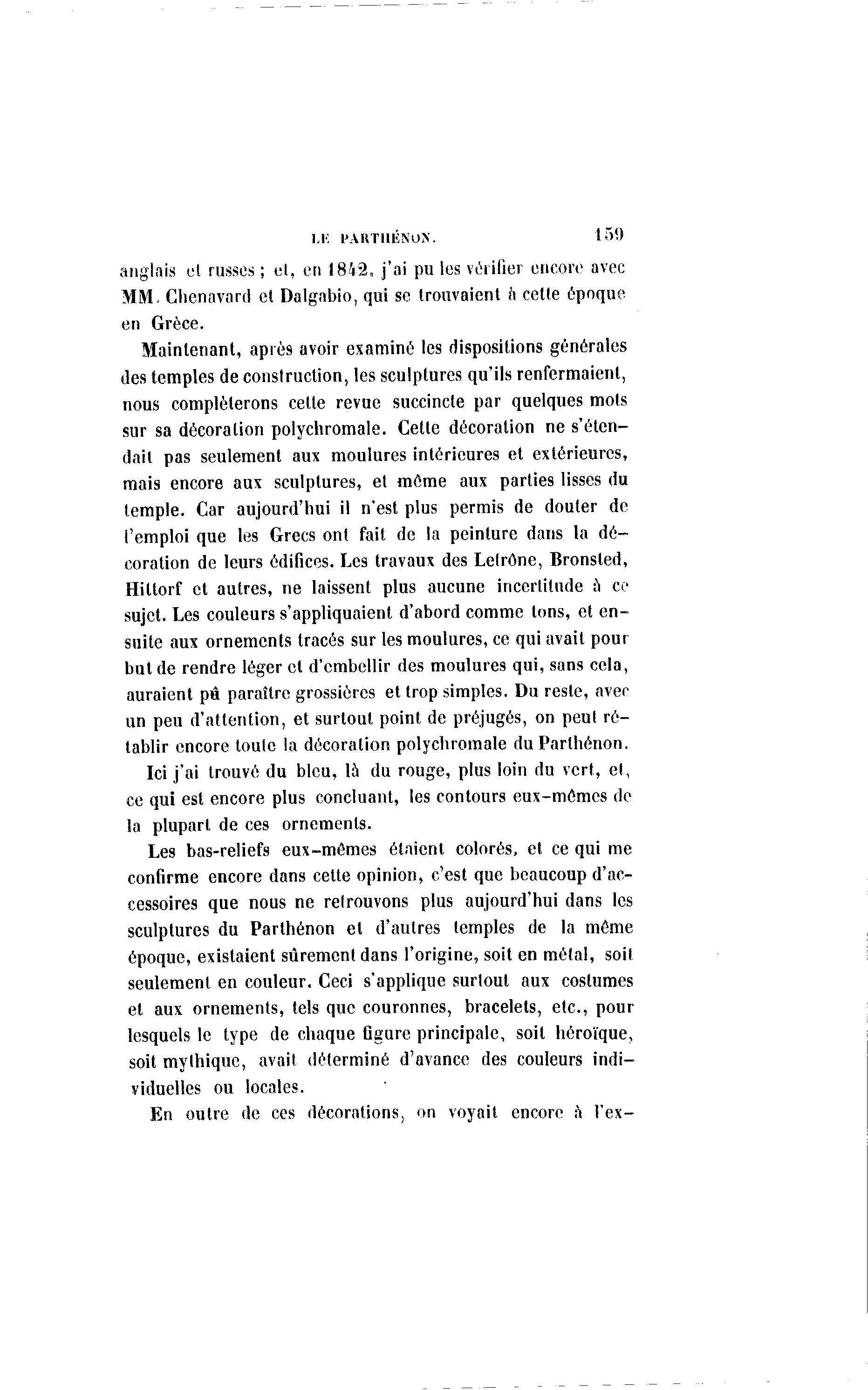 l.K FARTIIÉNOÎS'. i">9 anglais et russes ; et, en 1842, j'ai pu les vérifier encore avec MM. Chenavard et Dalgabio, qui se trouvaient a cette époque en Grèce. Maintenant, après avoir examiné les dispositions générales des temples de construction, les sculptures qu'ils renfermaient, nous compléterons celte revue succincte par quelques mots sur sa décoration polychromale. Cette décoration ne s'éten- dait pas seulement aux moulures intérieures et extérieures, mais encore aux sculptures, et môme aux parties lisses du temple. Car aujourd'hui il n'est plus permis de douter de l'emploi que les Grecs ont fait de la peinture dans la dé- coration de leurs édifices. Les travaux des Letrône, Bronsled, Hittorf et autres, ne laissent plus aucune incertitude à ce sujet. Les couleurs s'appliquaient d'abord comme tons, et en- suite aux ornements tracés sur les moulures, ce qui avait pour but de rendre léger et d'embellir des moulures qui, sans cela, auraient pu paraître grossières et trop simples. Du reste, avec un peu d'attention, et surtout point de préjugés, on peut ré- tablir encore toute la décoration polychromale du Parthénon. Ici j'ai trouvé du bleu, là du rouge, plus loin du vert, et, ce qui est encore plus concluant, les contours eux-mêmes de la plupart de ces ornements. Les bas-reliefs eux-mêmes étaient colorés, et ce qui me confirme encore dans cette opinion, c'est que beaucoup d'ac- cessoires que nous ne retrouvons plus aujourd'hui dans les sculptures du Parthénon et d'autres temples de la même époque, existaient sûrement dans l'origine, soit en métal, soit seulement en couleur. Ceci s'applique surtout aux costumes et aux ornements, tels que couronnes, bracelets, etc., pour lesquels le type de chaque figure principale, soit héroïque, soit mythique, avait déterminé d'avance des couleurs indi- viduelles ou locales. En outre de ces décorations, on voyait encore à l'ex-
