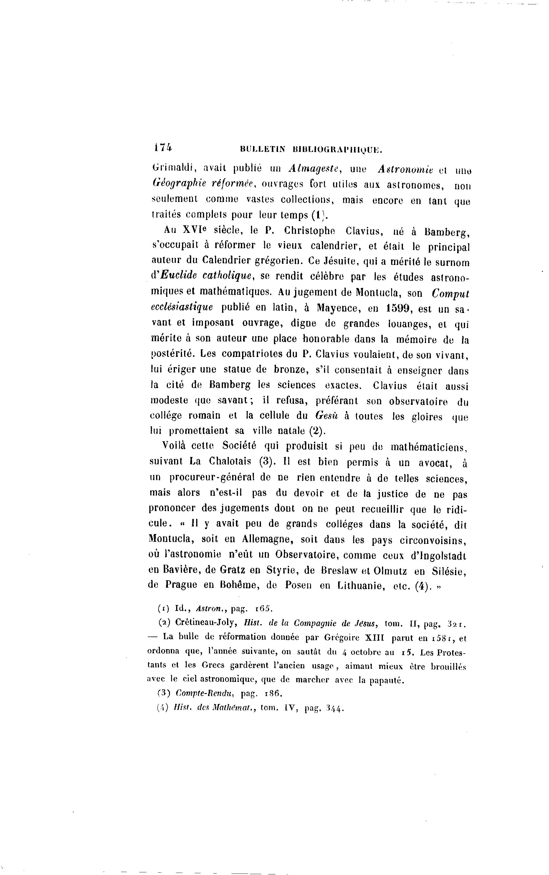 174 BULLETIN BIULlOGUAl'IlIOUt;. Grimaldi, avait publié un Almageste, une Astronomie et une Géographie réformée, ouvrages fort utiles aux astronomes, non seulement comme vastes collections, mais encore en tant que traités complets pour leur temps (1). Au XVIe siècle, le P. Christophe Clavius, né à Bamberg, s'occupait à réformer le vieux calendrier, et était le principal auteur du Calendrier grégorien. Ce Jésuite, qui a mérité le surnom d'Euclide catholique, se rendit célèbre par les études astrono- miques et mathématiques. Au jugement de Montucla, son Comput ecclésiastique publié en latin, à Mayence, en 1599, est un sa- vant et imposant ouvrage, digne de grandes louanges, et qui mérite à son auteur une place honorable dans la mémoire de la postérité. Les compatriotes du P. Clavius voulaient, de son vivant, lui ériger une statue de bronze, s'il consentait à enseigner dans la cité de Bamberg les sciences exactes. Clavius était aussi modeste que savant; il refusa, préférant son observatoire du collège romain et la cellule du Gesù à toutes les gloires que lui promettaient sa ville natale (2). Voilà cette Société qui produisit si peu de mathématiciens, suivant La Chalotais (3). Il est bien permis à un avocat, à un procureur-général de ne rien entendre à de telles sciences, mais alors n'est-il pas du devoir et de la justice de ne pas prononcer des jugements dout on ne peut recueillir que le ridi- cule. « Il y avait peu de grands collèges dans la société, dit Montucla, soit en Allemagne, soit daus les pays circonvoisins, où l'astronomie n'eût un Observatoire, comme ceux d'ingolstadt en Bavière, de Gratz en Styrio, de Breslaw et Olmutz en Silésie, de Prague en Bohême, de Posen en Lithuanie, etc. (4). » (i) Id., Àstron., pag. i65. (a) Crêtineau-Joly, Hist. de la Compagnie de Jésus, tom. II, pag. .'iai. — La bulle de réformation donnée par Grégoire XIII parut en 158 r, et ordonna que, l'année suivante, on sautât du 4 octobre au i 5 . Les Protes- tants et les Grecs gardèrent l'ancien usage, aimant mieux être brouillés avec le ciel astronomique, que de marcher avec la papauté. (3) Compte-Rendu, pag. iSfi. (.',) Hist. des Matlidmat., tom. IV, pag. .^44.
