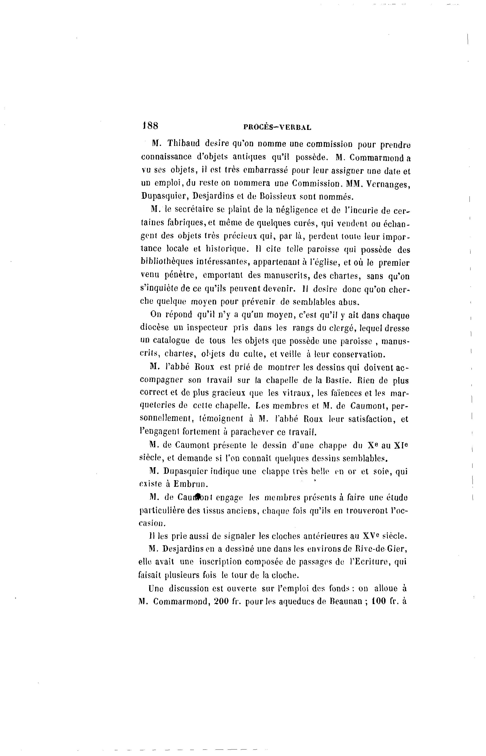 188 PROCÈS-VERBAL M. Thibaud désire qu'on nomme une commission pour prendre connaissance d'objets antiques qu'il possède. M. Commarmond a vu ses objets, il est très embarrassé pour leur assigner une date et un emploi, du reste on nommera une Commission. MM. Vernanges, Dupasquier, Desjardins et de Boissieux sont nommés. M. le secrétaire se plaint de la négligence et de l'incurie de cer- taines fabriques, et même de quelques curés, qui vendent ou échan- gent des objets très précieux qui, par là , perdent toute leur impor- tance locale et historique. 11 cite telle paroisse qui possède des bibliothèques intéressantes, appartenant à l'église, et où le premier venu pénètre, emportant des manuscrits, des chartes, sans qu'on s'inquiète de ce qu'ils peuvent devenir. Il désire donc qu'on cher- che quelque moyen pour prévenir de semblables abus. On répond qu'il n'y a qu'un moyen, c'est qu'il y ait dans chaque diocèse un inspecteur pris dans les rangs du clergé, lequel dresse un catalogue de tous les objets que possède une paroisse , manus- crits, chartes, objets du culte, et veille à leur conservation. M. l'abbé Roux est prié de montrer les dessins qui doivent ac- compagner son travail sur la chapelle de la Bastie. Rien de plus correct et do plus gracieux que les vitraux, les faïences et les mar- queteries de cette chapelle. Les membres et M. de Caumont, per- sonnellement, témoignent à M. l'abbé Roux leur satisfaction, et l'engagent fortement à parachever ce travail. M. de Caumont présente le dessin d'une chappe du X e au XI e siècle, et demande si l'on connaît quelques dessins semblables. M. Dupasquier indique une chappe très belle en or et soie, qui existe à Embrun. M. de Cautâonl engage les membres présents à faire une étude particulière des tissus anciens, chaque l'ois qu'ils en trouveront l'oc- casion. 11 les prie aussi de signaler les cloches antérieures au XV" siècle. M. Desjardins en a dessiné une dans les environs de Rive-de-Gier, elle avait une inscription composée de passages de l'Ecriture, qui faisait plusieurs fois le lourde la cloche. Une discussion est ouverte sur l'emploi des fonds : on alloue à M. Commarmond, 200 fr. pour les aqueducs de Beaunan ; 100 fr. Ã