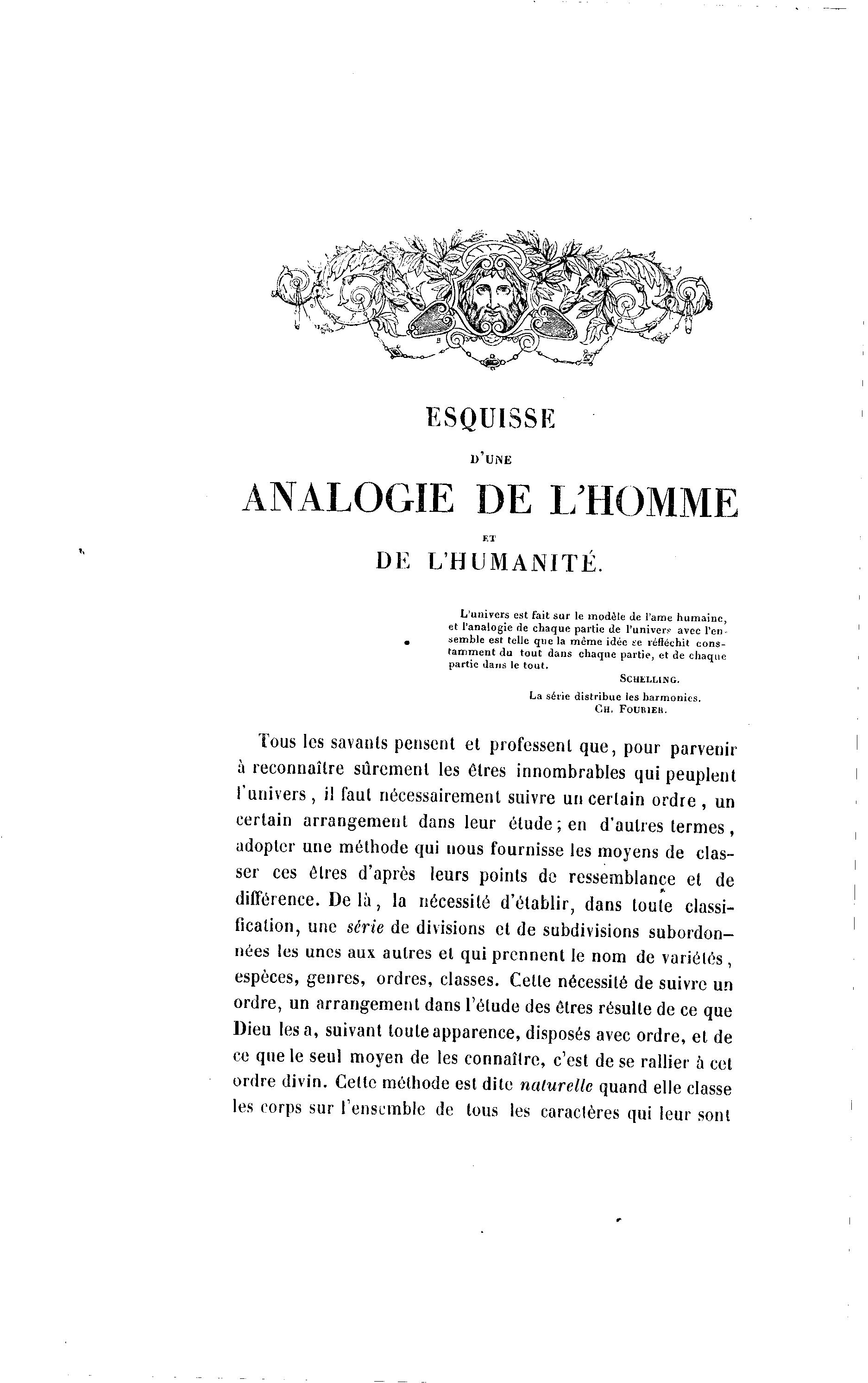 ESQUISSE D'UNE ANALOGIE DE L'HOMME ET DE L'HUMANITÉ. L'univers est fait sur le modèle de l'ame humaine, et l'analogie de chaque partie de l'univers avec l'en m semble est telle que la même idée se réfléchit cons- tamment du tout dans chaque partie, et de chaque partie dans le tout. SCHELUNG. La série distribue les harmonies. C.H. FOURIEH. Tous les savants pensent et professent que, pour parvenir à reconnaître sûrement les êtres innombrables qui peuplent l'univers , il faut nécessairement suivre un certain ordre , un certain arrangement dans leur étude ; en d'autres termes , adopter une méthode qui nous fournisse les moyens de clas- ser ces êtres d'après leurs points de ressemblance et de différence. De là , la nécessité d'établir, dans toute classi- fication, une série de divisions et de subdivisions subordon- nées les unes aux autres et qui prennent le nom de variétés, espèces, genres, ordres, classes. Cette nécessité de suivre un ordre, un arrangement dans l'élude des êtres résulte de ce que Dieu lésa, suivant toute apparence, disposés avec ordre, et de ce que le seul moyen de les connaître, c'est de se rallier à cet ordre divin. Celte méthode est dite naturelle quand elle classe les corps sur l'ensemble de tous les caractères qui leur sont