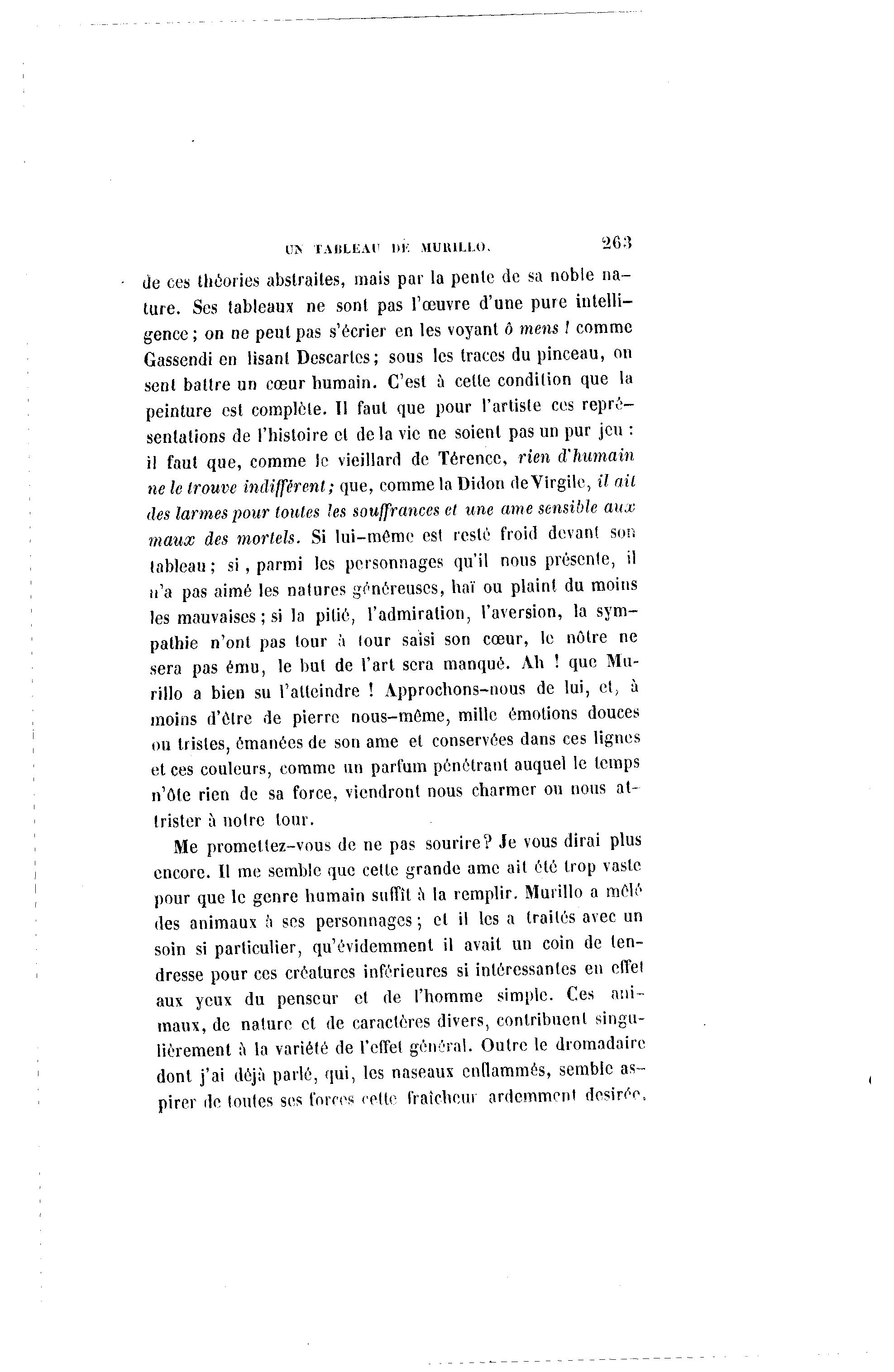 HA TABLEAl' 1)1'. UUIULLO. 263 de ces théories abstraites, mais par la pente de sa noble na- ture. Ses tableaux ne sont pas l'œuvre d'une pure intelli- gence ; on ne peut pas s'écrier en les voyant ô mens I comme Gassendi en lisant Descaries; sous les traces du pinceau, on sent battre un cœur humain. C'est à cette condition que la peinture est complote. Il faut que pour l'artiste ces repré- sentations de l'histoire et delà vie ne soient pas un pur jeu : il faut que, comme le vieillard de Térencc, rien d'humain ne le trouve indifférent; que, comme la Didon de Virgile, il ail des larmes pour toutes les souffrances et une ame sensible aux maux des mortels. Si lui-même est resté froid devant son tableau ; si , parmi les personnages qu'il nous présente, il n'a pas aimé les natures généreuses, haï ou plaint du moins les mauvaises ; si la pitié, l'admiration, l'aversion, la sym- pathie n'ont pas tour h (our saisi son cœur, le nôtre ne sera pas ému, le but de l'art sera manqué. Àh ! que Mu- rillo a bien su l'atteindre ! Approchons-nous de lui, et, à moins d'être de pierre nous-môme, mille émotions douces ou tristes, émanées de son ame et conservées dans ces lignes et ces couleurs, comme un parfum pénétrant auquel le temps n'ôle rien de sa force, viendront nous charmer ou nous at- trister à noire tour. Me promettez-vous de ne pas sourire? Je vous dirai plus encore. Il me semble que cette grande ame ait été trop vaste pour que le genre humain suffît a la remplir. Murillo a mêlé des animaux a ses personnages ; et il les a traités avec un soin si particulier, qu'évidemment il avait un coin de ten- dresse pour ces créatures inférieures si intéressantes en effet aux yeux du penseur et de l'homme simple. Ces ani- maux, de nature et de caractères divers, contribuent singu- lièrement à la variété de l'effet général. Outre le dromadaire dont j'ai déjà parlé, qui, les naseaux enflammés, semble as- pirer de toutes ses forces cette fraîcheur ardemment désirée,