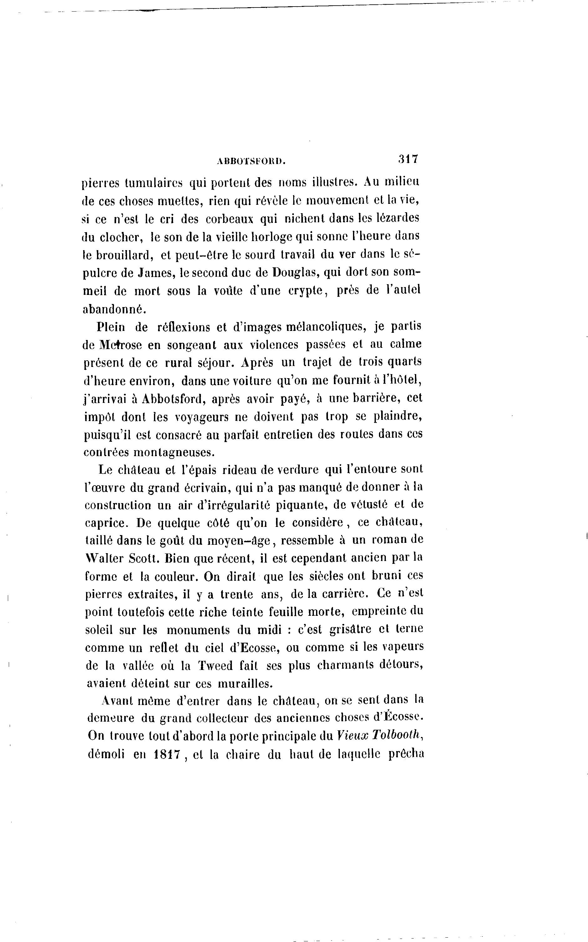 ABBOTSFOKI). 317 pierres tumulaires qui portent des noms illustres. Au milieu de ces choses muettes, rien qui révèle le mouvement el la vie, si ce n'est le cri des corbeaux qui nichent dans les lézardes du clocher, le son de la vieille horloge qui sonne l'heure dans le brouillard, et peut-être le sourd travail du ver dans le sé- pulcre de James, le second duc de Douglas, qui dort son som- meil de mort sous la voûte d'une crypte, près de l'aulel abandonné. Plein de réflexions et d'images mélancoliques, je partis de Metrose en songeant aux violences passées el au calme présent de ce rural séjour. Après un trajet de trois quarts d'heure environ, dans une voilure qu'on me fournit à l'hôtel, j'arrivai à Abbotsford, après avoir payé, à une barrière, cet impôt donl les voyageurs ne doivent pas trop se plaindre, puisqu'il est consacré au parfait entretien des routes dans ces contrées montagneuses. Le château et l'épais rideau de verdure qui l'entoure sont l'œuvre du grand écrivain, qui n'a pas manqué de donner à la construction un air d'irrégularité piquante, de vétusté el de caprice. De quelque côté qu'on le considère, ce château, taillé dans le goût du moyen-âge, ressemble à un roman de Walter Scott. Bien que récent, il est cependant ancien par la forme et la couleur. On dirait que les siècles ont bruni ces pierres extraites, il y a trente ans, de la carrière. Ce n'est point toutefois cetle riche teinte feuille morte, empreinte du soleil sur les monuments du midi : c'est grisâtre et terne comme un reflet du ciel d'Ecosse, ou comme si les vapeurs de la vallée où la Tweed fait ses plus charmants détours, avaient déteint sur ces murailles. Avant même d'entrer dans le château, on se sent dans la demeure du grand collecteur des anciennes choses d'Ecosse. On trouve tout d'abord la porte principale du Vieux Tolbooth, démoli en 1817 , el la chaire du haut de laquelle prêcha