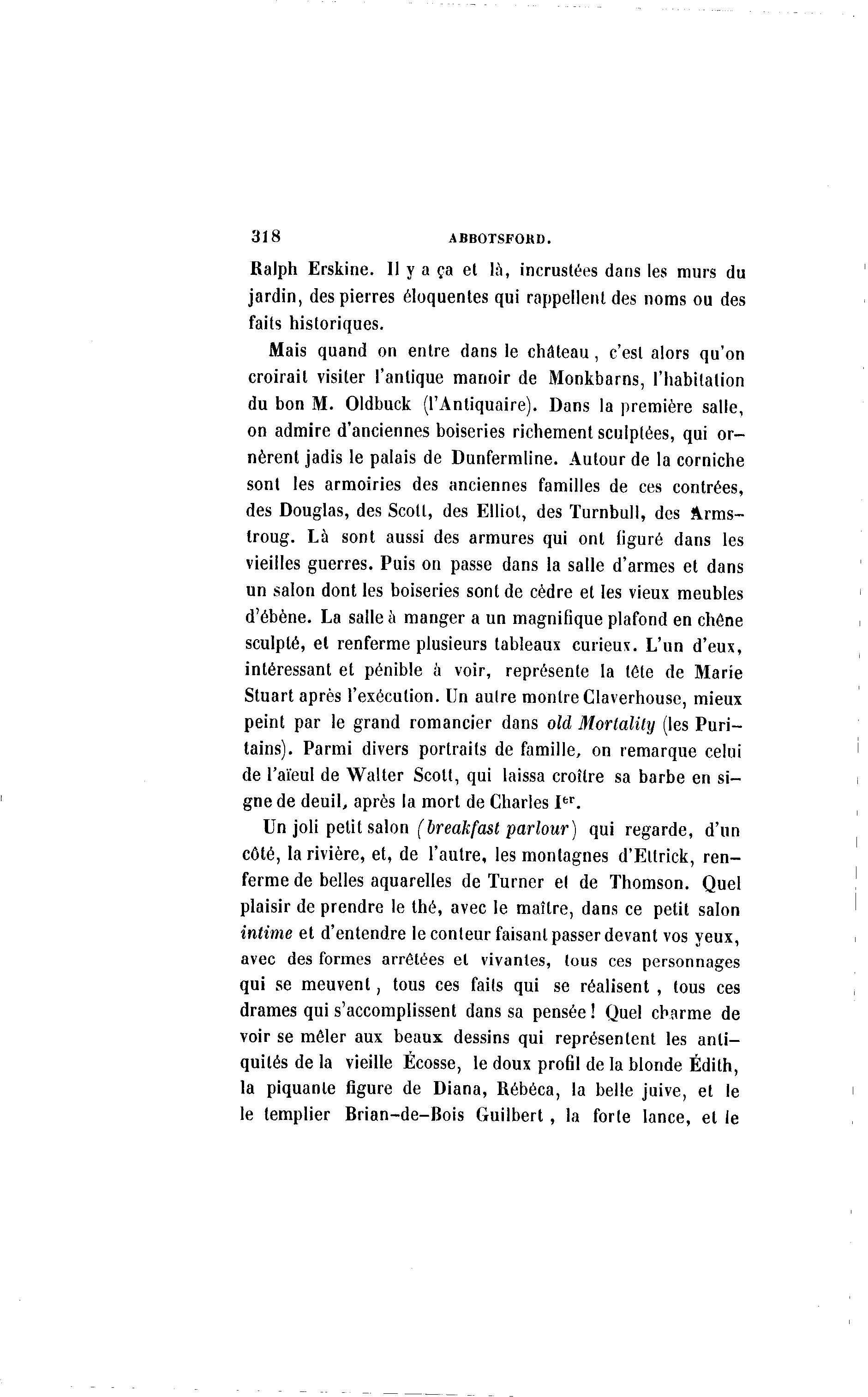 318 ABBOTSFOKD. Ralph Erskine. Il y a ça et là , incrustées dans les murs du jardin, des pierres éloquentes qui rappellent des noms ou des faits historiques. Mais quand on entre dans le château , c'est alors qu'on croirait visiter l'antique manoir de Monkbarns, l'habitation du bon M. Oldbuck (l'Antiquaire). Dans la première salle, on admire d'anciennes boiseries richement sculptées, qui or- nèrent jadis le palais de Dunfermline. Autour de la corniche sont les armoiries des anciennes familles de ces contrées, des Douglas, des Scott, des Elliol, des Turnbull, des Arms- troug. Là sont aussi des armures qui ont (iguré dans les vieilles guerres. Puis on passe dans la salle d'armes et dans un salon dont les boiseries sont de cèdre et les vieux meubles d'ébène. La salle à manger a un magnifique plafond en chêne sculpté, el renferme plusieurs tableaux curieux. L'un d'eux, intéressant et pénible à voir, représente la tète de Marie Stuart après l'exécution. Un autre montre Claverhouse, mieux peint par le grand romancier dans old Mortality (les Puri- tains). Parmi divers portraits de famille, on remarque celui de l'aïeul de Walter Scott, qui laissa croître sa barbe en si- gne de deuil, après la mort de Charles I er . Un joli petit salon (breakfast parlour) qui regarde, d'un côté, la rivière, et, de l'autre, les montagnes d'Eltrick, ren- ferme de belles aquarelles de Turner et de Thomson. Quel plaisir de prendre le thé, avec le maître, dans ce petit salon intime et d'entendre le conteur faisant passer devant vos yeux, avec des formes arrêtées el vivantes, tous ces personnages qui se meuvent, tous ces faits qui se réalisent , tous ces drames qui s'accomplissent dans sa pensée ! Quel cbarme de voir se mêler aux beaux dessins qui représentent les anti- quités de la vieille Ecosse, le doux profil de la blonde Edith, la piquante figure de Diana, Rébéca, la belle juive, et le le templier Brian-de-Bois Guilbert , la forte lance, et le