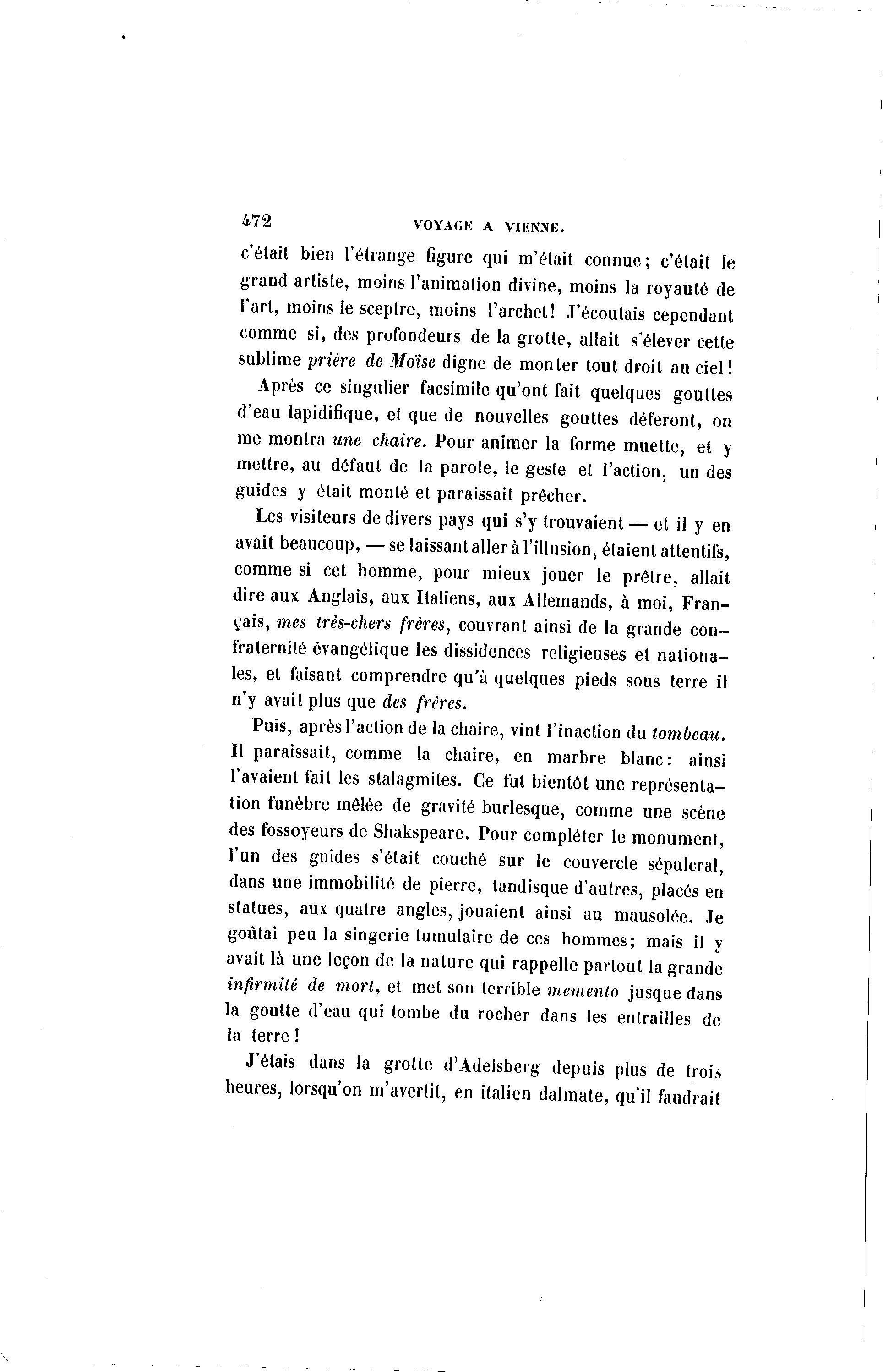 472 VOYAGE A VIENNE. c'était bien l'étrange figure qui m'était connue; c'était le grand artiste, moins l'animation divine, moins la royauté de l'art, moins le sceptre, moins l'archet! J'écoutais cependant comme si, des profondeurs de la grotte, allait s'élever cette sublime prière de Moïse digne de monter tout droit au ciel! Après ce singulier facsimile qu'ont fait quelques gouttes d'eau lapidifique, ei que de nouvelles gouttes déferont, on me montra une chaire. Pour animer la forme muette, et y mettre, au défaut de la parole, le geste et l'action, un des guides y était monté et paraissait prêcher. Les visiteurs de divers pays qui s'y trouvaient — et il y en avait beaucoup, — se laissant aller à l'illusion, étaient attentifs, comme si cet homme, pour mieux jouer le prêtre, allait dire aux Anglais, aux Italiens, aux Allemands, à moi, Fran- çais, mes très-chers frères, couvrant ainsi de la grande con- fraternité évangélique les dissidences religieuses et nationa- les, et faisant comprendre qu'à quelques pieds sous terre il n'y avait plus que des frères. Puis, après l'action de la chaire, vint l'inaction du tombeau. Il paraissait, comme la chaire, en marbre blanc: ainsi l'avaient fait les stalagmites. Ce fut bientôt une représenta- tion funèbre mêlée de gravité burlesque, comme une scène des fossoyeurs de Shakspeare. Pour compléter le monument, l'un des guides s'était couché sur le couvercle sépulcral, dans une immobilité de pierre, tandisque d'autres, placés en statues, aux quatre angles, jouaient ainsi au mausolée. Je goûtai peu la singerie tumulaire de ces hommes; mais il y avait là une leçon de la nature qui rappelle partout la grande infirmité de mort, et met son terrible mémento jusque dans la goutte d'eau qui tombe du rocher dans les entrailles de la terre ! J'étais dans la grotte d'Adelsberg depuis plus de trois heures, lorsqu'on m'avertit, en italien dalmate, qu'il faudrait
