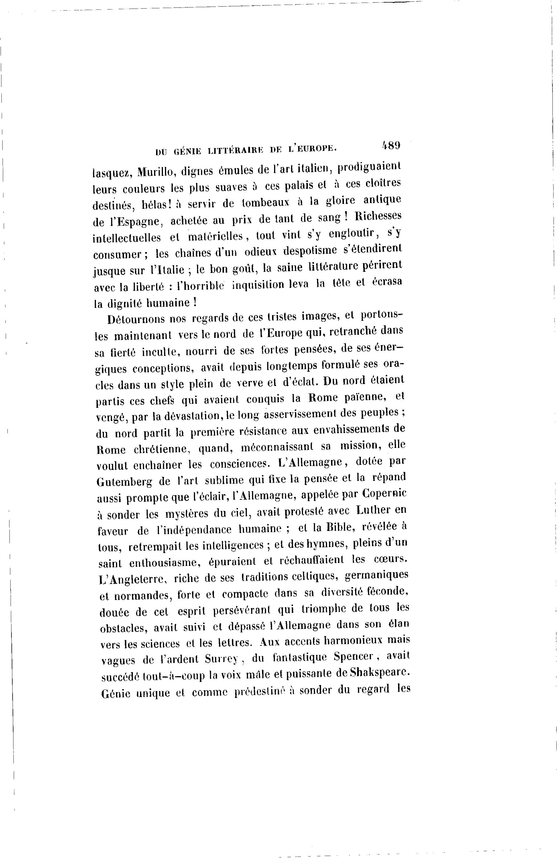DU GÉNIE LITTÉRAIRE DE L'EUROPE. 489 lasquez, Murillo, dignes émules de l'art italien, prodiguaient leurs couleurs les plus suaves à ces palais el à ces cloîtres destinés, hélas! à servir de tombeaux à la gloire antique de l'Espagne, achetée au prix de tant de sang ! Richesses intellectuelles el matérielles, tout vint s'y engloutir, s'y consumer ; les chaînes d'un odieux despotisme s'étendirent jusque sur l'Italie ; le bon goût, la saine littérature périrent avec la liberté : l'horrible inquisition leva la tête et écrasa la dignité humaine ! Détournons nos regards de ces tristes images, et portons- les maintenant vers le nord de l'Europe qui, relranché dans sa fierté inculte, nourri de ses fortes pensées, de ses éner- giques conceptions, avait depuis longtemps formulé ses ora- cles dans un style plein de verve et d'éclat. Du nord étaient partis ces chefs qui avaient conquis la Rome païenne, et vengé, par la dévastation, le long asservissement des peuples ; du nord partit la première résistance aux envahissements de Rome chrétienne, quand, méconnaissant sa mission, elle voulut enchaîner les consciences. L'Allemagne, dotée par Gutemberg de l'art sublime qui fixe la pensée et la répand aussi prompte que l'éclair, l'Allemagne, appelée par Copernic à sonder les mystères du ciel, avait protesté avec Luther en faveur de l'indépendance humaine ; et la Bible, révélée à tous, retrempait les intelligences ; et des hymnes, pleins d'un saint enthousiasme, épuraient et réchauffaient les cœurs. L'Angleterre, riche de ses traditions celtiques, germaniques et normandes, forte et compacte dans sa diversité féconde, douée de cet esprit persévérant qui triomphe de tous les obstacles, avait suivi et dépassé l'Allemagne dans son élan vers les sciences et les lettres. Aux accents harmonieux mais vagues de l'ardent Surrey , du fantastique Spencer, avait succédé tout-à -coup la voix mille el puissante deShakspeare. Génie unique et comme prédestiné à sonder du regard les