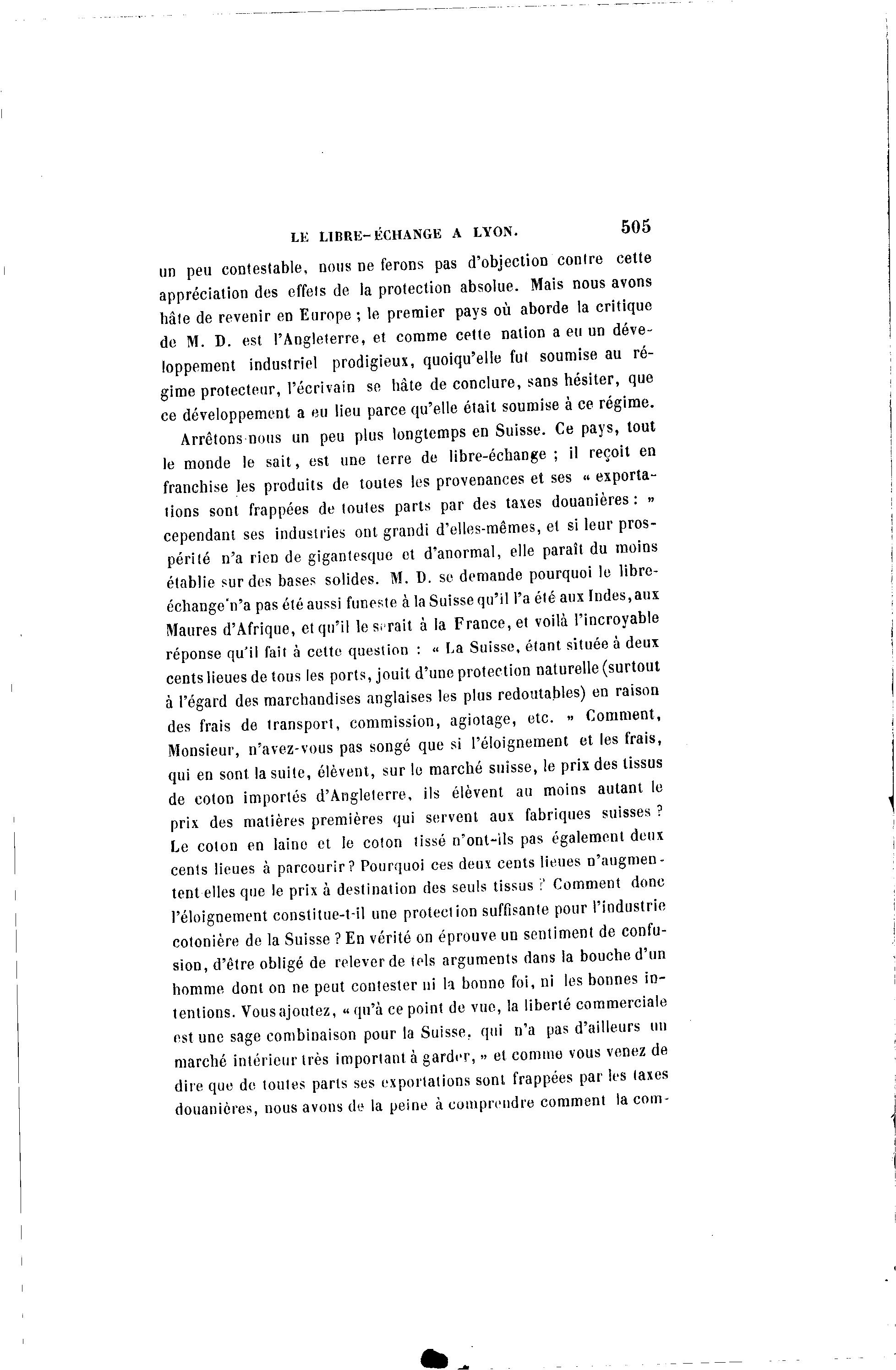 LK LIBRE-ÉCHANGE A LYON. 505 un peu contestable, nous ne ferons pas d'objection contre cette appréciation des effets de la protection absolue. Mais nous avons hâte de revenir en Europe ; le premier pays où aborde la critique de M. D. est l'Angleterre, et comme cette nation a eu un déve- loppement industriel prodigieux, quoiqu'elle fut soumise au ré- gime protecteur, l'écrivain se hâte de conclure, sans hésiter, que ce développement a eu lieu parce qu'elle était soumise à ce régime. Arrêtons nous un peu plus longtemps en Suisse. Ce pays, tout le monde le sait, est une terre de libre-échange ; il reçoit en franchise les produits de toutes les provenances et ses « exporta- tions sont frappées de toutes parts par des taxes douanières : » cependant ses industries ont grandi d'elles-mêmes, et si leur pros- périté n'a rien de gigantesque et d'anormal, elle paraît du moins établie sur des bases solides. M. D. se demande pourquoi le libro- échange'n'a pas été aussi funeste à la Suisse qu'il l'a été aux Indes,aux Maures d'Afrique, et qu'il le SiTait à la France, et voilà l'incroyable réponse qu'il fait à cette question : « La Suisse, étant située à deux cents lieues de tous les ports, jouit d'une protection naturelle (surtout à l'égard des marchandises anglaises les plus redoutables) en raison des frais de transport, commission, agiotage, etc. » Comment, Monsieur, n'avez-vous pas songé que si l'éloignement et les frais, qui en sont la suite, élèvent, sur le marché suisse, le prix des tissus de coton importés d'Angleterre, ils élèvent au moins autant le prix des matières premières qui servent aux fabriques suisses ? Le coton en laine et le coton tissé n'ont-ils pas également deux cents lieues à parcourir? Pourquoi ces deux cents lieues n'augmen- tent elles que le prix à destination des seuls tissus ':' Comment donc l'éloignement constitue-t-il une protection suffisante pour l'industrie cotonière de la Suisse ? En vérité on éprouve un sentiment de confu- sion, d'être obligé de relever de tels arguments dans la bouche d'un homme dont on ne peut contester ni la bonne foi, ni les bonnes in- tentions. Vousajoutez, «qu'à ce point de vue, la liberté commerciale est une sage combinaison pour la Suisse, qui n'a pas d'ailleurs un marché intérieur très important à garder, » et comme vous venez de dire que de toutes parts ses exportations sont frappées par les taxes douanières, nous avons de la peine à comprendre comment la coin-