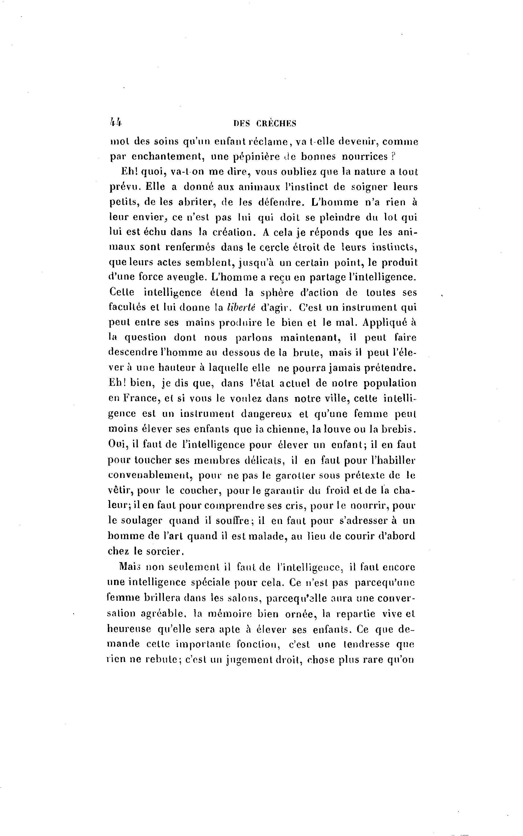 kk DES CRÈCHES mol des soins qu'un enfant réclame, va t elle devenir, comme par enchantement, une pépinière de bonnes nourrices ? Eh! quoi, va-l on me dire, vous oubliez que la nature a tout prévu. Elle a donné aux animaux l'instinct de soigner leurs petits, de les abriter, de les défendre. L'homme n'a rien à leur envier^ ce n'est pas lui qui doit se pleindre du lot qui lui est échu dans la création. A cela je réponds que les ani- maux sont renfermés dans le cercle étroit de leurs instincts, que leurs actes sembient, jusqu'à un certain point, le produit d'une force aveugle. L'homme a reçu en partage l'intelligence. Celte intelligence étend la sphère d'action de toutes ses facultés et lui donne ia liberté d'agir. C'est un instrument qui peut entre ses mains produire le bien et le mal. Appliqué à la question dont nous parlons maintenant, il peut faire descendre l'homme au dessous de la brûle, mais il peut l'éle- ver à une hauteur à laquelle elle ne pourra jamais prétendre. Eh! bien, je dis que, dans l'étal actuel de notre population en France, et si vous le voulez dans notre ville, cette intelli- gence est un instrument dangereux et qu'une femme peut moins élever ses enfants que ia chienne, la louve ou la brebis. Oui, il faut de l'intelligence pour élever un enfant; il en faut pour toucher ses membres délicats, il en faut pour l'habiller convenablement, pour ne pas le garotter sous prétexte de le vêtir, pour le coucher, pour le garantir du froid et de la cha- leur; il en faut pour comprendre ses cris, pour le nourrir, pour le soulager quand il souffre; il en faut pour s'adresser à un homme de l'art quand il est malade, au lieu de courir d'abord chez le sorcier. Mais non seulement il faut de l'intelligence, il faut encore une intelligence spéciale pour cela. Ce n'est pas pareequ'une femme brillera dans les salons, parcequ'alle aura une conver- sation agréable, la mémoire bien ornée, la repartie vive et heureuse qu'elle sera apte à élever ses enfants. Ce que de- mande celle importante fonction, c'est une tendresse que rien ne rebute; c'est un jugement droit, chose plus rare qu'on
