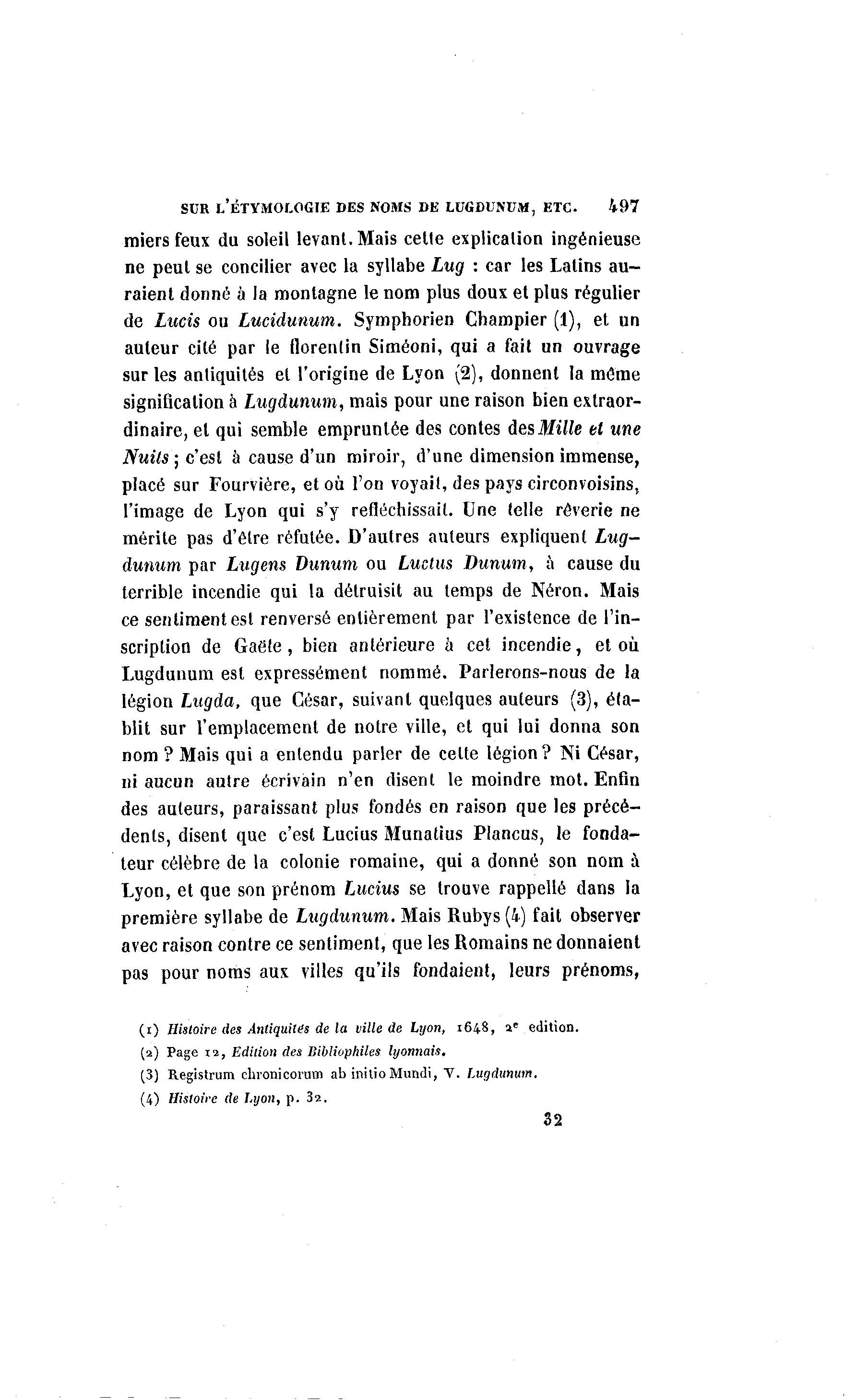 SUR L'ÉTYMOLOGIE DES NOMS DE LUGDUNUM, ETC. 497 miers feux du soleil levant. Mais cette explication ingénieuse ne peut se concilier avec la syllabe Lug : car les Latins au- raient donné à la montagne le nom plus doux et plus régulier de Lucis ou Lucidunum. Symphorien Champier (1), et un auteur cité par le florentin Siméoni, qui a fait un ouvrage sur les antiquités et l'origine de Lyon (2), donnent la même signification à Lugdunum, mais pour une raison bien extraor- dinaire, et qui semble empruntée des contes des Mille et une Nuits; c'est à cause d'un miroir, d'une dimension immense, placé sur Fourvière, et où l'on voyait, des pays circonvoisins, l'image de Lyon qui s'y refléchissait. Une telle rêverie ne mérite pas d'être réfutée. D'autres auteurs expliquent Lug- dunum par Lugens Dunum ou Luctus Dunum, à cause du terrible incendie qui la détruisit au temps de Néron. Mais ce sentiment est renversé entièrement par l'existence de l'in- scription de Gaëte, bien antérieure à cet incendie, et où Lugdunum est expressément nommé. Parlerons-nous de la légion Lugda, que César, suivant quelques auteurs (3), éta- blit sur l'emplacement de notre ville, et qui lui donna son nom ? Mais qui a entendu parler de celte légion? Ni César, ni aucun autre écrivain n'en disent le moindre mot. Enfin des auteurs, paraissant plus fondés en raison que les précé- dents, disent que c'est Lucius Munatius Plancus, le fonda- teur célèbre de la colonie romaine, qui a donné son nom à Lyon, et que son prénom Lucius se trouve rappelle dans la première syllabe de Lugdunum. Mais Rubys (4) fait observer avec raison contre ce sentiment, que les Romains ne donnaient pas pour noms aux villes qu'ils fondaient, leurs prénoms, (i) Histoire des Antiquités de la ville de Lyon, 1648, ae édition. (2) Page 12, Edition des Bibliophiles lyonnais. (3) Registrum chronicorum ab inilioMundi, V. Lugdunum. (4) Histoire de I