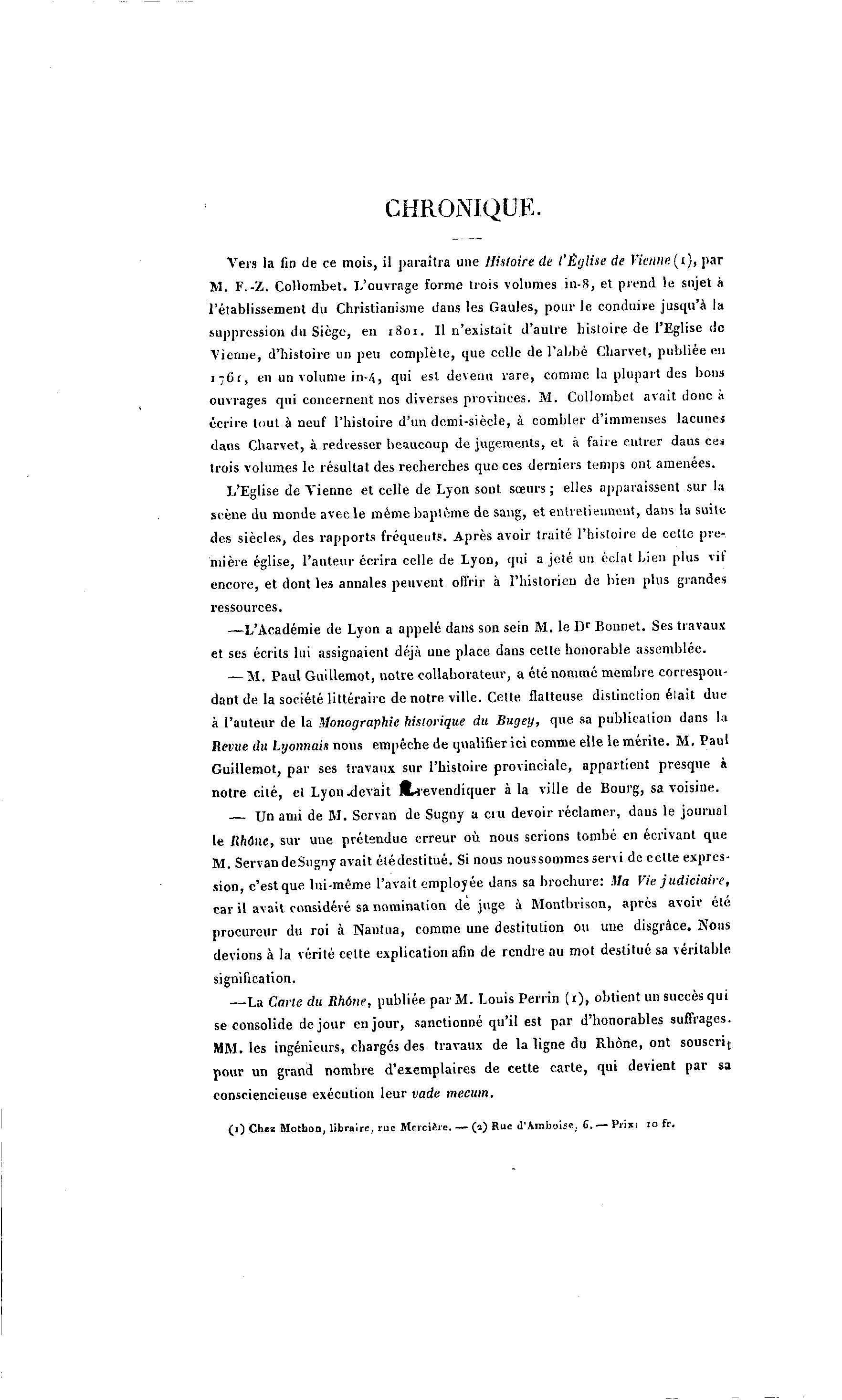CHRONIQUE. Vers la fin de ce mois, il paraîtra une Histoire de l'Église de Vienne(i), par M . F.-Z. Collombet. L'ouvrage forme trois volumes in-8, et prend le sujet à l'établissement du Christianisme dans les Gaules, pour le conduire jusqu'à la suppression du Siège, en 1801. Il n'existait d'autre histoire de l'Eglise de Vienne, d'histoire un peu complète, que celle de l'abbé Charvet, publiée eu 1 7 6 1 , en un volume in-4, qui est devenu r a r e , comme la plupart des bons ouvrages qui concernent nos diverses provinces. M . Collombet avait donc à écrire tout à neuf l'histoire d'un demi-siècle, à combler d'immenses lacunes dans Charvet, à redresser beaucoup de jugements, et à faire entrer dans ces trois volumes le résultat des recherches que ces derniers temps ont amenées. L'Eglise de Vienne et celle de Lyon sont sœurs ; elles apparaissent sur la scène du monde avec le même baptême de sang, et entretiennent, dans (a suite des siècles, des rapports fréquents. Après avoir traité l'histoire de cette pre- mière église, l'auteur écrira celle de Lyon, qui a jeté un ceint bien plus vif encore, et dont les annales peuvent offrir à l'historien de bien plus grandes ressources. —L'Académie de Lyon a appelé dans son sein M. le D r Bonnet. Ses travaux et ses écrits lui assignaient déjà une place dans cette honorable assemblée. — M. Paul Guillemot, notre collaborateur, a été nommé membre correspon- dant de la société littéraire de notre ville. Cette flatteuse distinction était due à l'auteur de la Monographie historique du Bugey, que sa publication dans la Revue du Lyonnais nous empêche de qualifier ici comme elle le mérite. M . Paul Guillemot, par ses travaux sur l'histoire provinciale, appartient presque à notre cité, et Lyon .devait HUevendiquer à la ville de Bourg, sa voisine. — Un ami de M . Servan de Suguy a cru devoir réclamer, dans le journal le Rhône, sur une prétendue erreur où nous serions tombé en écrivant que M . Servan deSugny avait été destitué. Si nous nous sommes servi de cette expres- sion, c'est que lui-même l'avait employée dans sa brochure: Ma Vie judiciaire, car il avait considéré sa nomination de juge à Montbrison, après avoir été procureur du roi à Nantua, comme une destitution ou une disgrâce. Nous devions à la vérité celte explication afin de rendre au mot destitué sa véritable signification. — L a Carte du Rhône, publiée par M . Louis Perrin ( 1), obtient un succès qui se consolide de jour en jour, sanctionné qu'il est par d'honorables suffrages. MM. les ingénieurs, chargés des travaux de la ligne du Rhône, ont souscrit pour un grand nombre d'exemplaires de cette carie, qui devient par sa consciencieuse exécution leur vade mecum. (1) Chez Mothon, libraire, rue Mercière. — (a) Rue d'Amboise. 6.-— Prix! ro fr.