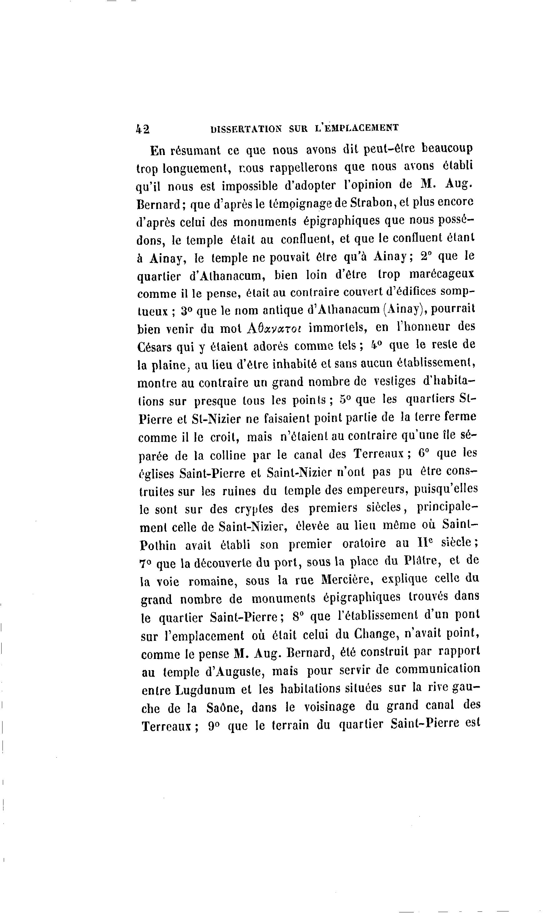 42 DISSERTATION SUR L'EMPLACEMENT En résumant ce que nous avons dit peut-être beaucoup trop longuement, nous rappellerons que nous avons établi qu'il nous est impossible d'adopter l'opinion de M. Aug. Bernard ; que d'après le témoignage de Strabon, et plus encore d'après celui des monuments épigraphiques que nous possé- dons, le temple était au confluent, et que le confluent étant à Ainay, le temple ne pouvait être qu'à Ainay; 2° que le quartier d'Alhanacum, bien loin d'être trop marécageux comme il le pense, était au contraire couvert d'édifices somp- tueux ; 3° que le nom antique d'Alhanacum (Ainay), pourrait bien venir du mot AOxvxroi immortels, en l'honneur des Césars qui y étaient adorés comme tels ; 4-° que le reste de la plaine, au lieu d'être inhabité et sans aucun établissement, montre au contraire un grand nombre de vestiges d'habita- tions sur presque tous les points; 5° que les quartiers Si- Pierre et St-Nizier ne faisaient point partie de la terre ferme comme il le croit, mais n'étaient au contraire qu'une île sé- parée de la colline par le canal des Terreaux ; 6° que les églises Saint-Pierre et Saint-Nizier n'ont pas pu être cons- truites sur les ruines du temple des empereurs, puisqu'elles le sont sur des cryples des premiers siècles, principale- ment celle de Saint-Nizier, élevée au lieu même où Saint- Pothin avait établi son premier oratoire au II e siècle ; 7° que la découverte du port, sous la place du Plâtre, et de la voie romaine, sous la rue Mercière, explique celle du grand nombre de monuments épigraphiques trouvés dans le quartier Saint-Pierre; 8° que l'établissement d'un pont sur l'emplacement où était celui du Change, n'avait point, comme le pense M. Aug. Bernard, été construit par rapport au temple d'Auguste, mais pour servir de communication entre Lugdunum et les habitations situées sur la rive gau- che de la Saône, dans le voisinage du grand canal des Terreaux ; 9° que le terrain du quartier Saint-Pierre est