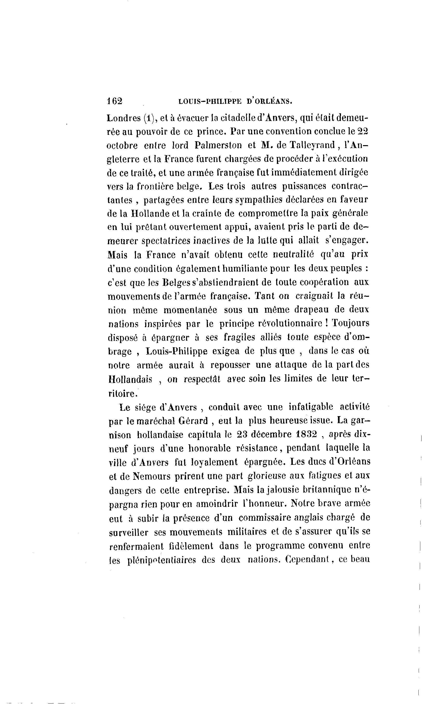 162 LOUIS-PHILIPPE D'ORLÉANS. Londres (1), et à évacuer la citadelle d'Anvers, qui était demeu- rée au pouvoir de ce prince. Par une convention conclue le 22 octobre entre lord Palmerston et M. de Talleyrand , l'An- gleterre et la France furent chargées de procéder à l'exécution de ce traité, et une armée française fut immédiatement dirigée vers la frontière belge. Les trois autres puissances contrac- tantes , partagées entre leurs sympathies déclarées en faveur de la Hollande et la crainte de compromettre la paix générale en lui prêtant ouvertement appui, avaient pris le parti de de- meurer spectatrices inaclives de la lutte qui allait s'engager. Mais la France n'avait obtenu cette neutralité qu'au prix d'une condition également humiliante pour les deux peuples : c'est que les Belges s'abstiendraient de toute coopération aux mouvements de l'armée française. Tant on craignait la réu- nion môme momentanée sous un même drapeau de deux nations inspirées par le principe révolutionnaire ! Toujours disposé à épargner à ses fragiles alliés toute espèce d'om- brage , Louis-Philippe exigea de plus que , dans le cas où notre armée aurait à repousser une attaque de la part des Hollandais , on respectât avec soin les limites de leur ter- ritoire. Le siège d'Anvers , conduit avec une infatigable activité par le maréchal Gérard , eut la plus heureuse issue. La gar- nison hollandaise capitula le 23 décembre 1832 , après dix- neuf jours d'une honorable résistance, pendant laquelle la ville d'Anvers fut loyalement épargnée. Les ducs d'Orléans et de Nemours prirent une part glorieuse aux fatigues et aux dangers de cette entreprise. Mais la jalousie britannique n'é- pargna rien pour en amoindrir l'honneur. Notre brave armée eut à subir la présence d'un commissaire anglais chargé de surveiller ses mouvements militaires et de s'assurer qu'ils se renfermaient fidèlement dans le programme convenu entre les plénipotentiaires des deux nations. Cependant, ce beau
