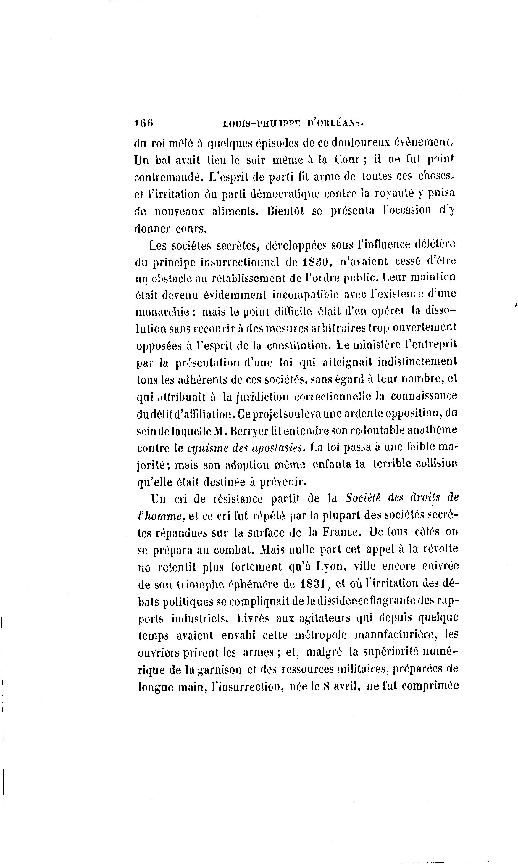 166 LOUIS-PHILIPPE D'ORLÉANS. du roi mêlé à quelques épisodes de ce douloureux événement. Un bal avait lieu le soir môme à la Cour ; il ne fut point conlremandé. L'esprit de parti fil arme de toutes ces choses, et l'irritation du parti démocratique contre la royauté y puisa de nouveaux aliments. Bientôt se présenta l'occasion d'y donner cours. Les sociétés secrètes, développées sous l'influence délétère du principe insurrectionnel de 1830, n'avaient cessé d'être un obstacle au rétablissement de l'ordre public. Leur maintien était devenu évidemment incompatible avec l'existence d'une monarchie ; mais le point difficile était d'en opérer la disso- lution sans recourir à des mesures arbitraires trop ouvertement opposées à l'esprit de la constitution. Le ministère l'entreprit par la présentation d'une loi qui atteignait indistinctement tous les adhérents de ces sociétés, sans égard à leur nombre, et qui attribuait à la juridiction correctionnelle la connaissance dudélitd'affiliation. Ceprojetsouleva une ardente opposition, du sein de laquelle M. Berryer ht en tendre son redoutable analhéme contre le cynisme des apostasies. La loi passa à une faible ma- jorité; mais son adoption même enfanta la terrible collision qu'elle était destinée à prévenir. Un cri de résistance partit de la Société des droits de l'homme, et ce cri fut répété par la plupart des sociétés secrè- tes répandues sur la surface de la France. De tous côtés on se prépara au combat. Mais nulle part cet appel à la révolte ne retentit plus fortement qu'à Lyon, ville encore enivrée de son triomphe éphémère de 1831, et où l'irritation des dé- bats politiques se compliquait de ladissidenceflagrante des rap- ports industriels. Livrés aux agitateurs qui depuis quelque temps avaient envahi cette métropole manufacturière, les ouvriers prirent les armes; et, malgré la supériorité numé- rique de la garnison et des ressources militaires, préparées de longue main, l'insurrection, née le 8 avril, ne fut comprimée